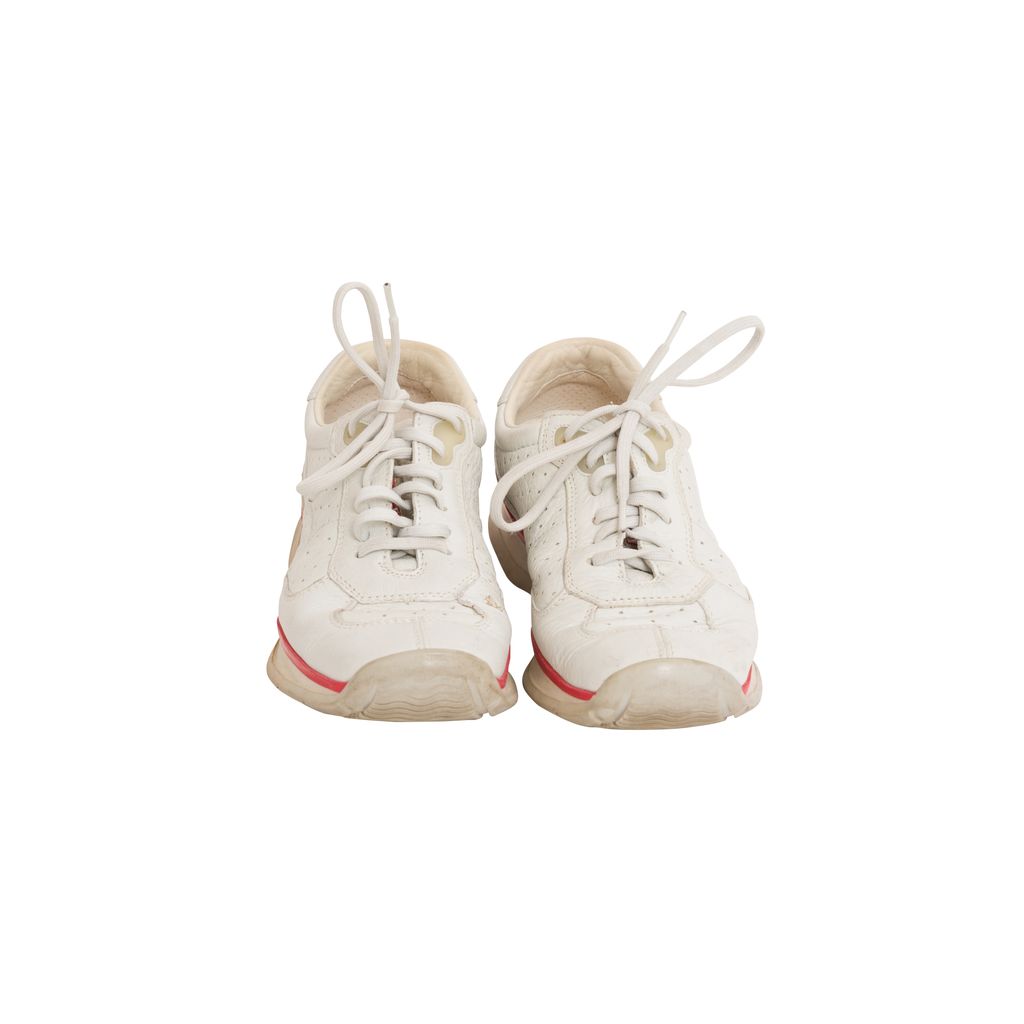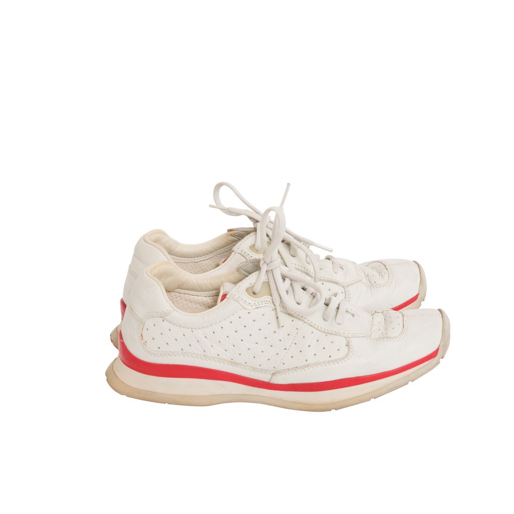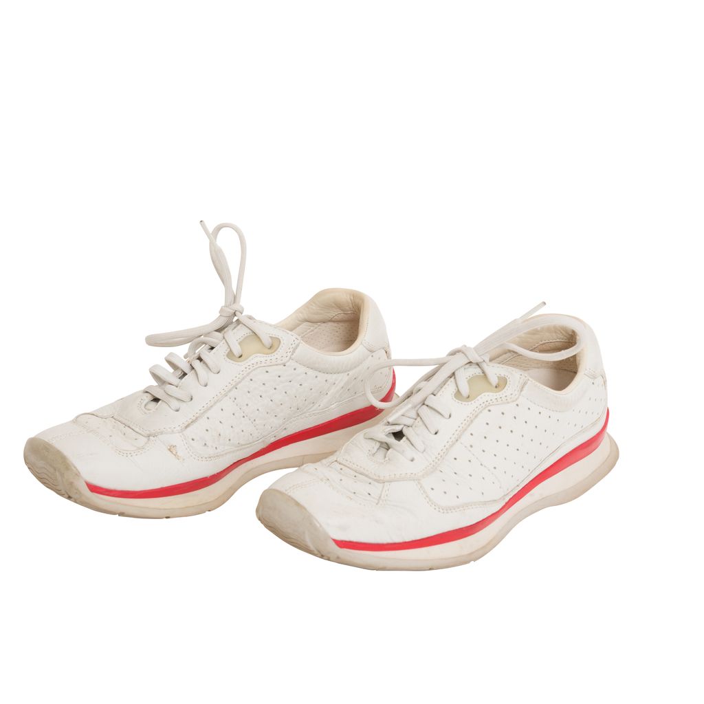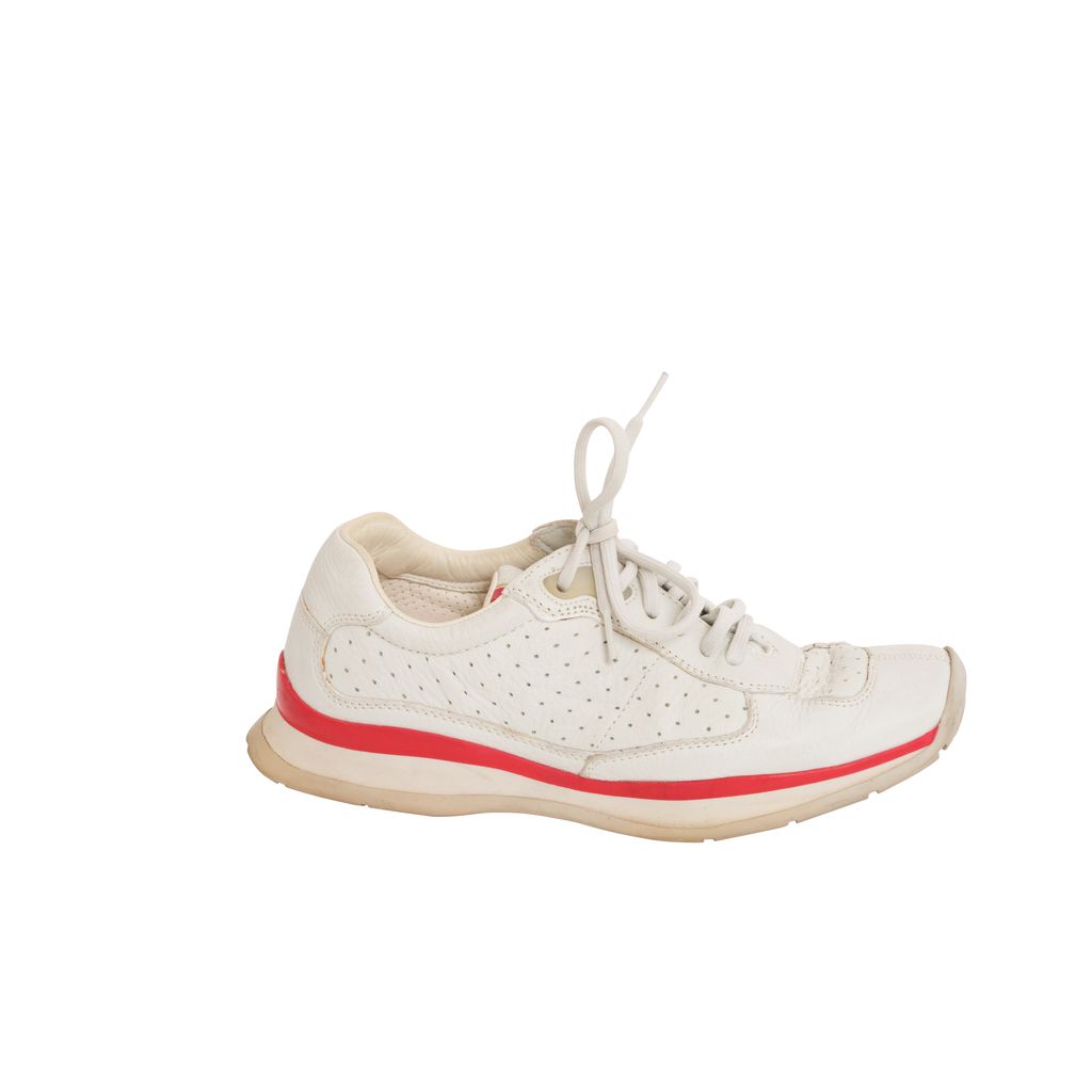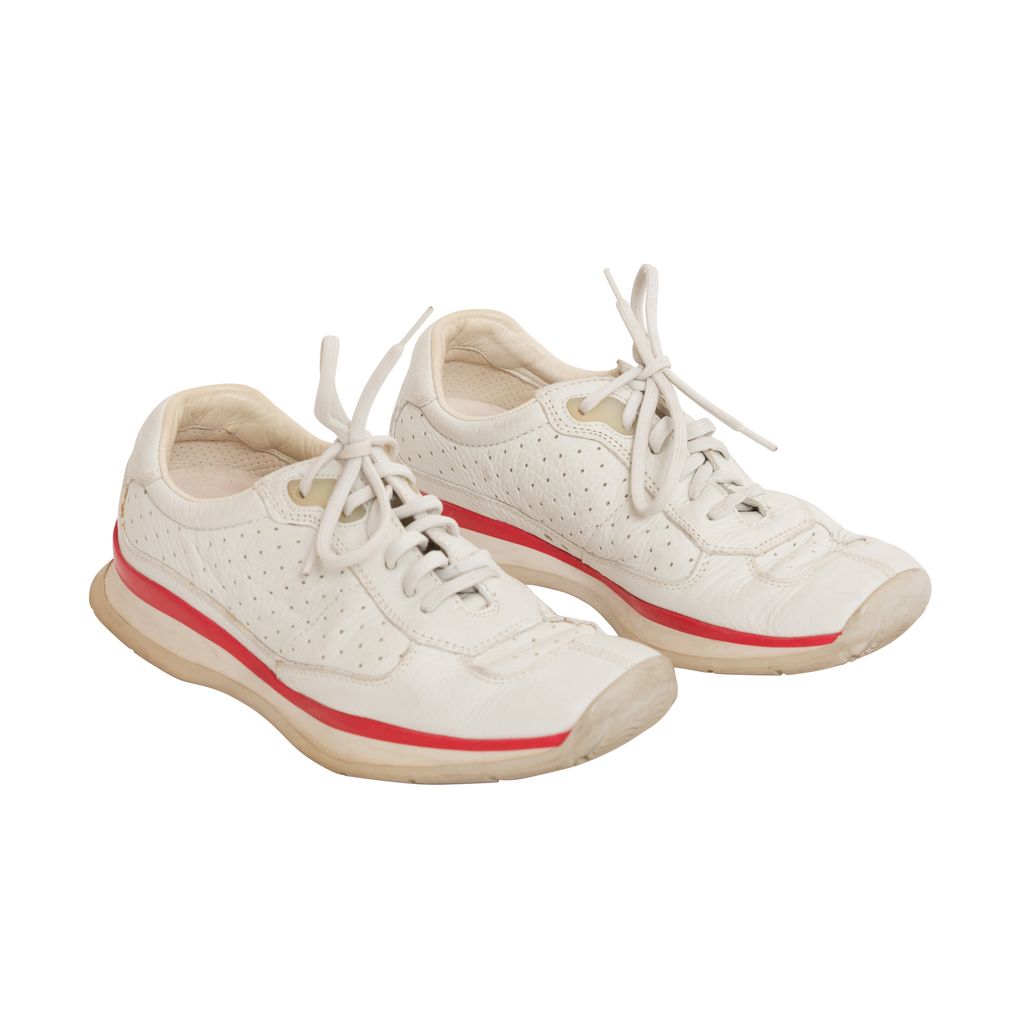 Prada Square Toe Sneakers features square toe, leather material, red lining around outsole and down tongue, moderate wear throughout.