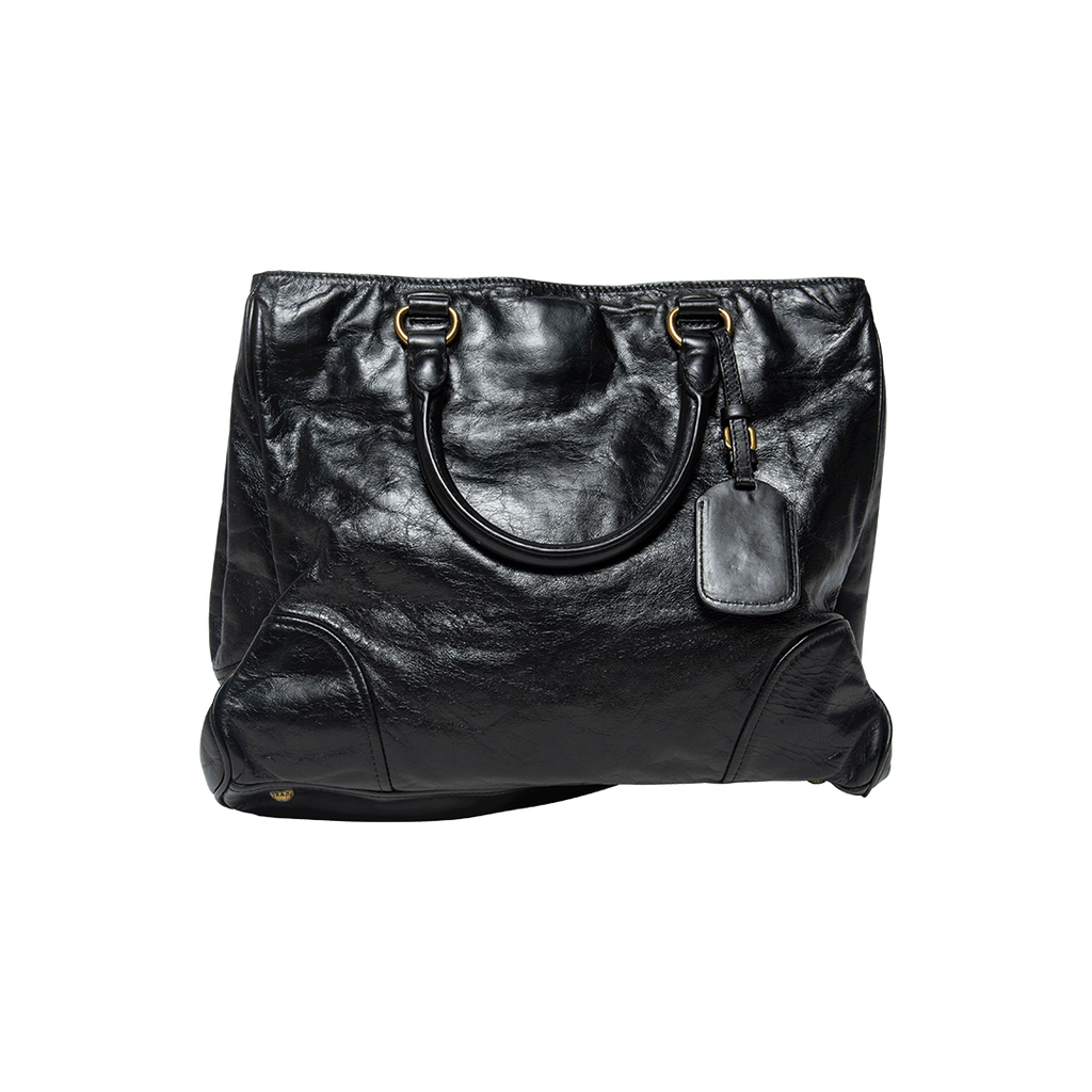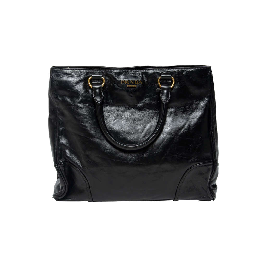 Prada Vitello Shine Leather Bag features shoulder handle and top snap closure. Condition: Good with minor wear and missing branded hardware on the front.