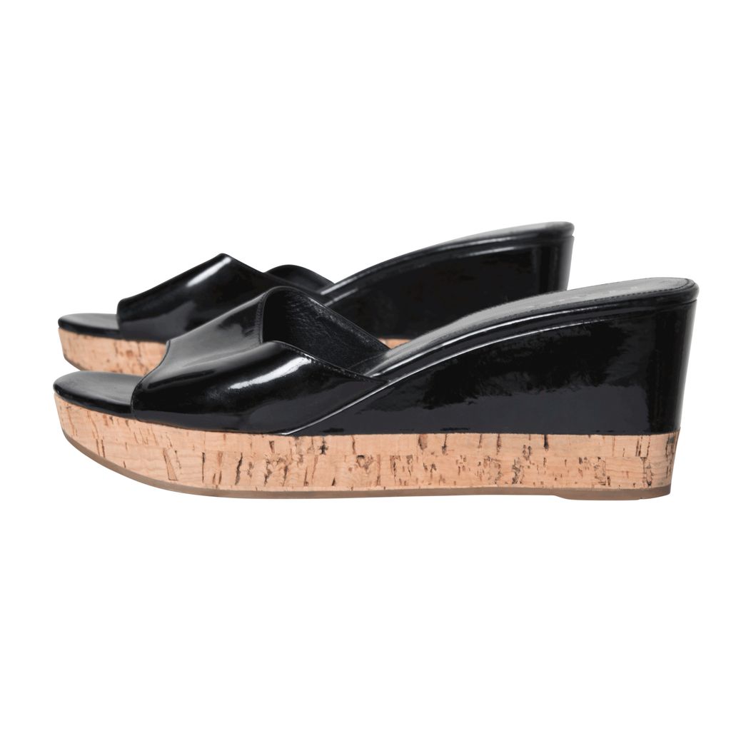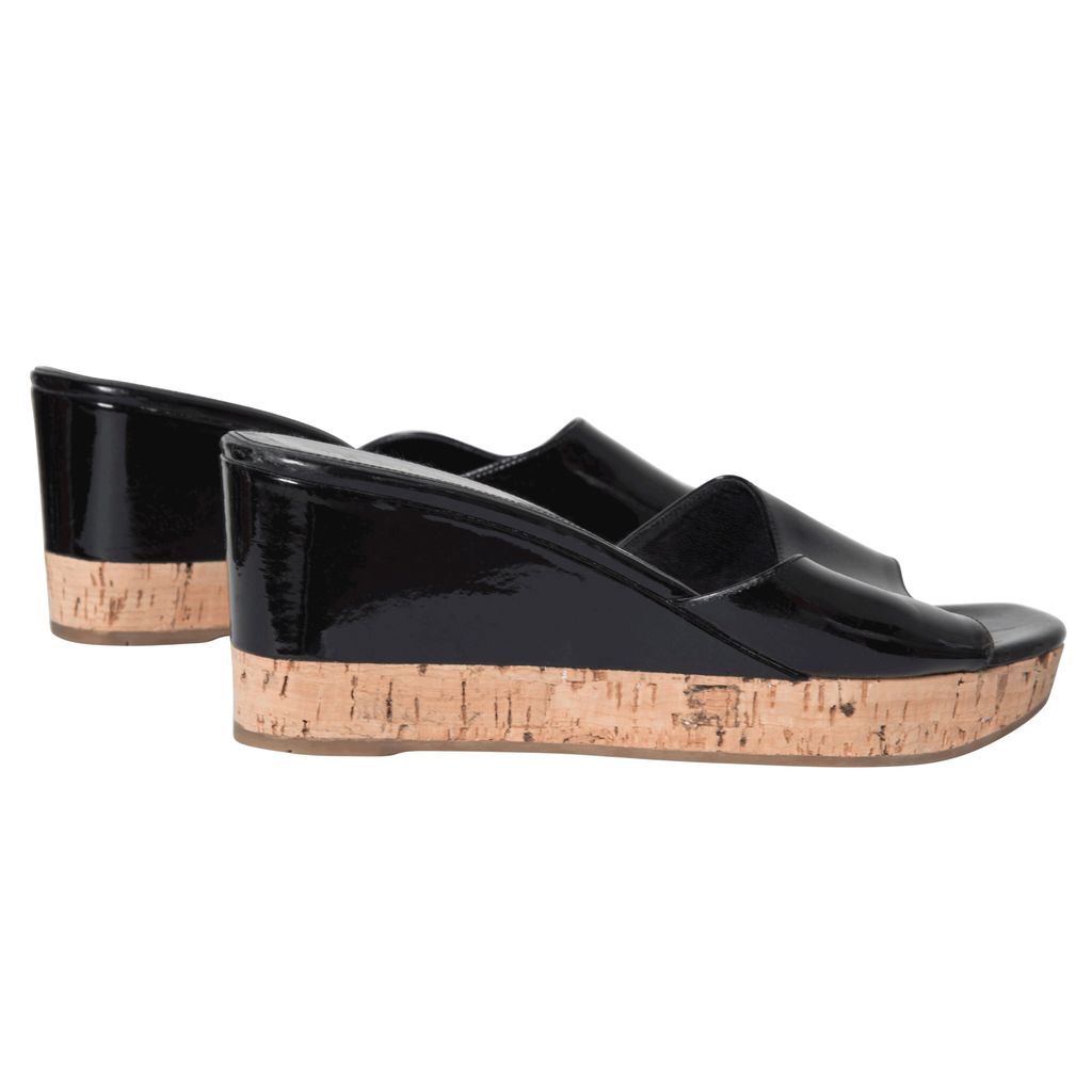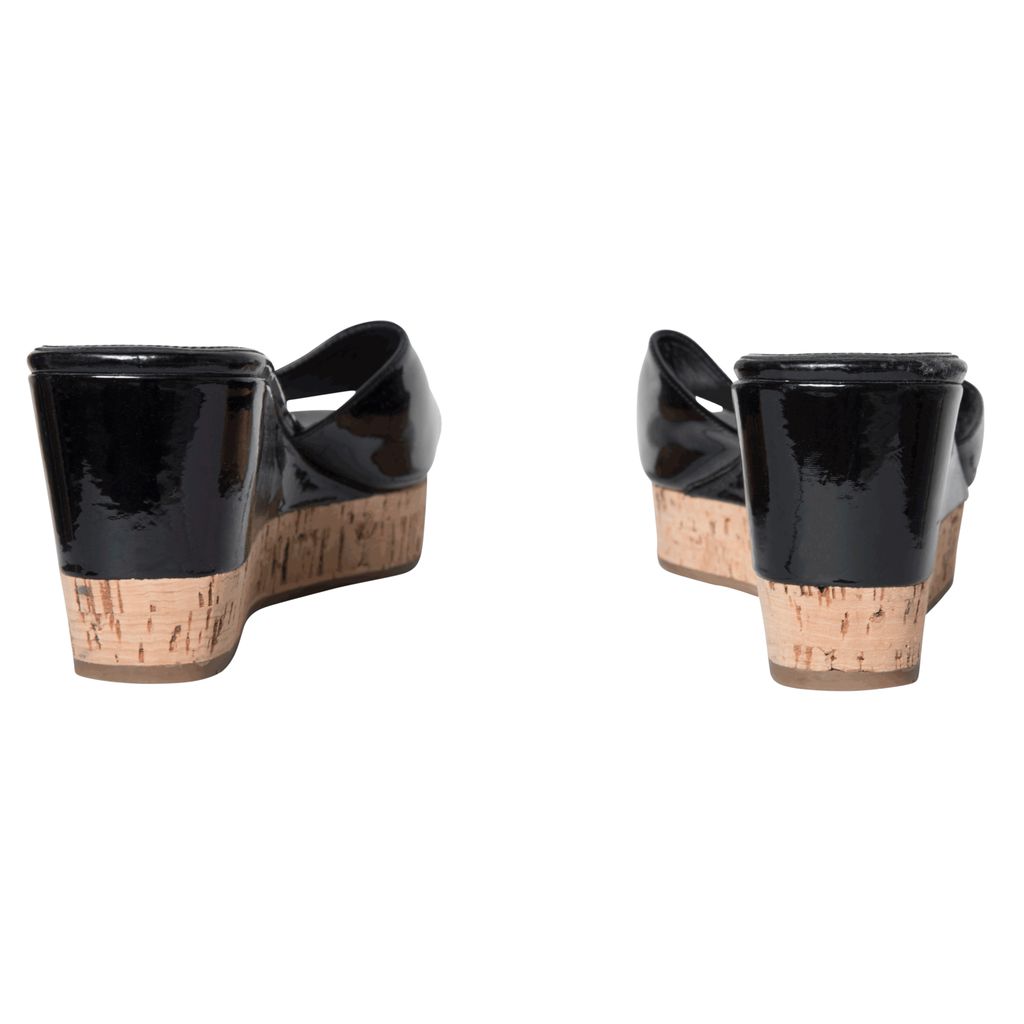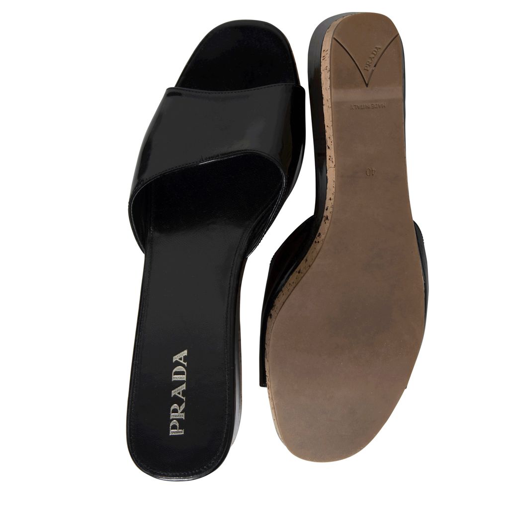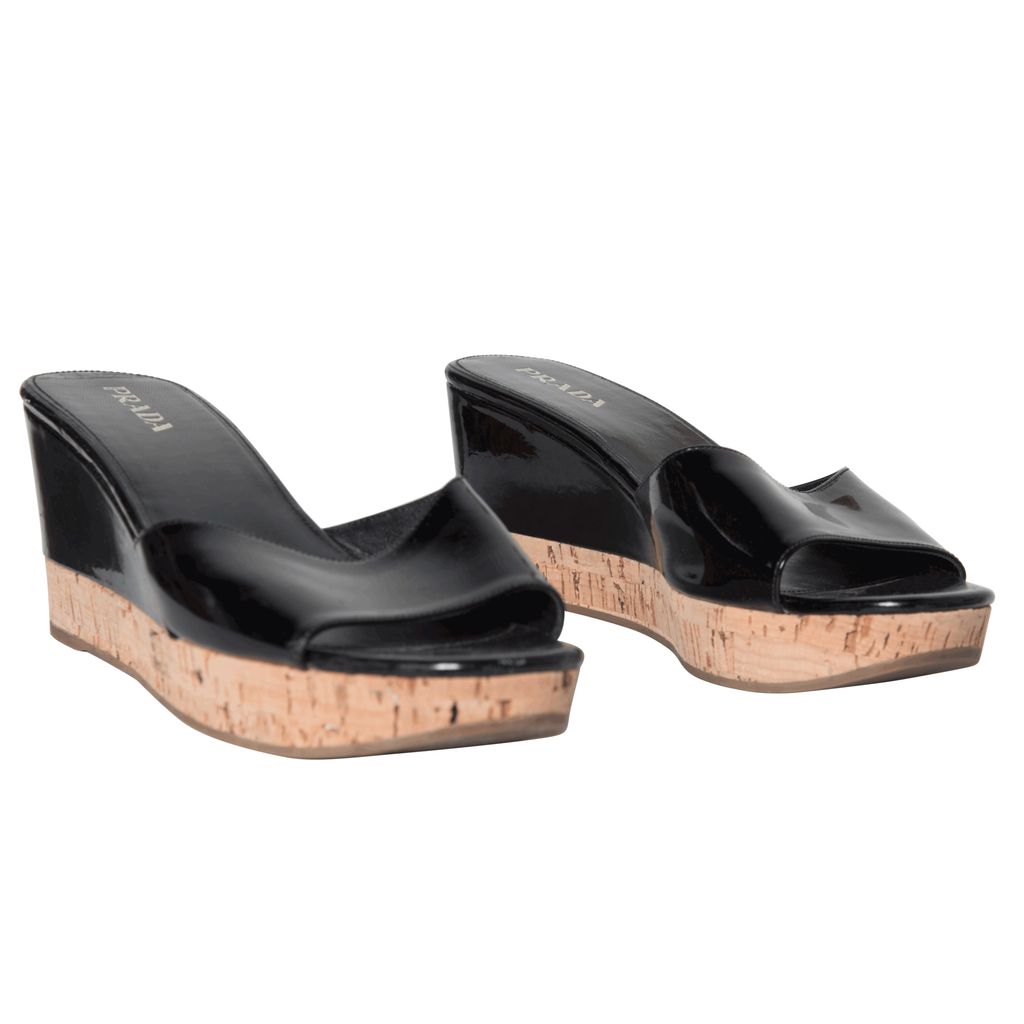 Prada wedges feature a classic black leather coloring and corkscrew wedge.
