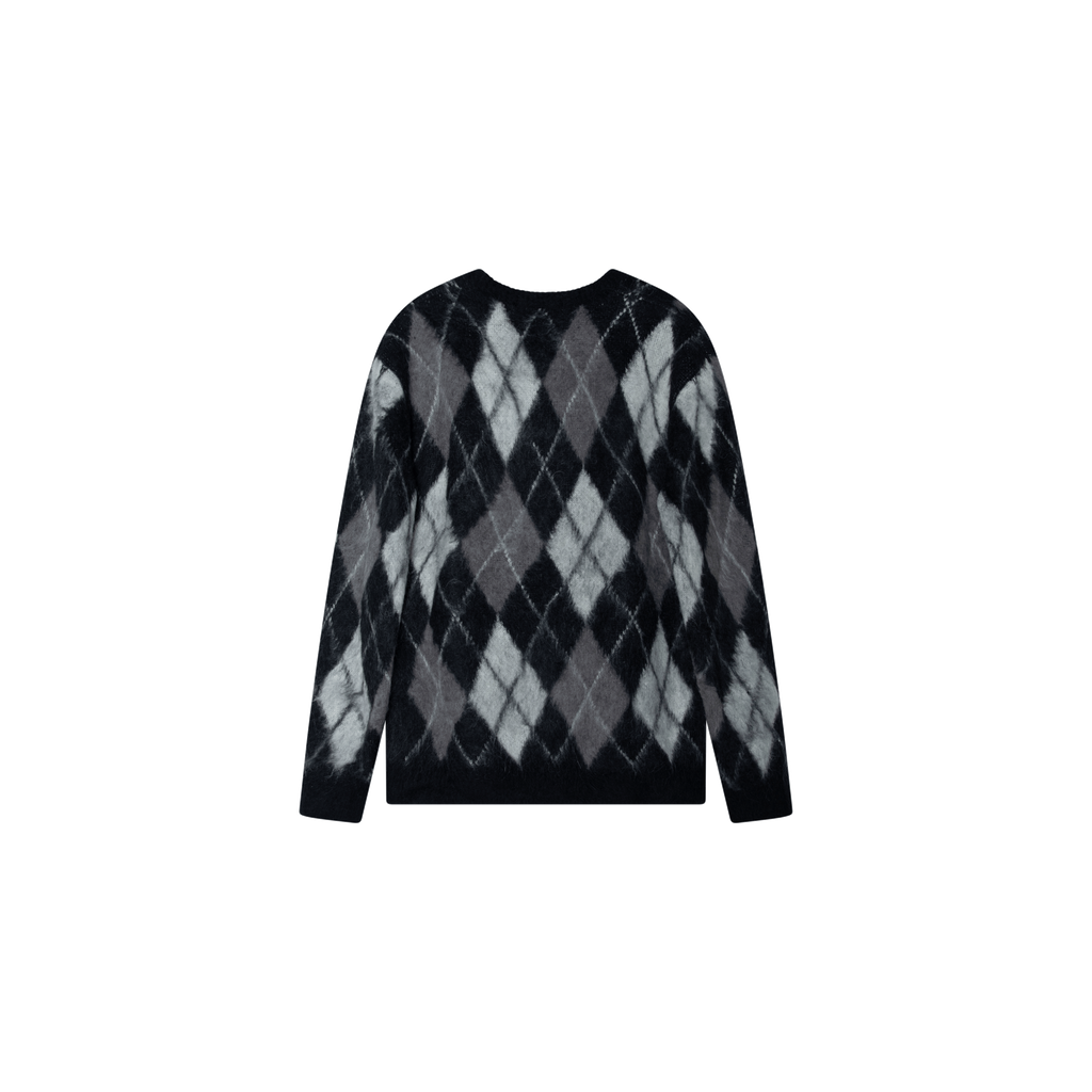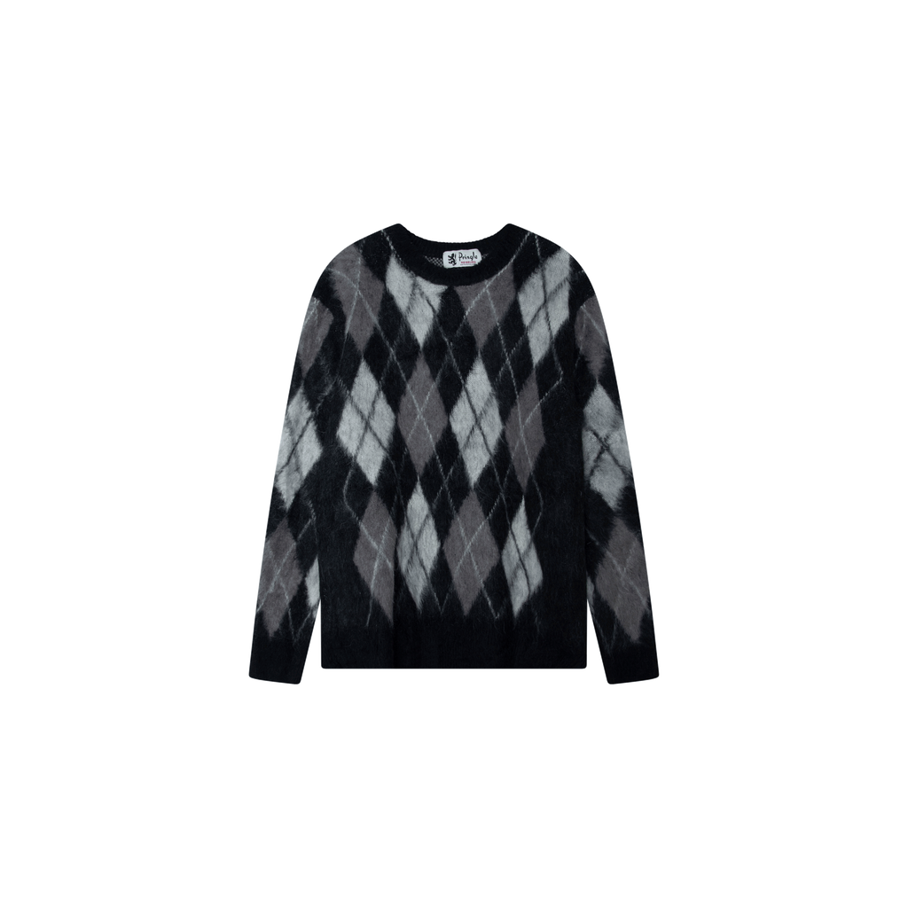Pringle of Scotland Black Argyle Sweater features round neck, long sleeves, and a diamond knit pattern.