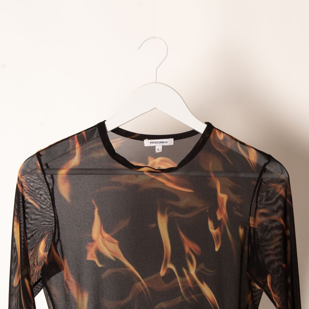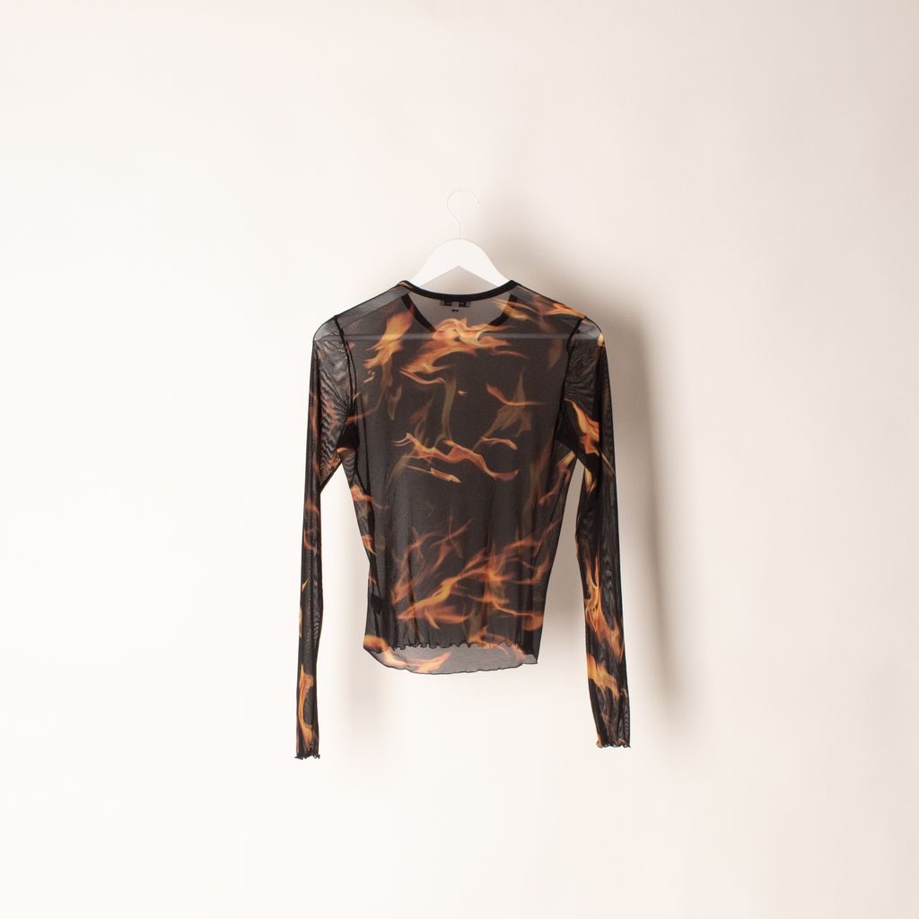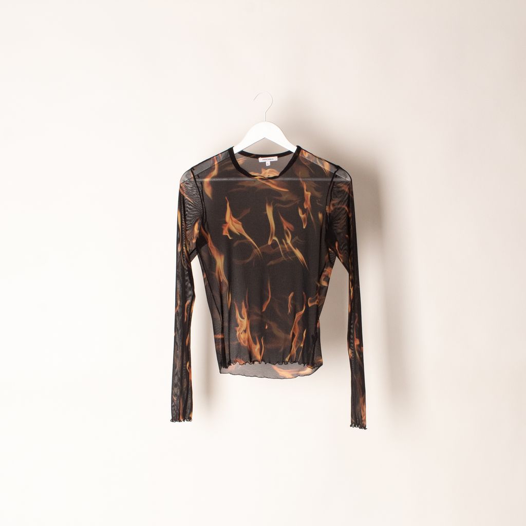 Long sleeve mesh top with ruffled marrow detail on sleeve ends and hem.