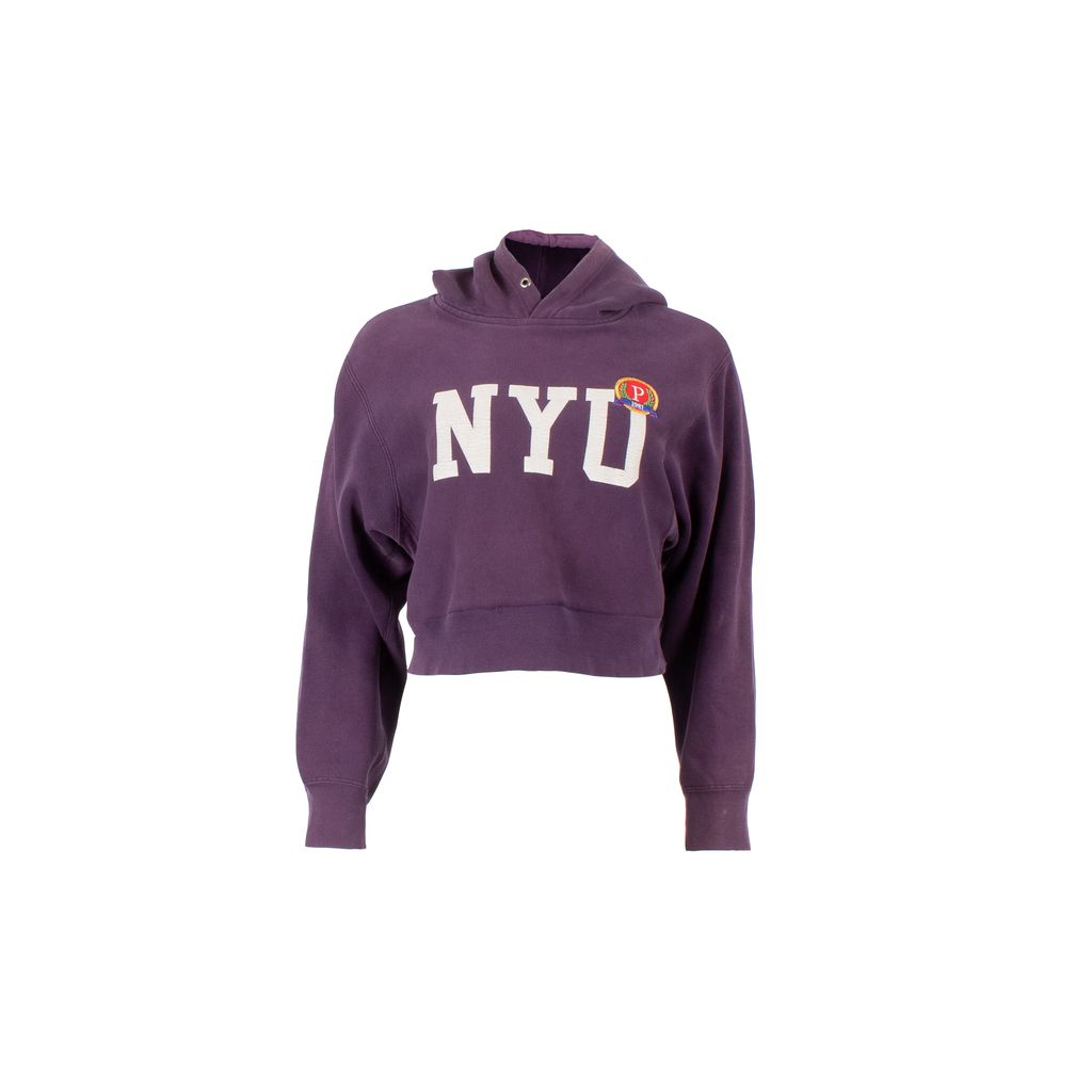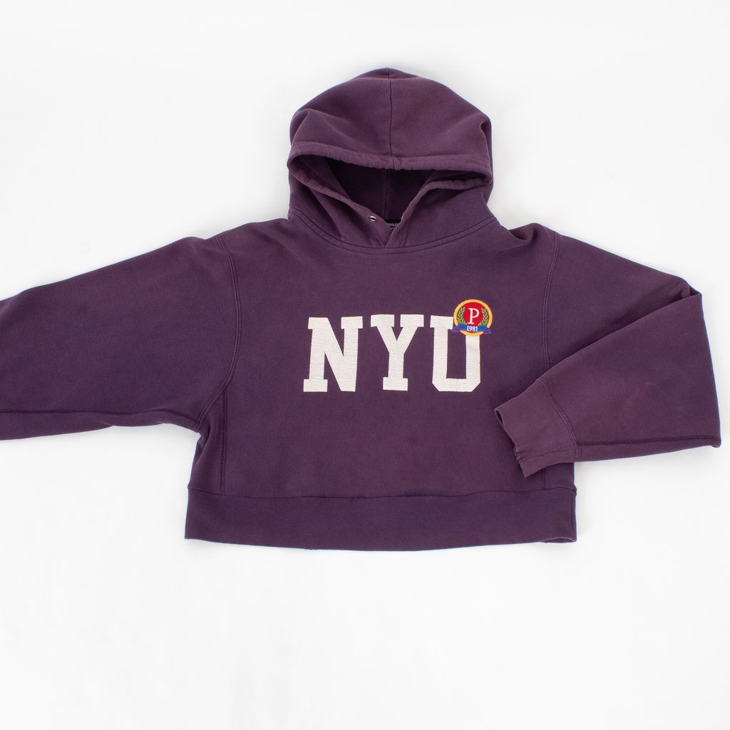 This cropped hoodie is the perfect piece for any lover of NYC who wants to keep it collegiate, casual, and cute. Features large contrast colored NYU logo on chest, Product of Privilege Clothing logo over NYU text on chest, full hood with no pull ties, and rib knit bands at waist and wrists. Sizing is not listed for this item, refer to measurements for exact fit.
