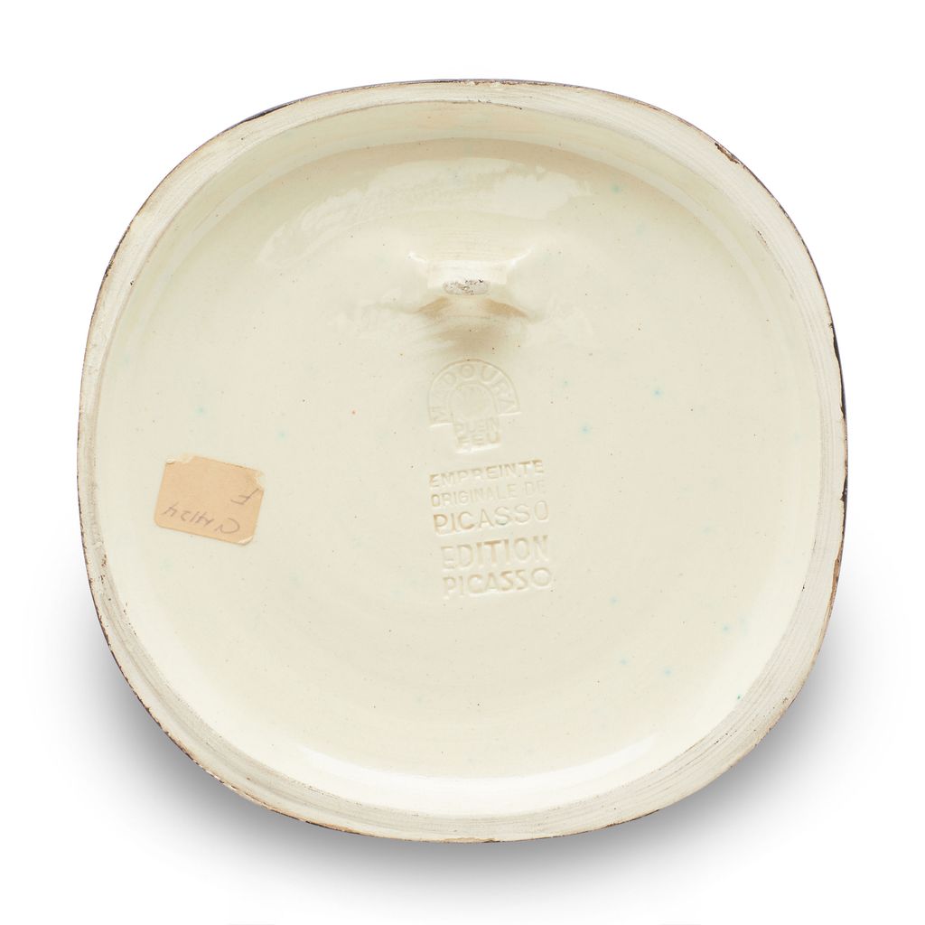 White earthenware ceramic plaque with black engobe and white glaze. Stamped 'Empreinte Originale de Picasso/Madoura Plein Feu' on the reverse.