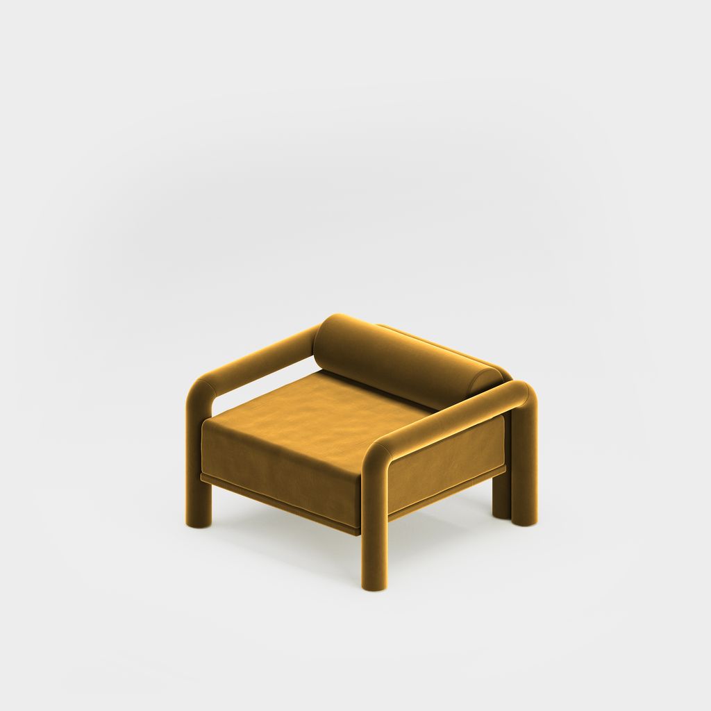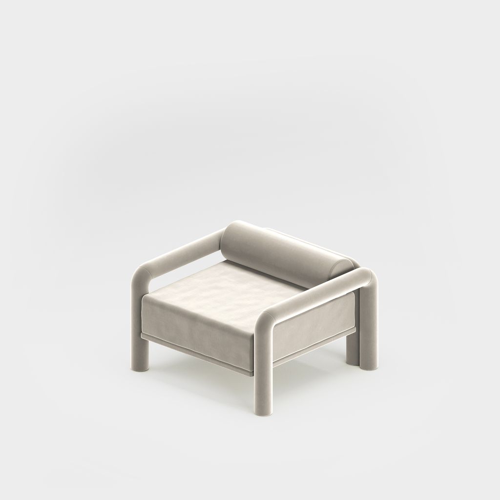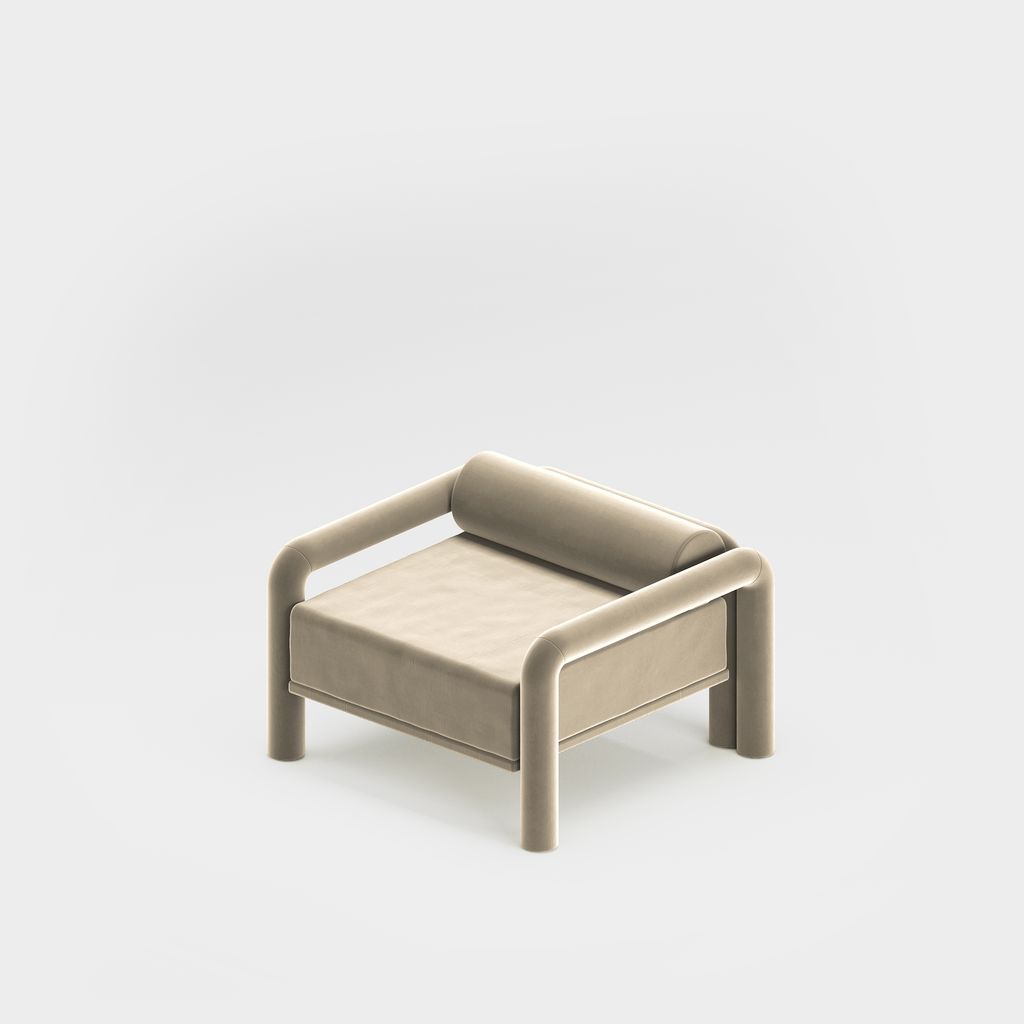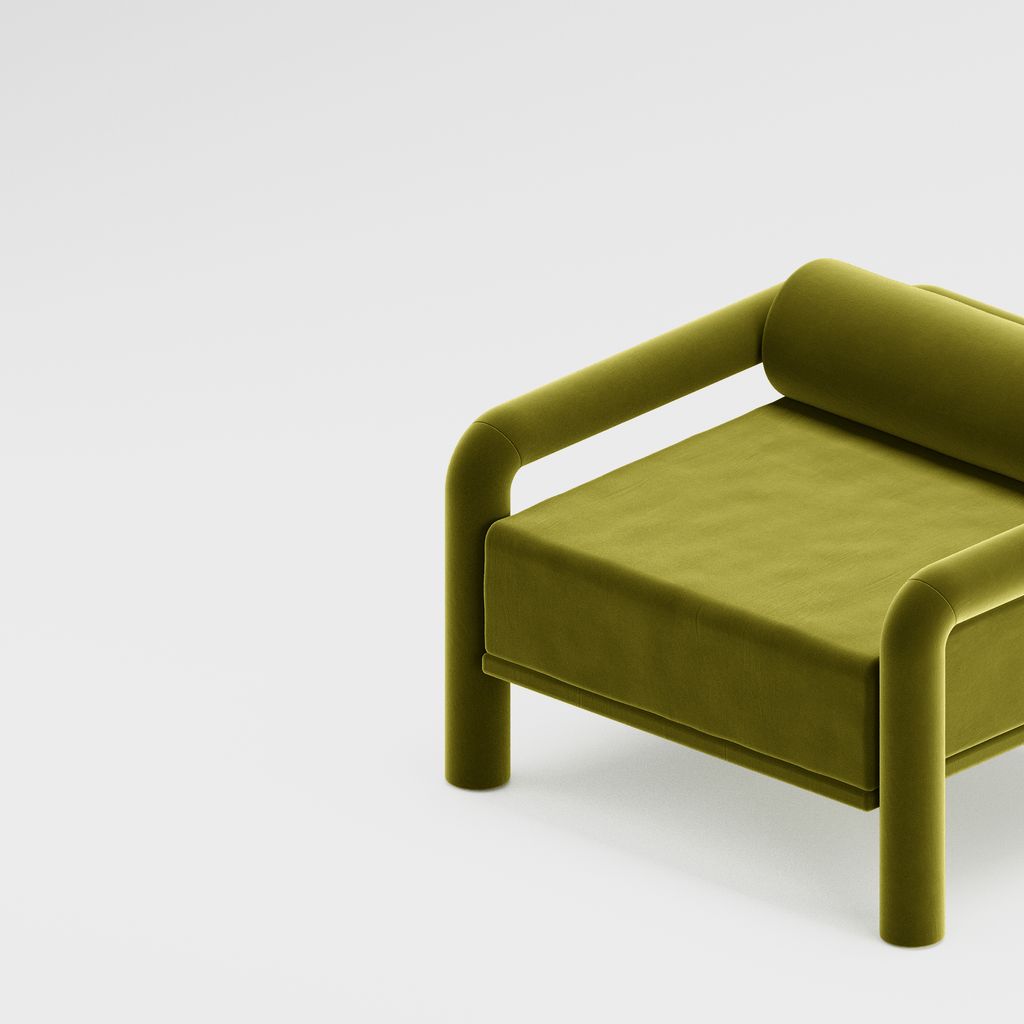The seating is placed lower than usual, closer to the floor, slowly prowling towards you to catch you in its softness. The objects are fully covered in the upholstery fabric, with all parts coming together in a cohesive silhouette, like the parts of one body.