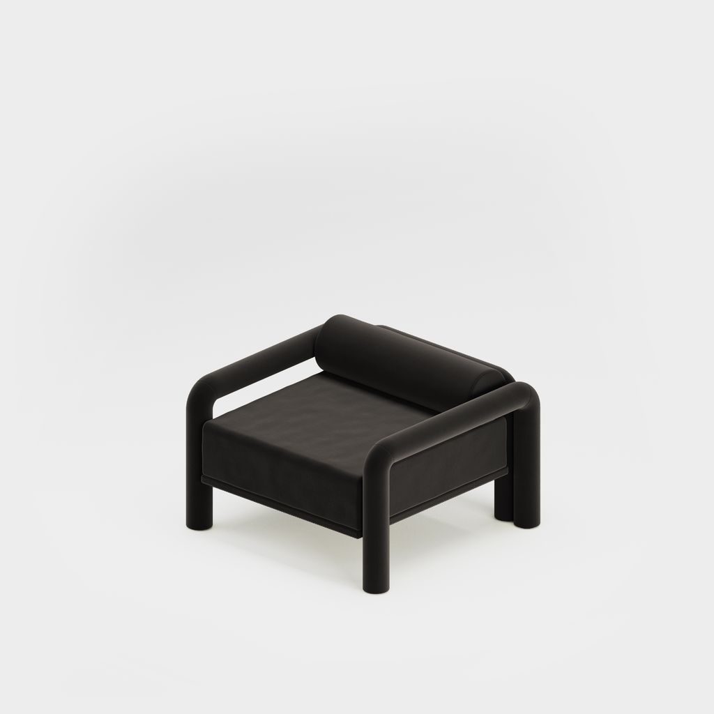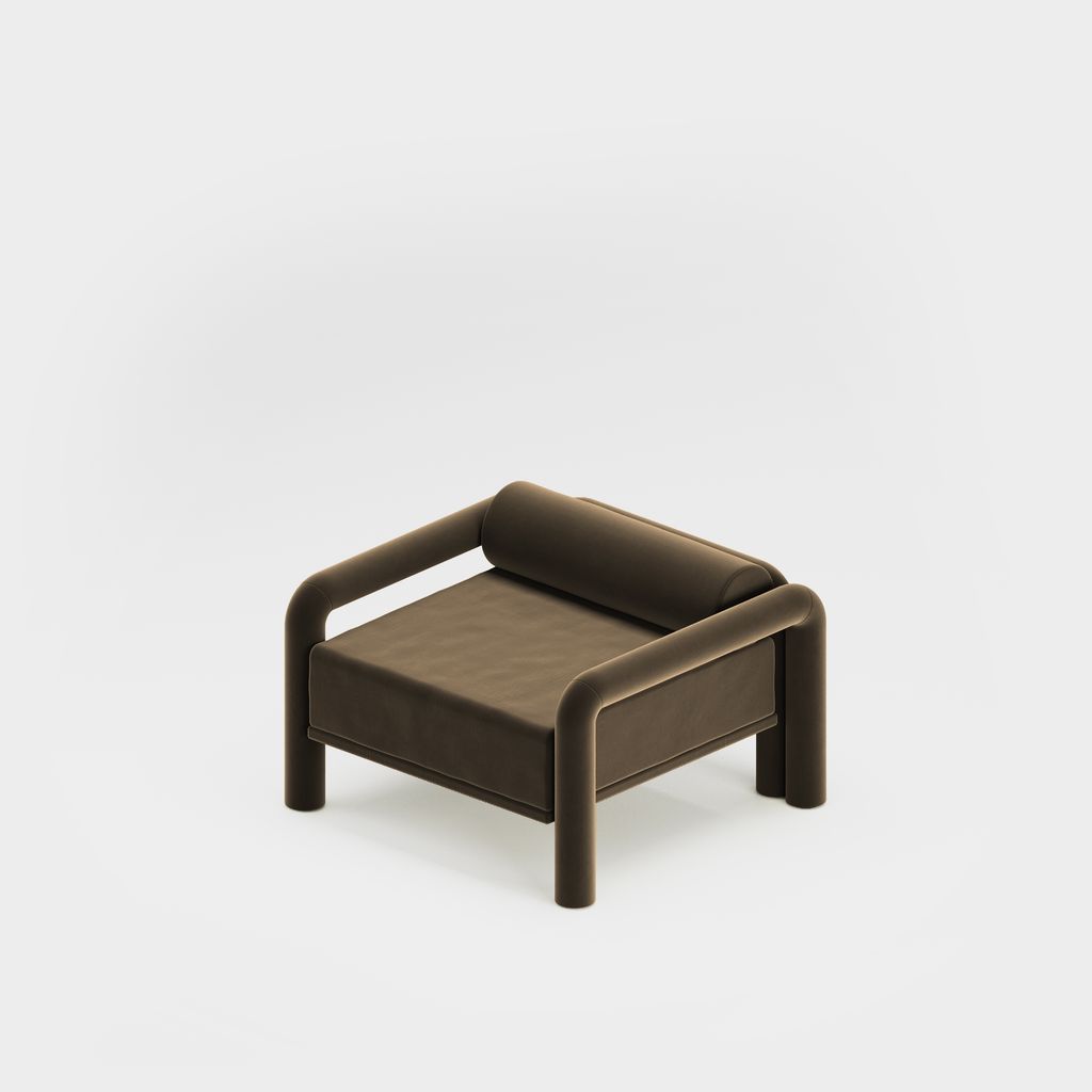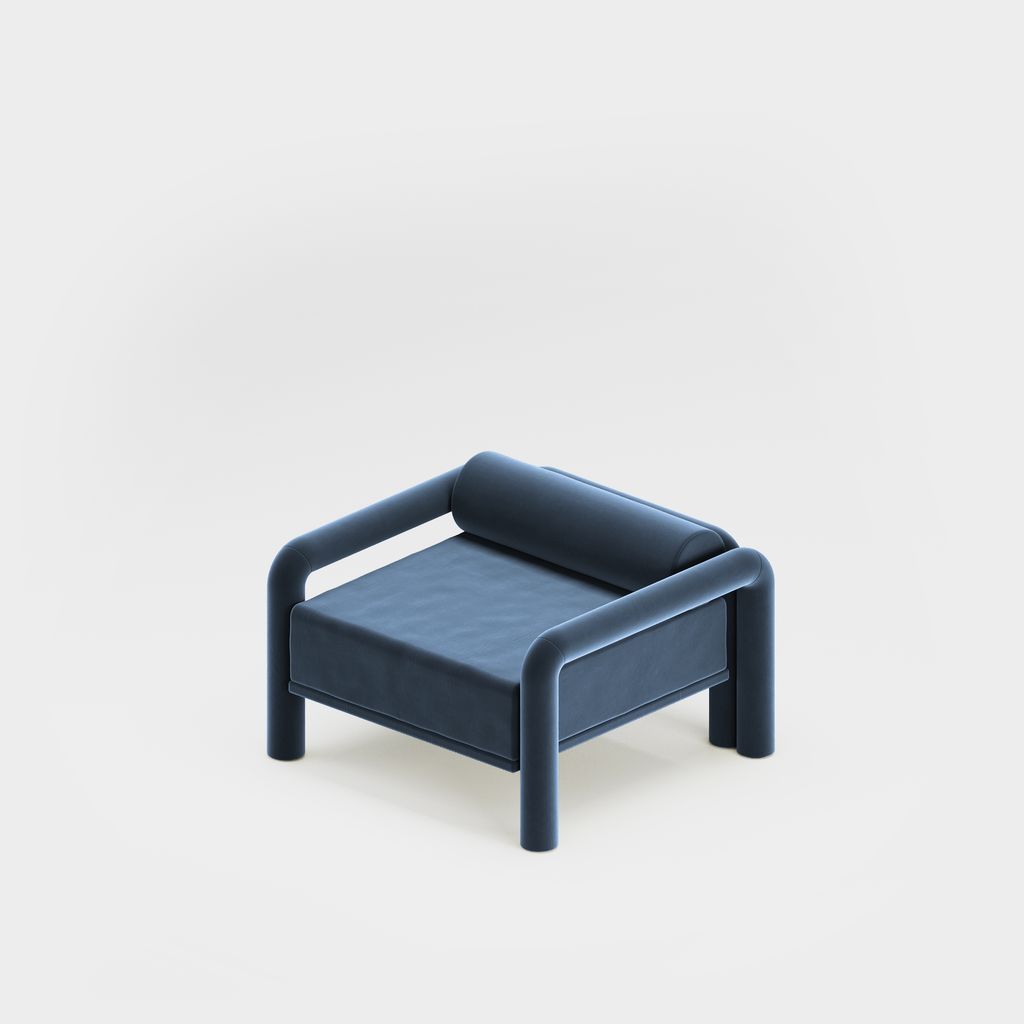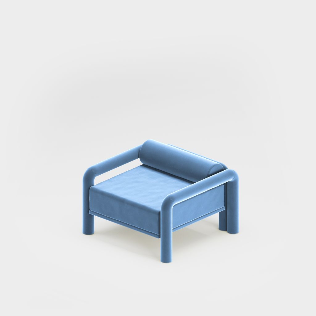 The seating is placed lower than usual, closer to the floor, slowly prowling towards you to catch you in its softness. The objects are fully covered in the upholstery fabric, with all parts coming together in a cohesive silhouette, like the parts of one body.