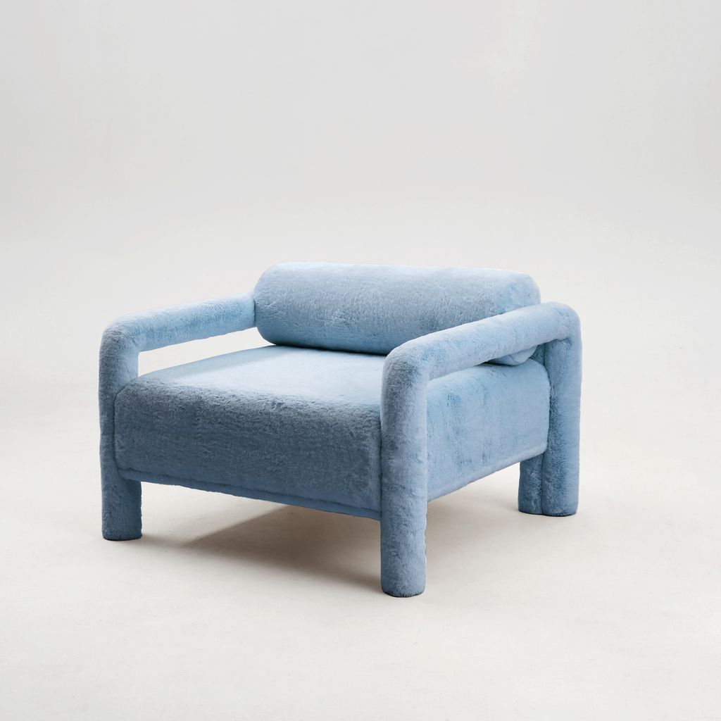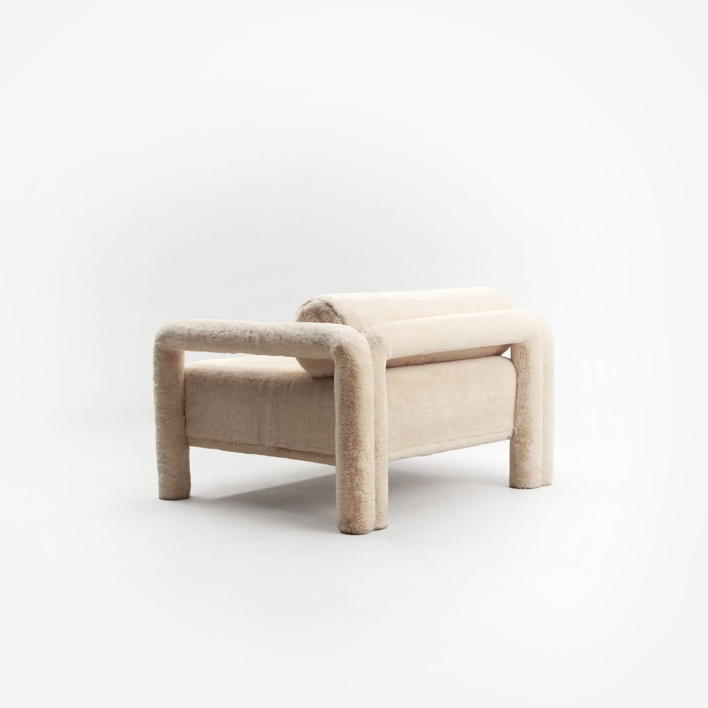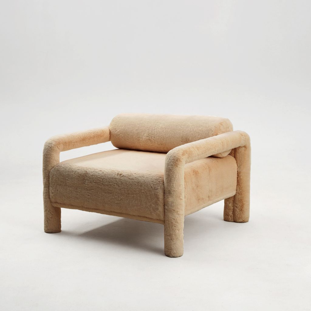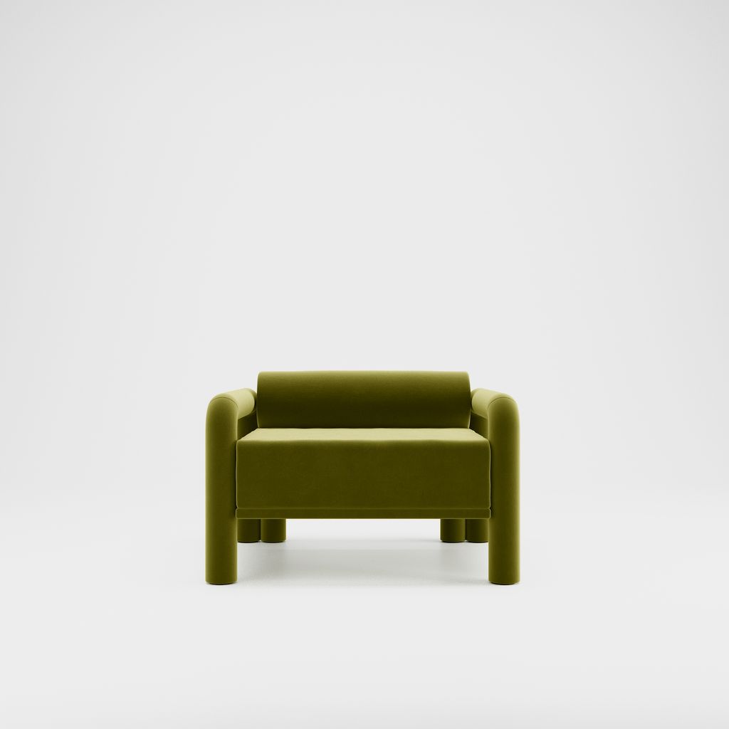 The seating is placed lower than usual, closer to the floor, slowly prowling towards you to catch you in its softness. The objects are fully covered in the upholstery fabric, with all parts coming together in a cohesive silhouette, like the parts of one body.