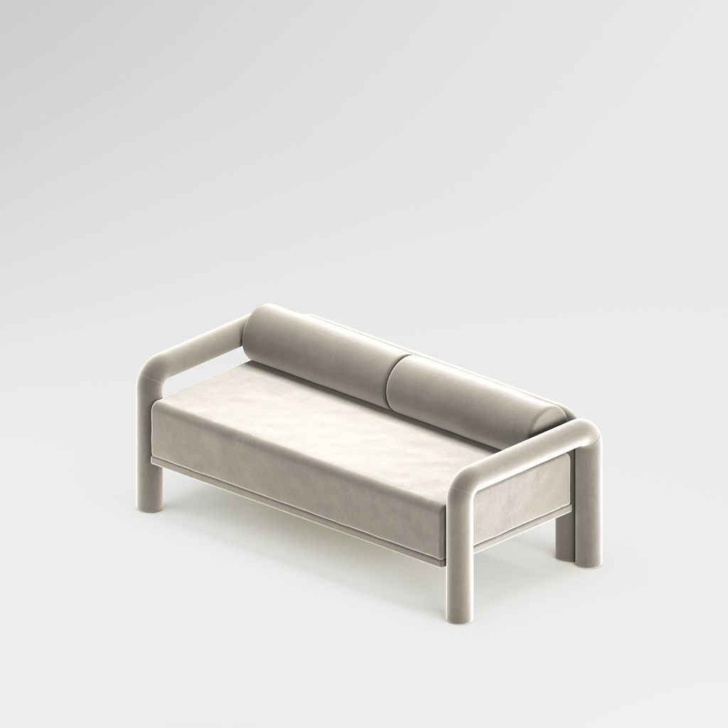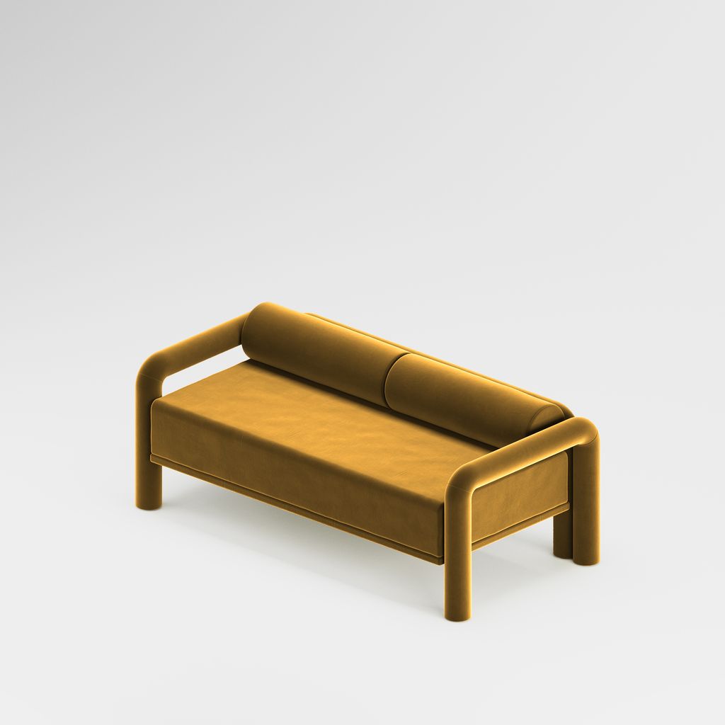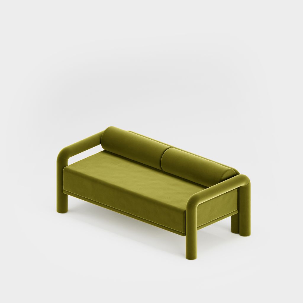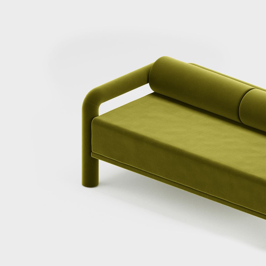 The seating is placed lower than usual, closer to the floor, slowly prowling towards you to catch you in its softness. The objects are fully covered in the upholstery fabric, with all parts coming together in a cohesive silhouette, like the parts of one body.