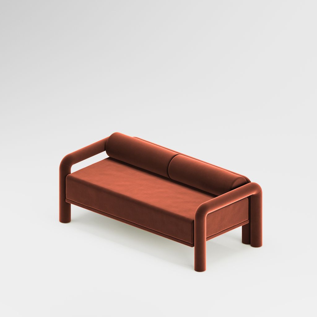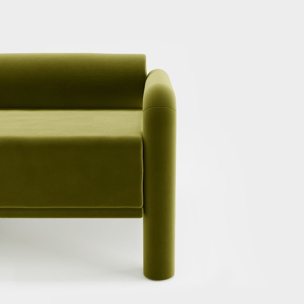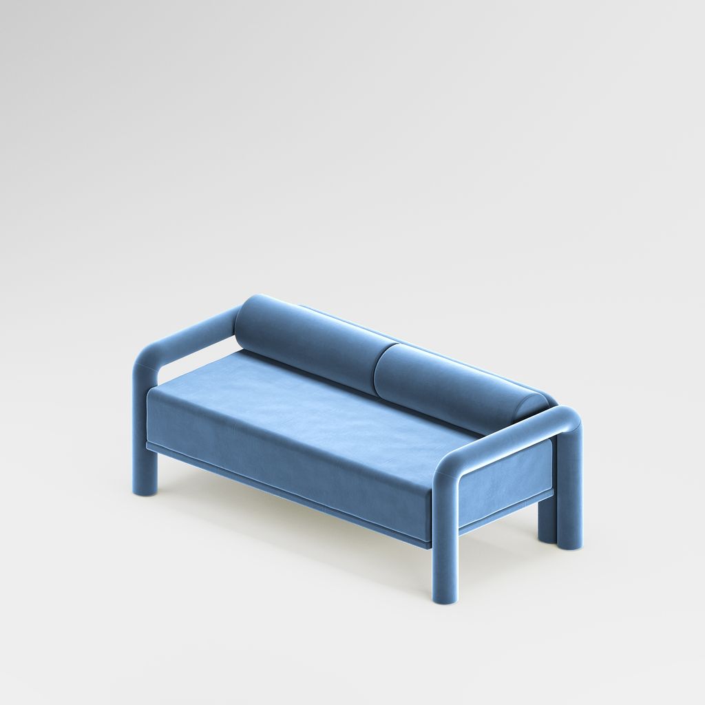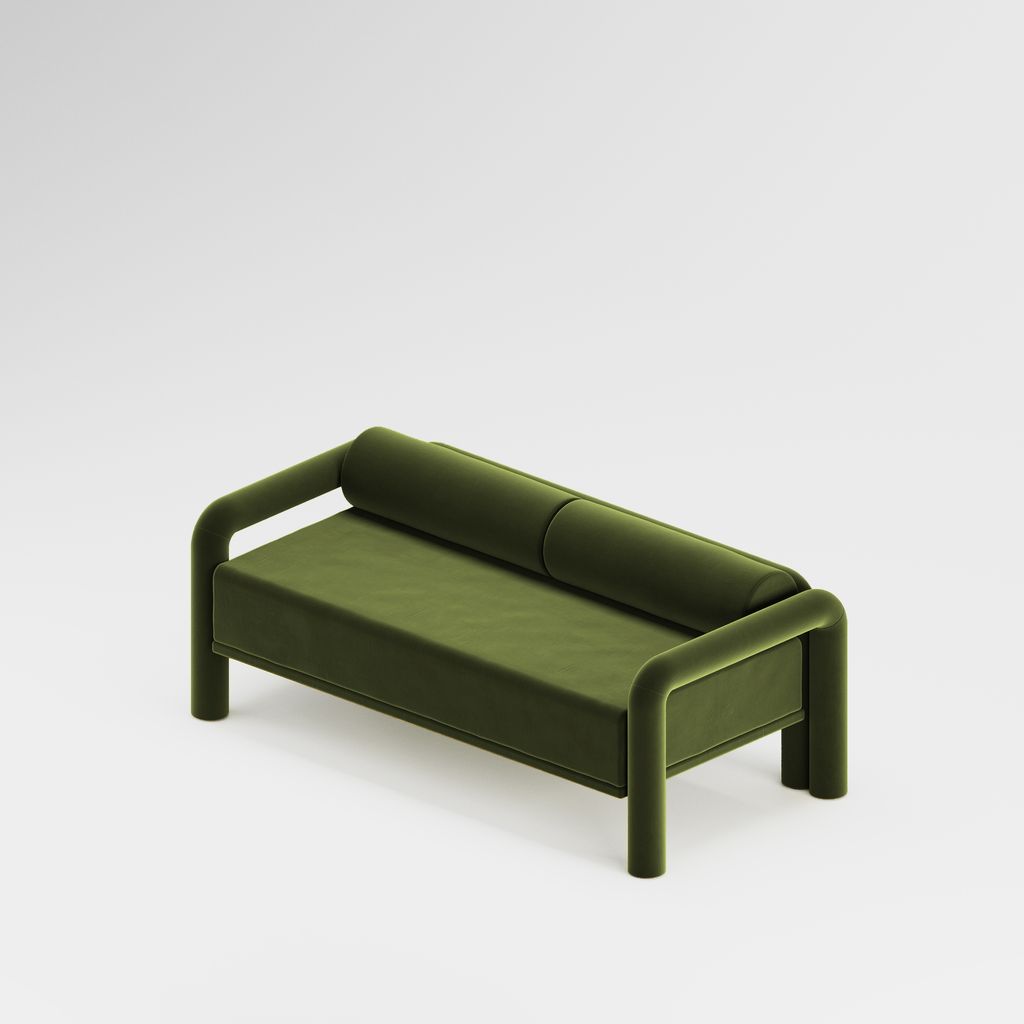 The seating is placed lower than usual, closer to the floor, slowly prowling towards you to catch you in its softness. The objects are fully covered in the upholstery fabric, with all parts coming together in a cohesive silhouette, like the parts of one body.