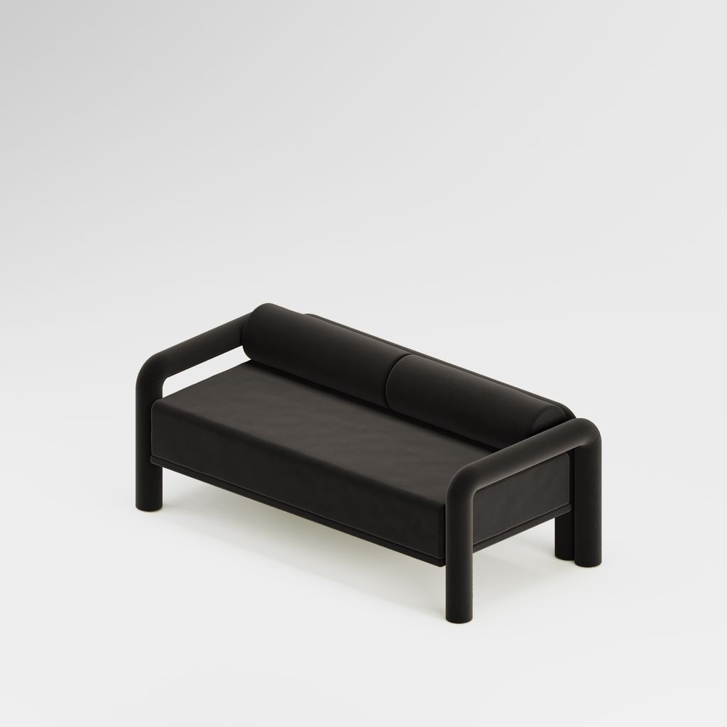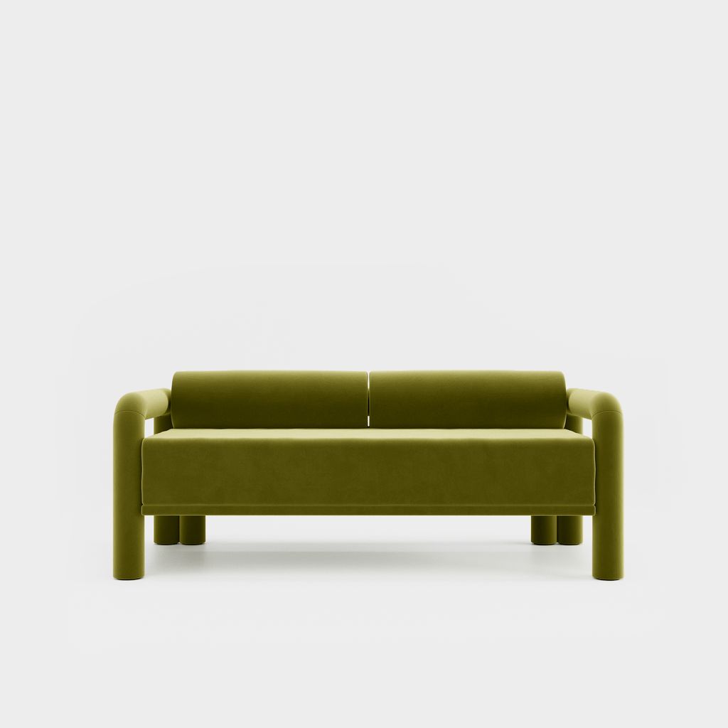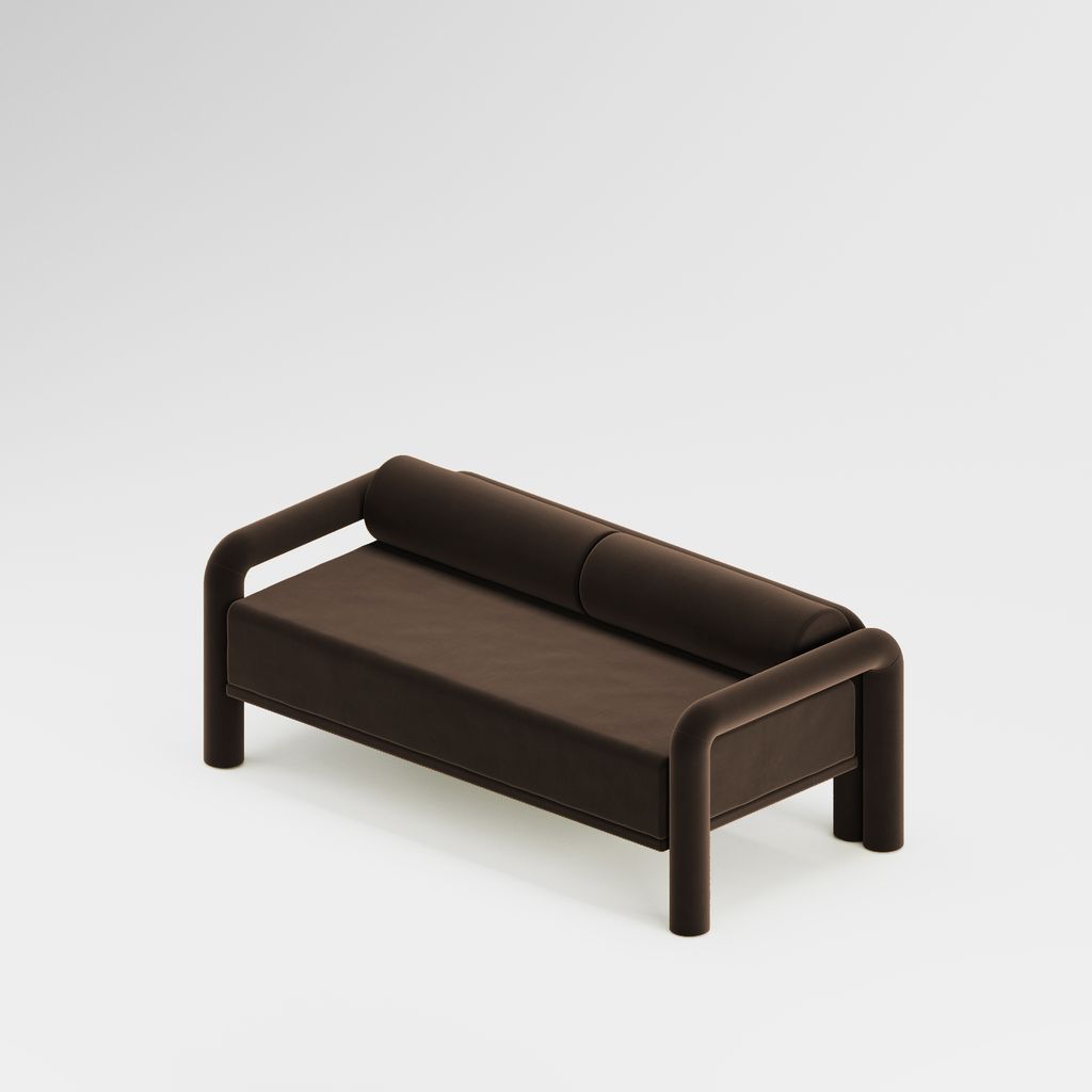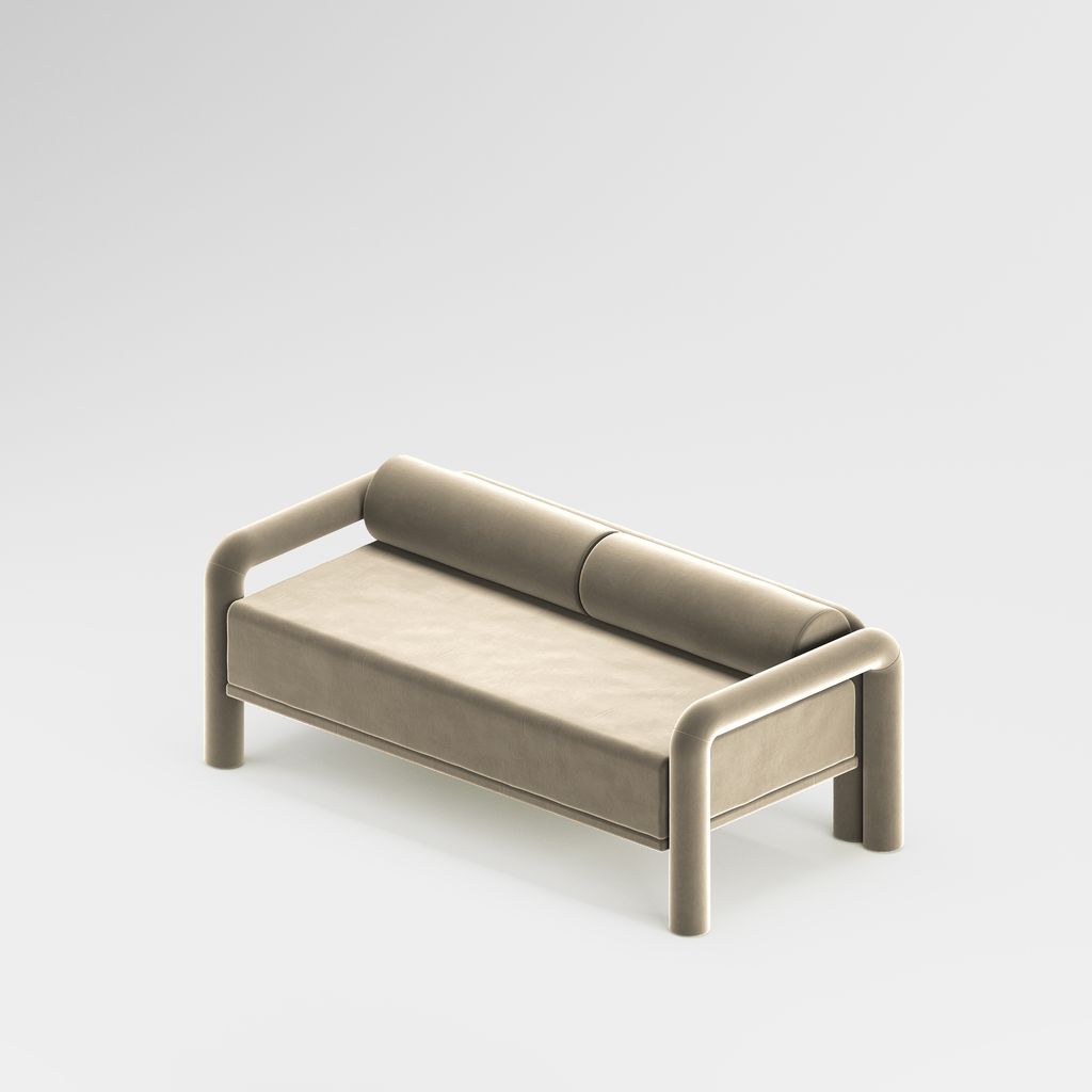 The seating is placed lower than usual, closer to the floor, slowly prowling towards you to catch you in its softness. The objects are fully covered in the upholstery fabric, with all parts coming together in a cohesive silhouette, like the parts of one body.