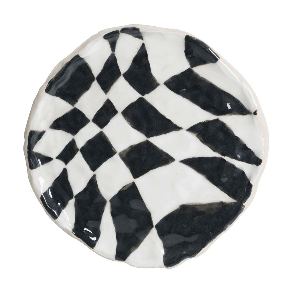 Small ceramic plate with a twisted, black and white psychedelic checkered pattern.