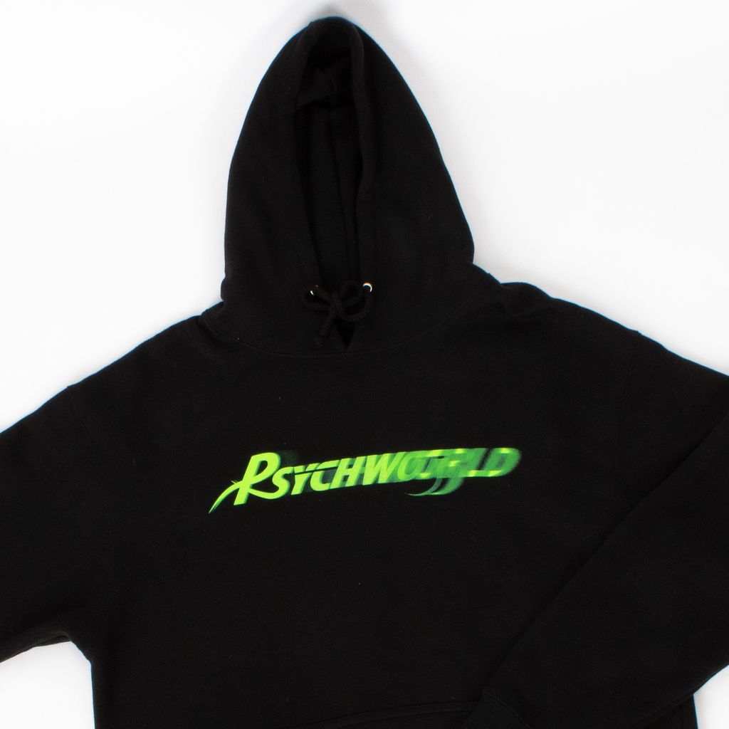 Thought you missed this drop, psych! Swoop this limited release hoodie from the brand Psychworld. Featuring green fazed out Psychworld graphic on chest, full hood with tonal pull ties, and kangaroo pocket. Sizing is not listed for this item, refer to measurements for exact fit.
