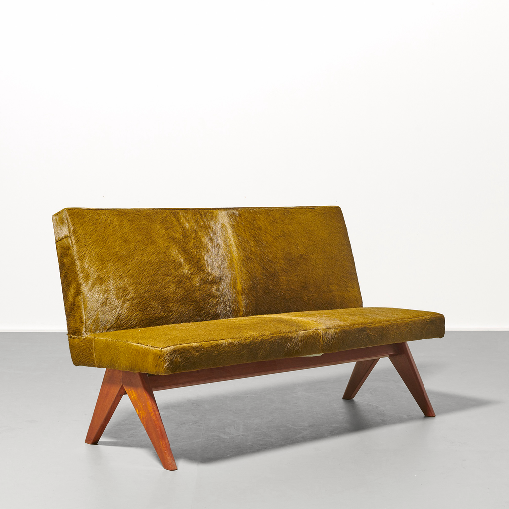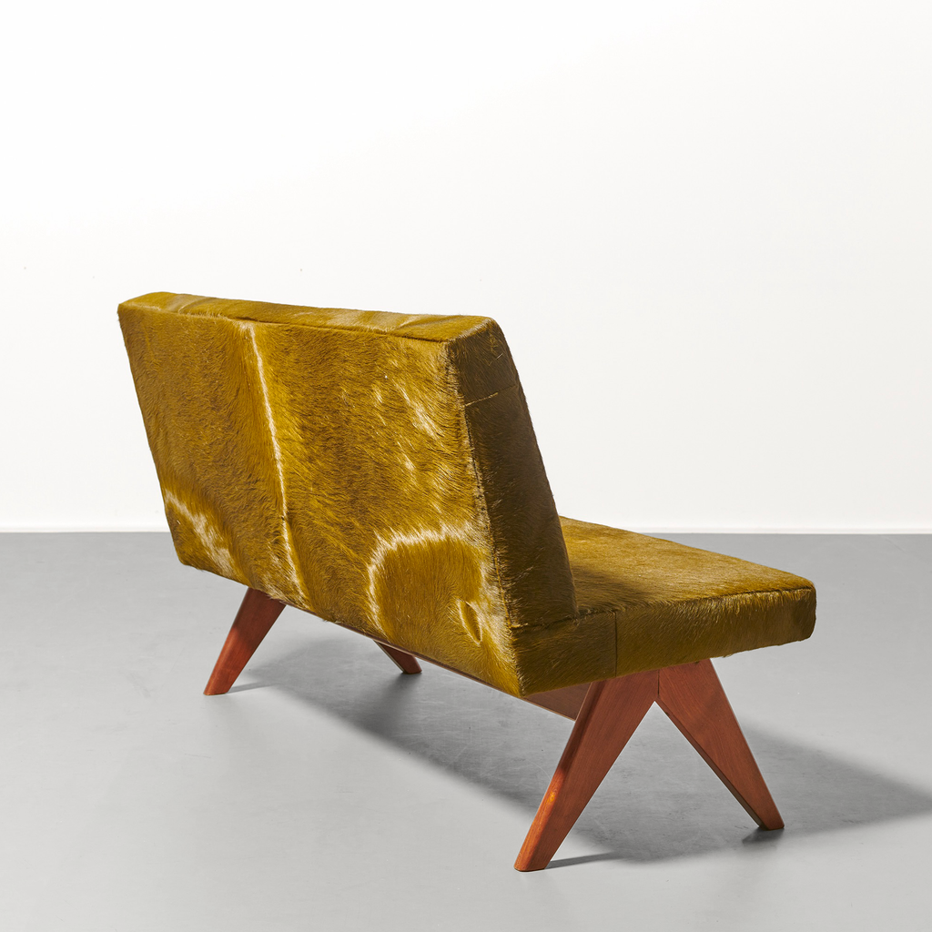 Armless settee made of teak frame, re-upholstered with green pony hide, angled back, and compass shaped legs.