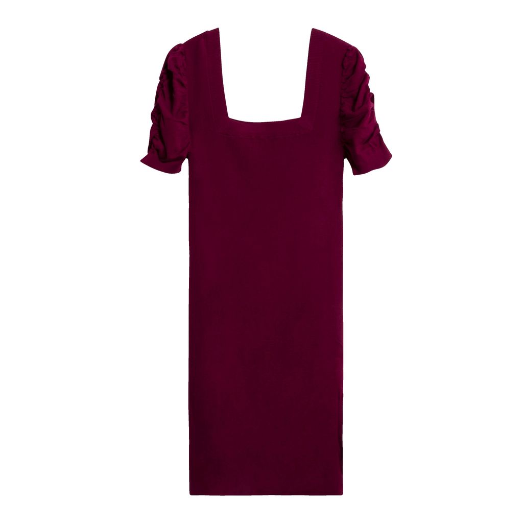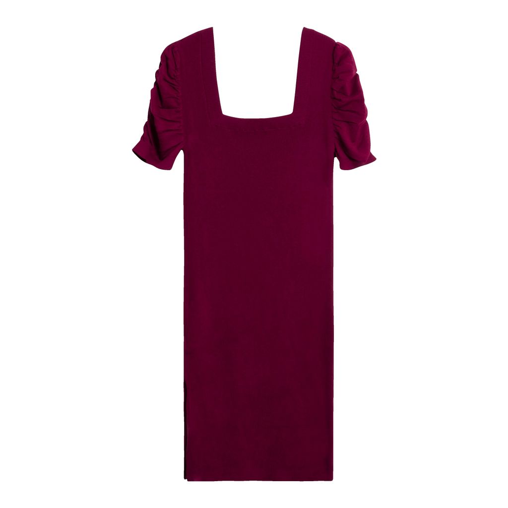 A square-neck, form-fitting midi-dress made of fine ribbed wool. This extra special knit dress features statement puffed sleeves and a subtle slit up the thigh.