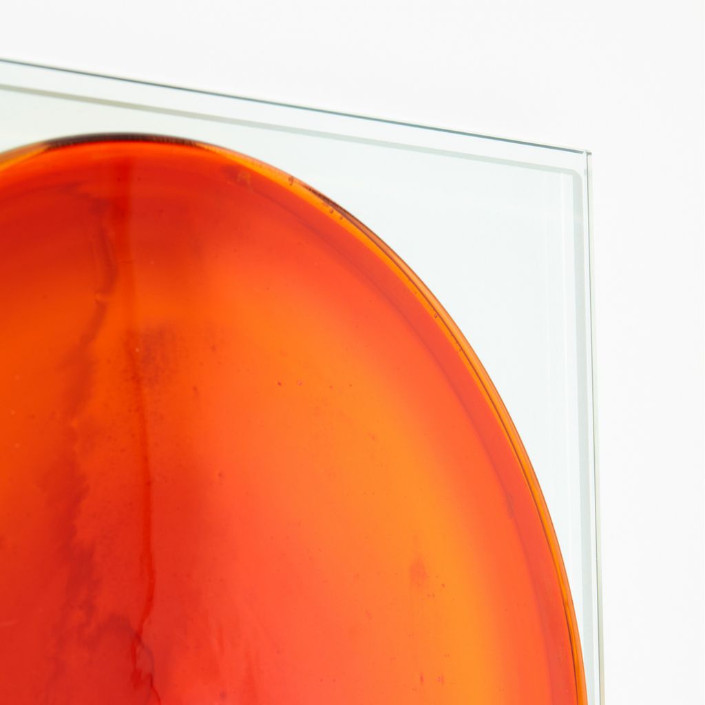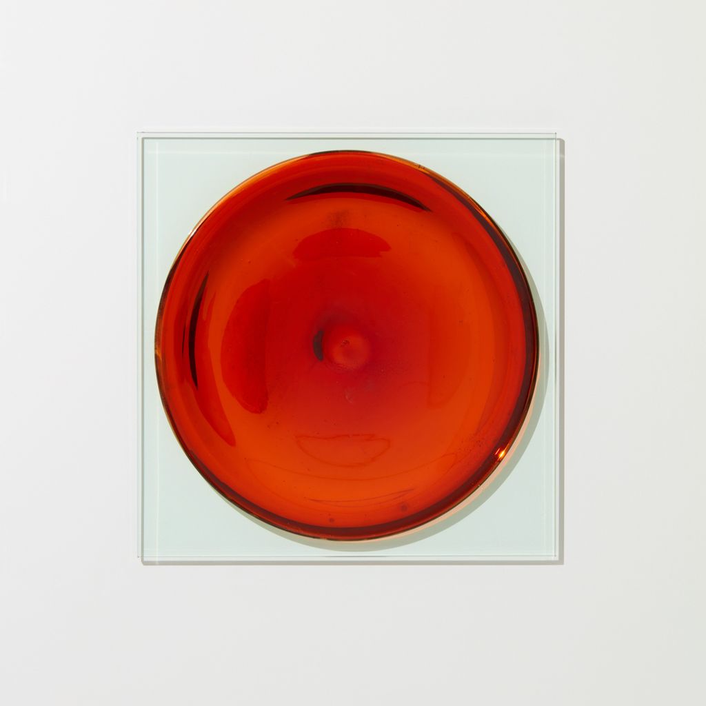 Built in two parts- a handblown and mirrorized glass puddle centered on a flat square sheet of high-iron glass. Mirror is hung on a french cleat. Clear back glass and mirrorized rondel.