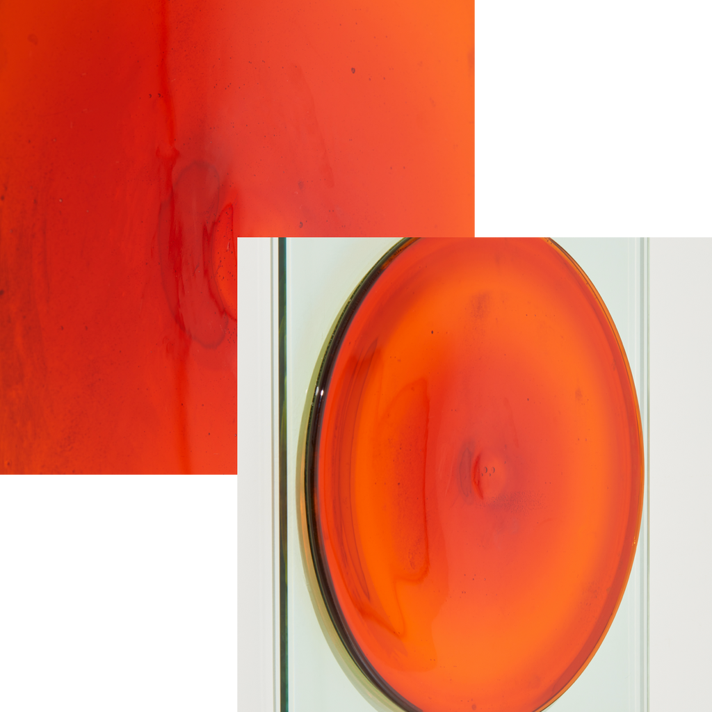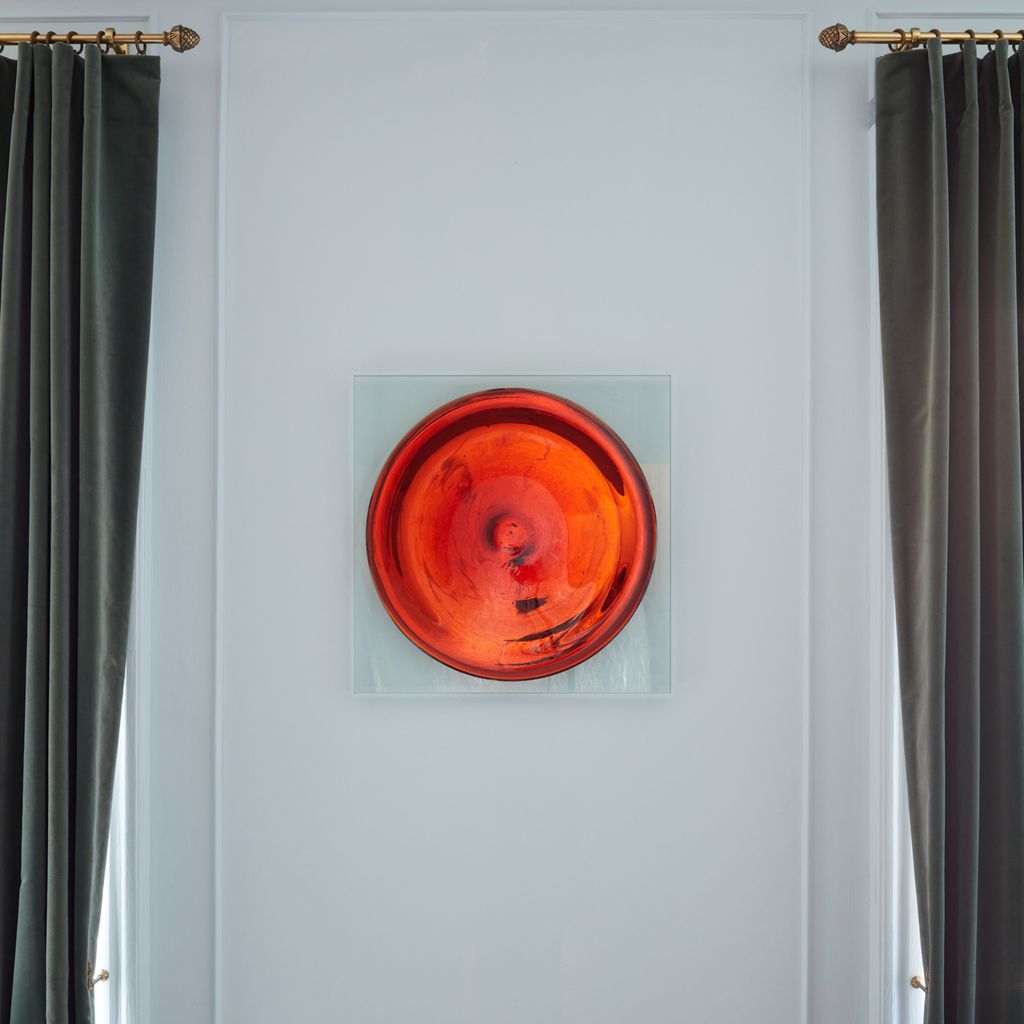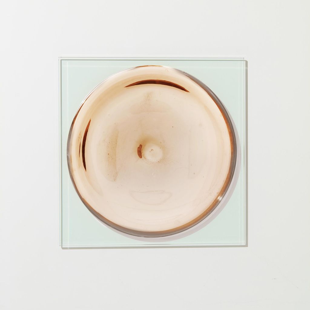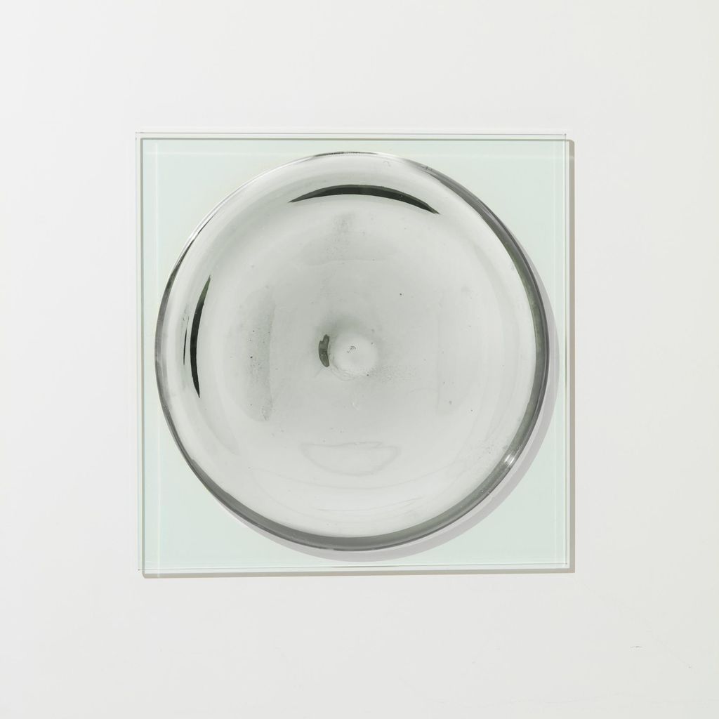 THE PUDDLE MIRROR is built in two parts- a handblown and mirrorized glass rondel centered on a flat square sheet of high-iron glass. The two forms juxtapose rigid geometry and freeform craft, evoking a puddle on a rainy day.