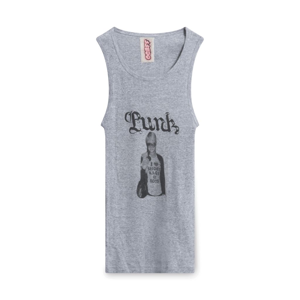 A grey tank featuring a stylized print of Paris Hilton and the text "PUNK" at the chest.