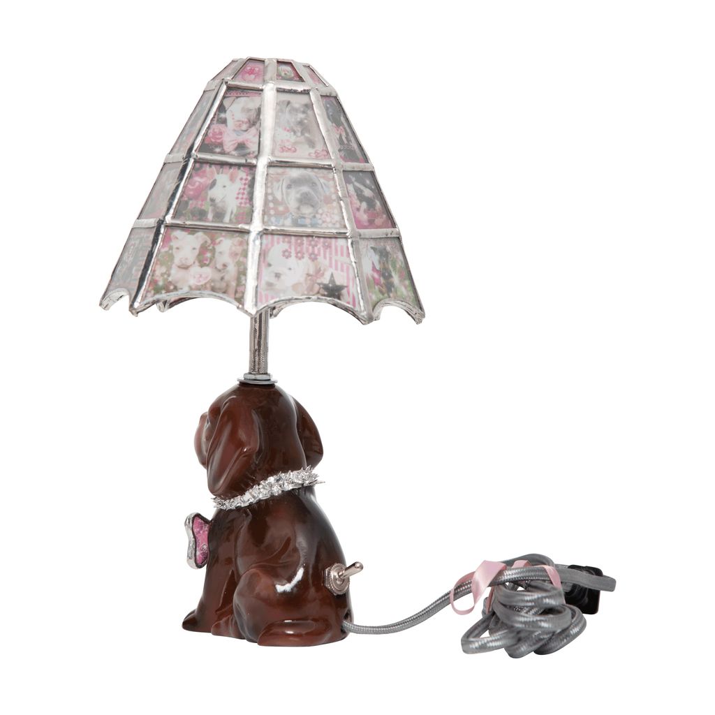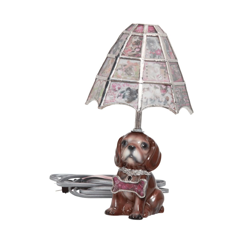 Acrylic on found antique ceramic, glass, inkjet print on vellum, solder, nickel plated lamp harp, steel metal braided cord, toggle switch