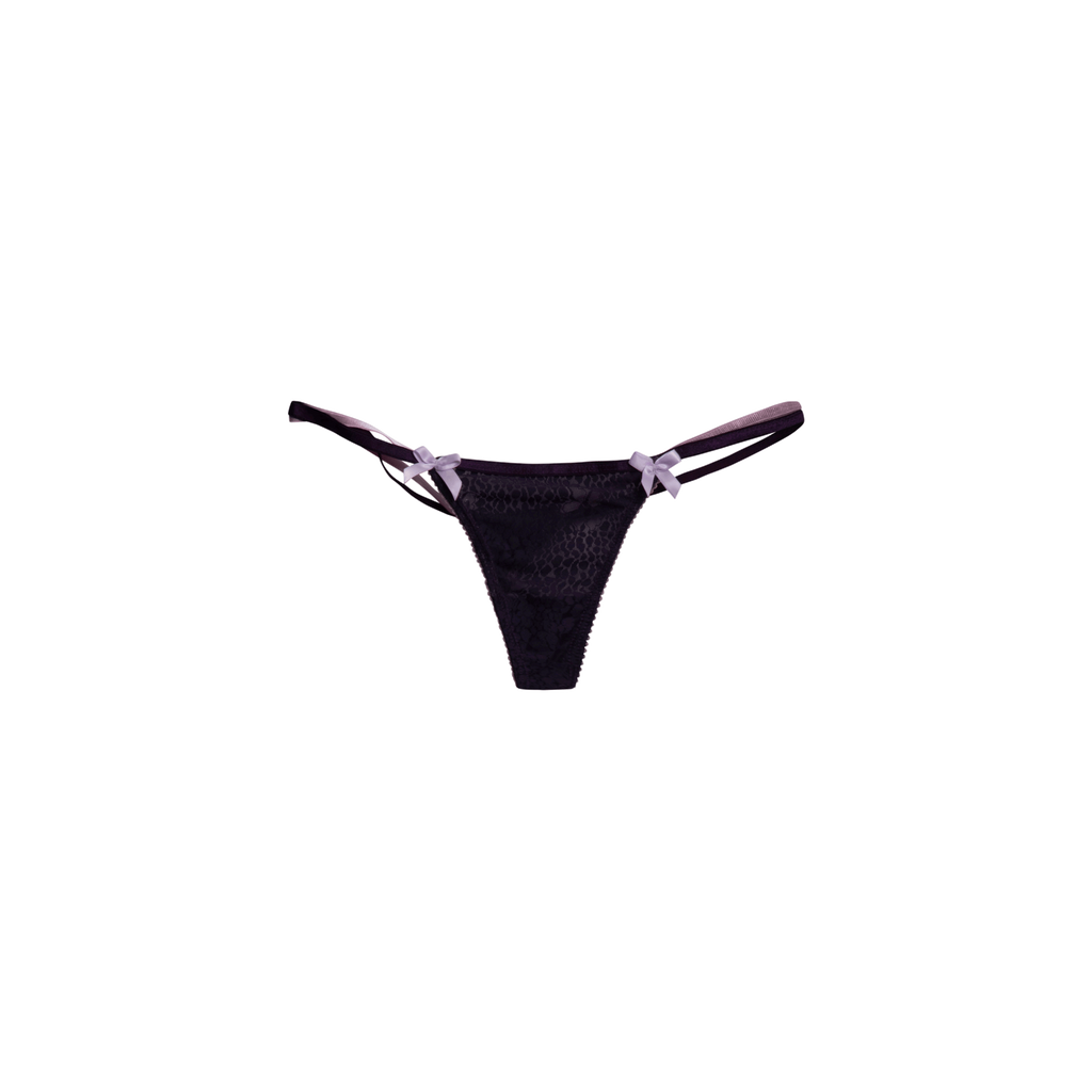Purple and Lilac Batesia Thong lilac satin bows, picot elastic, two-toned satin elastic, and sheer purple cheetah print.