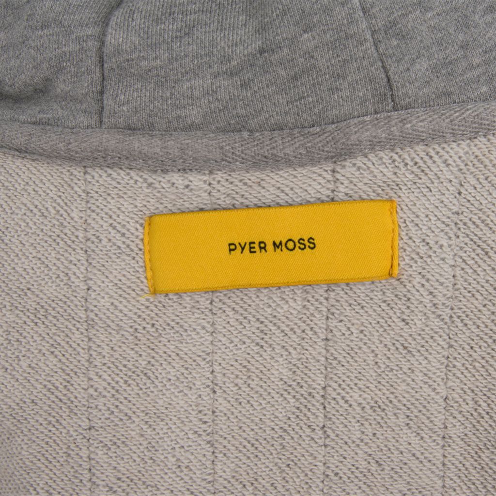 This hoodie from Pyer Moss features large text embroidery on the front and has a front kangaroo pocket for safe keeping. This hoodie has a cropped silhouette and is in good condition. Gently worn, drawstring missing.