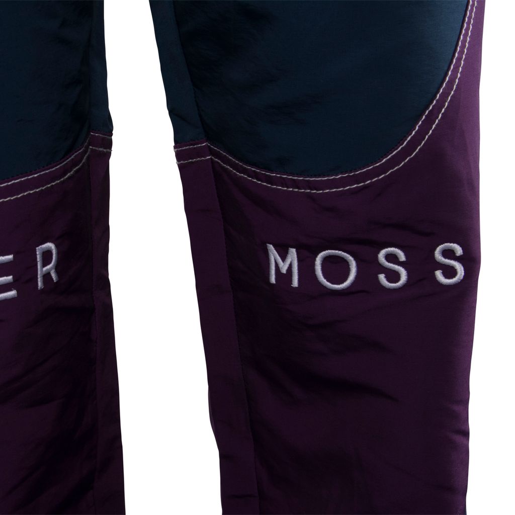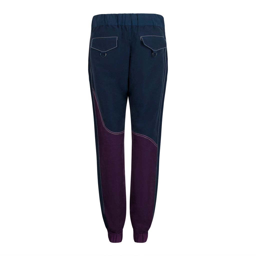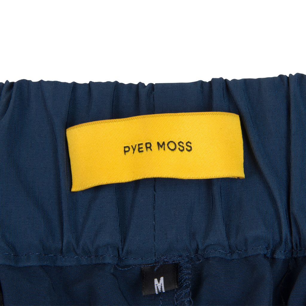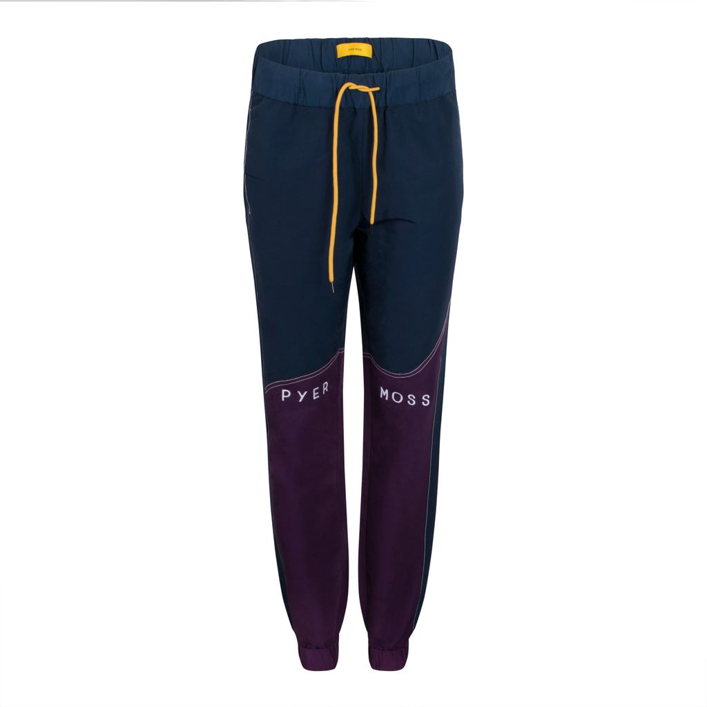 These Pyer Moss lightweight athletic pants feature a two-tone outer with a navy blue upper and regal purple lower calf section. Pyer Moss is seen embroidered at the knee. This pant has functional front/back pockets, stretch ankle cuffs, and a fitted drawstring waistline. Gently worn in good condition, marks on the lower leg.