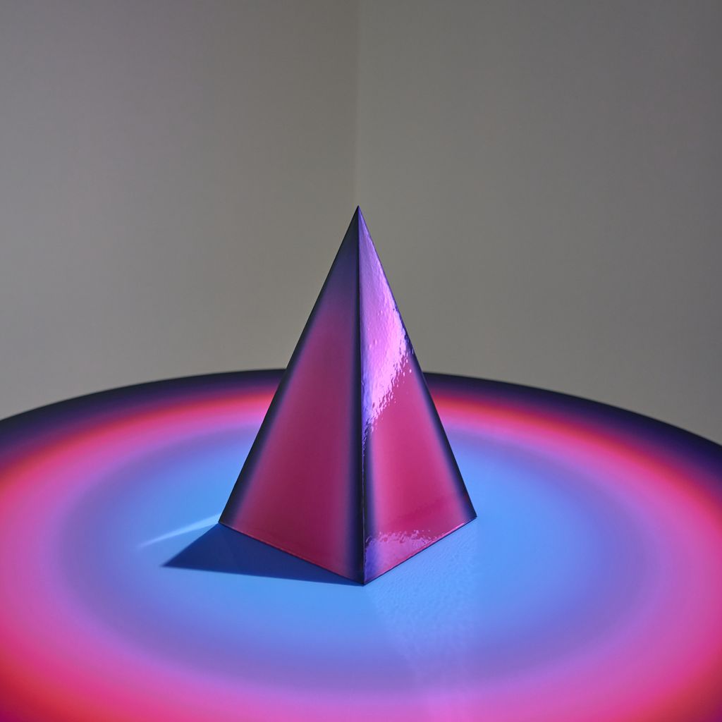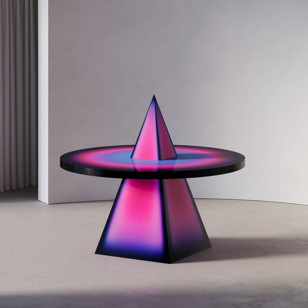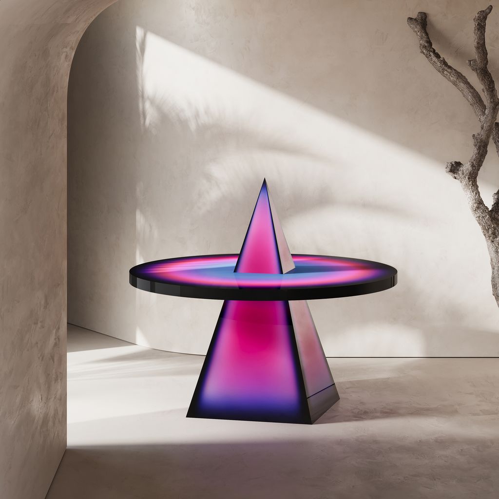 Pyramid Table (Pink) features birch wood, aerosol, resin, and ink.