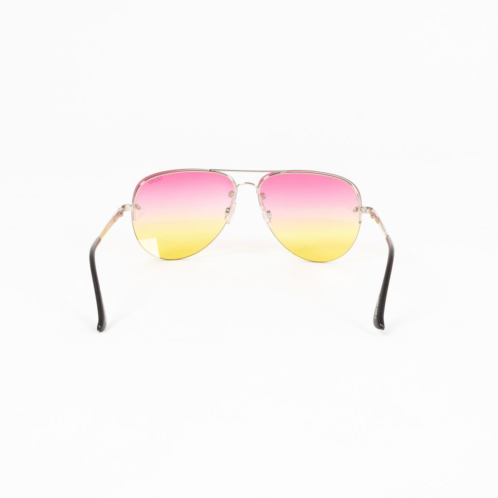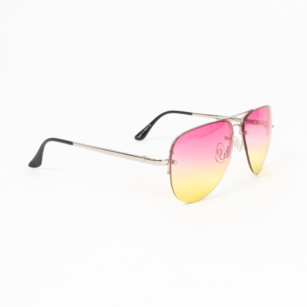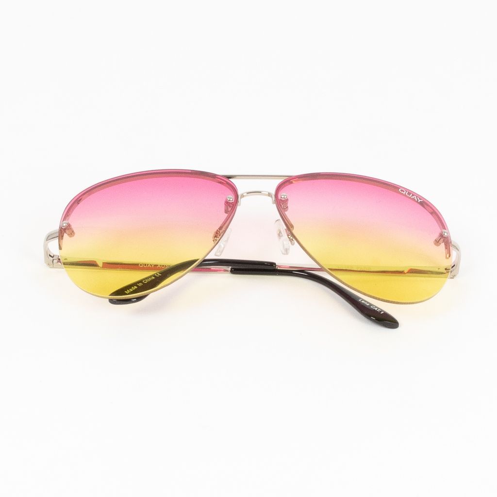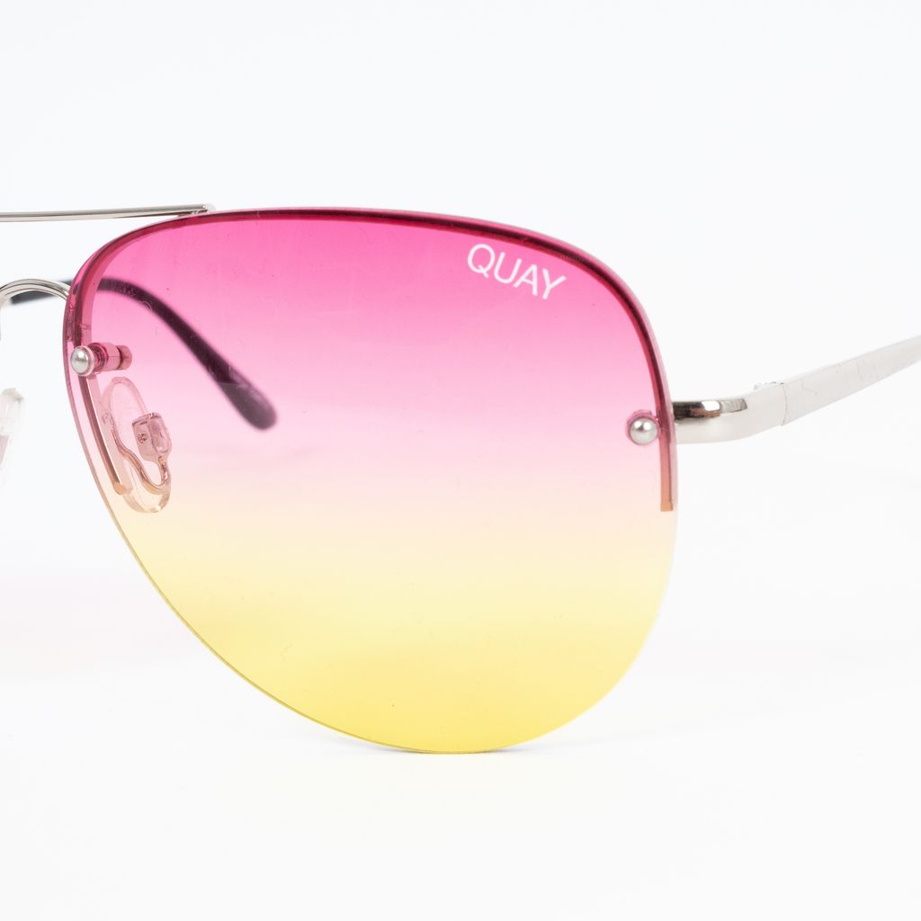 These aviator sunnies from Quay Australia are like a sherbet colored sunset for your eyes. Features pink to yellow ombre lenses, silver metal aviator frame, Quay logo on top of left lens, and clear nose pads.