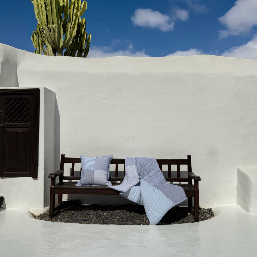 This quilted patchwork throw features a medley of blues – from soft sky to deep denim – along with white and gradients of gray. Each padded panel possess unique striped patterns that feel sweetly familiar and timeless.