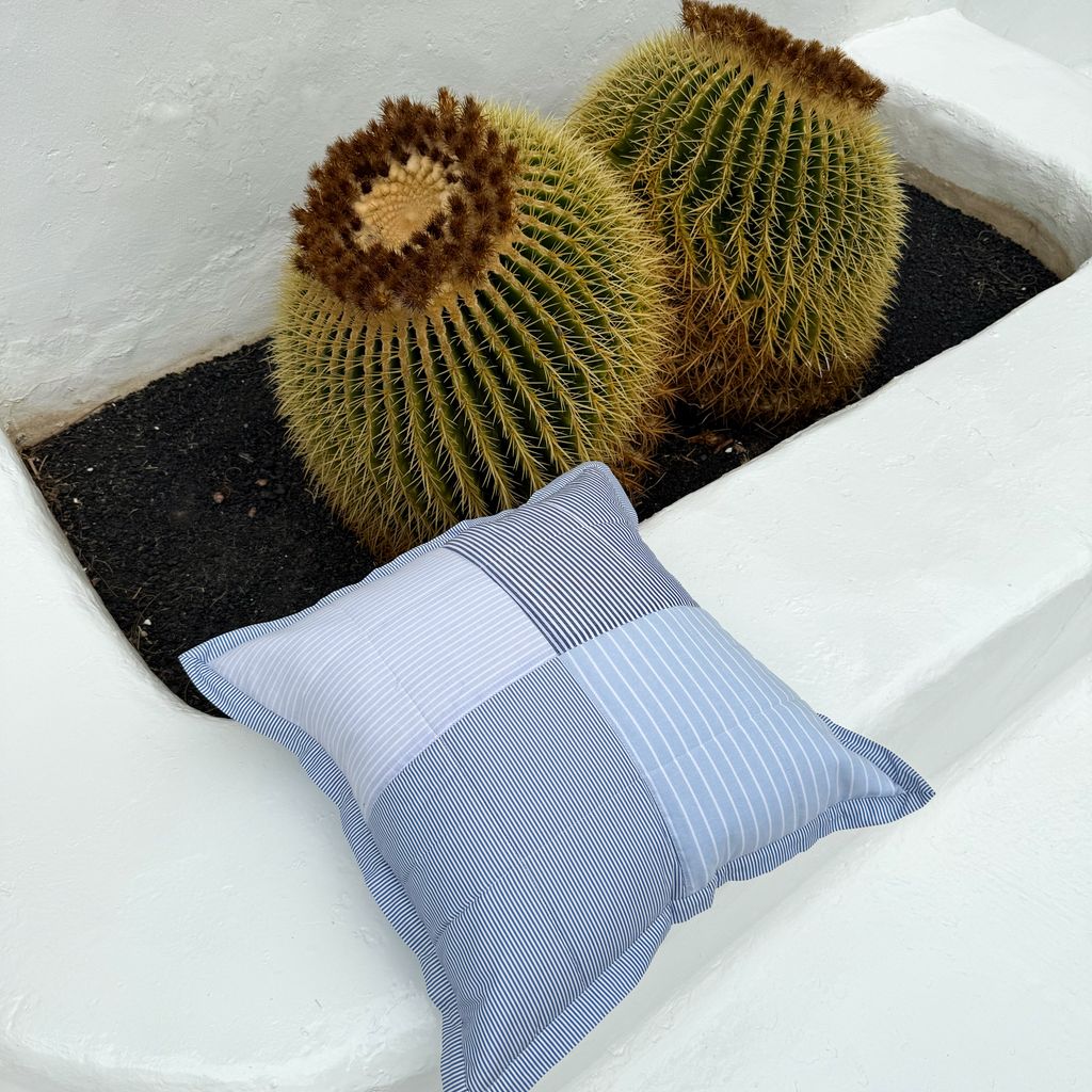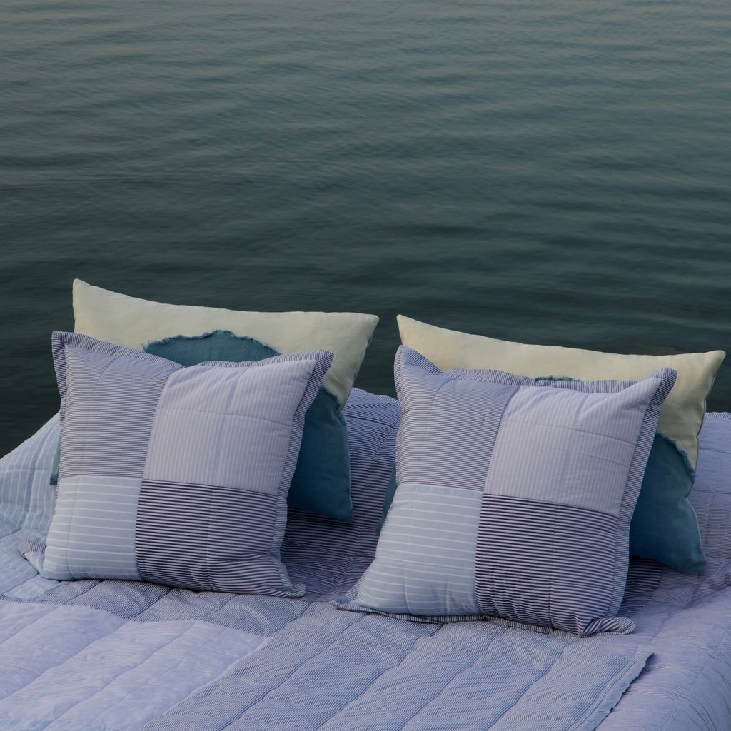 This quilted patchwork pillow cover features a medley of blues – from soft sky to deep denim.