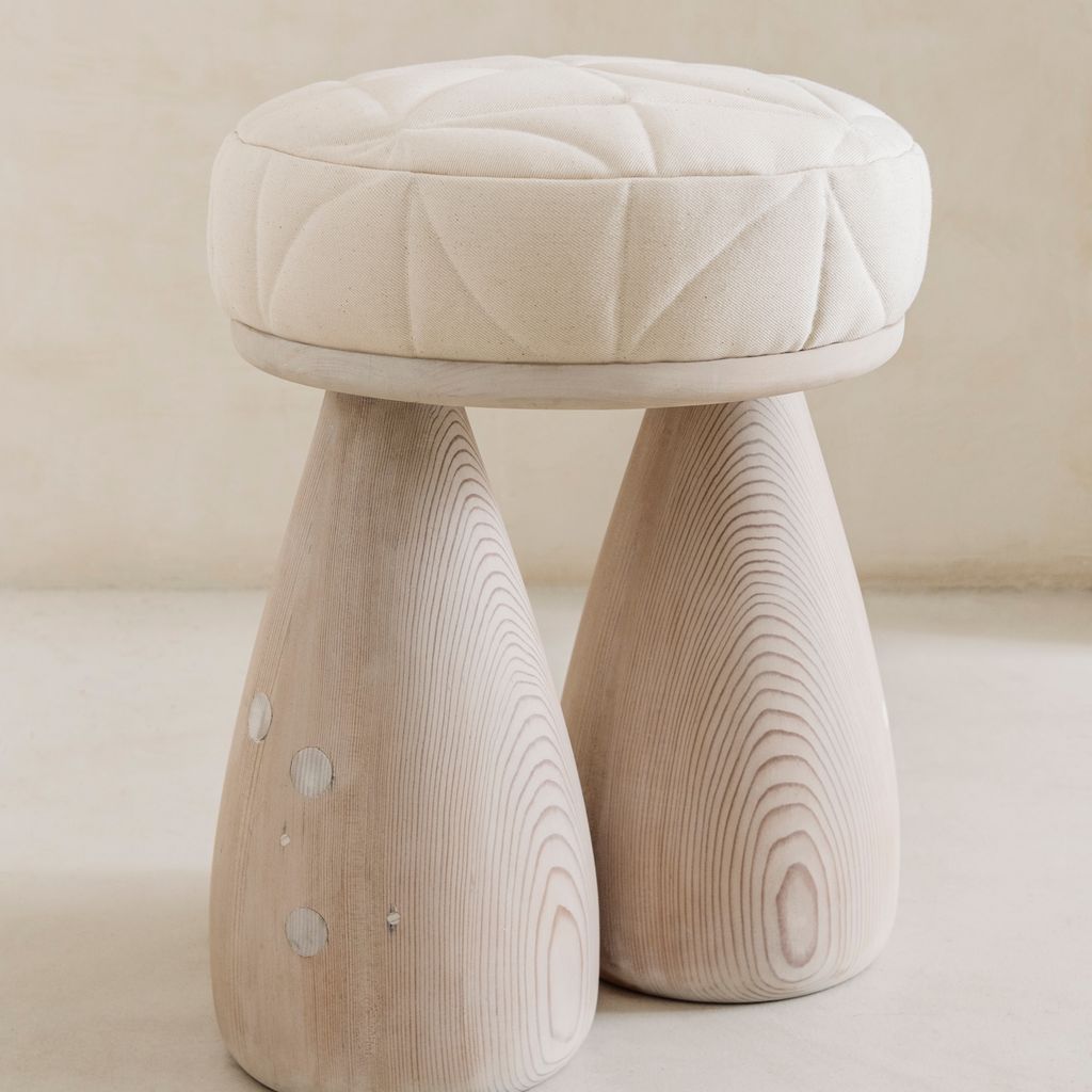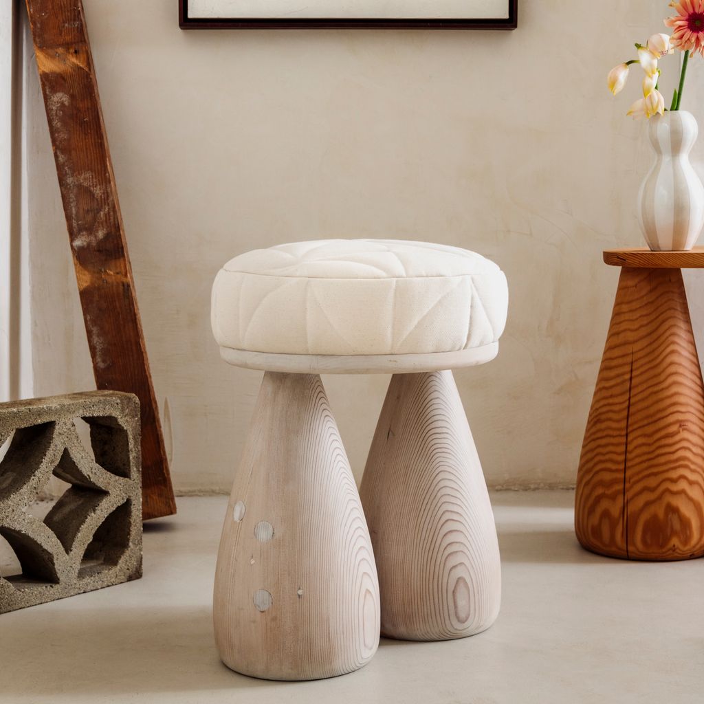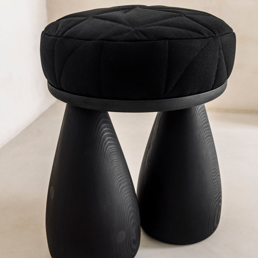 The quilted stool is made from salvaged douglas fir and deadstock fabrics. The fabric has been quilted in a pinwheel pattern to create a subtle texture and unique surface design. The stool is made to order, finishes can be customized.