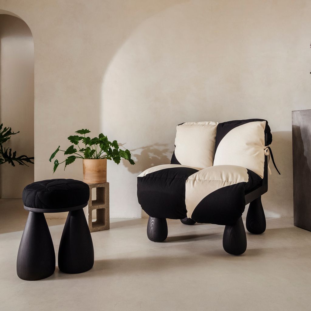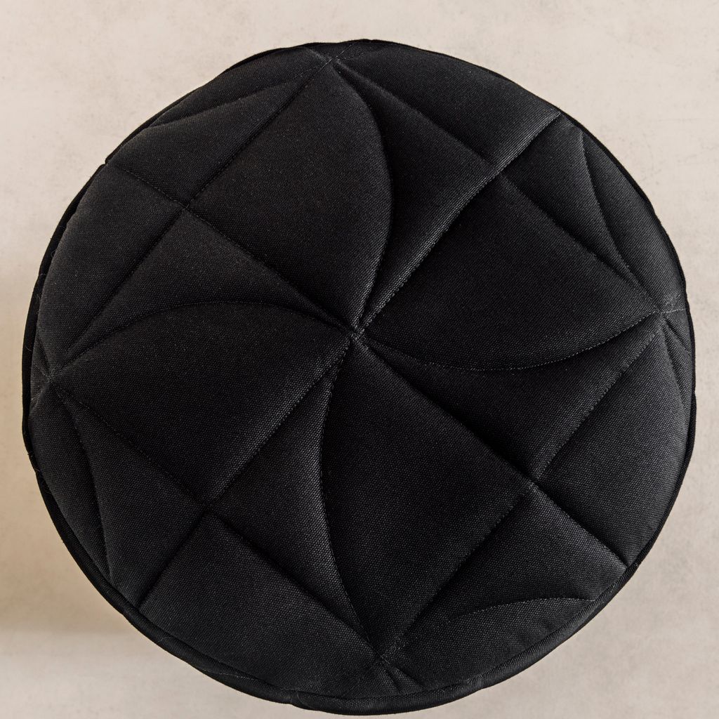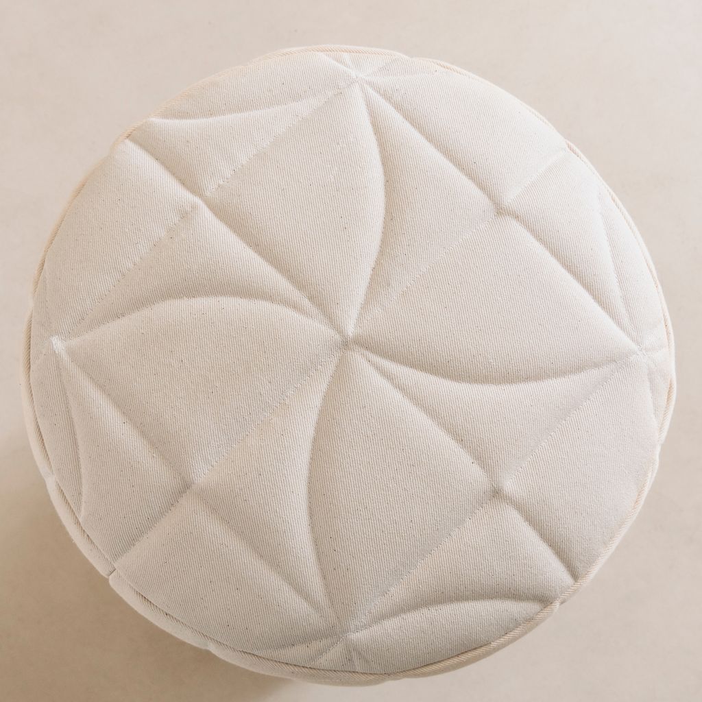 The quilted stool is made from salvaged douglas fir and deadstock fabrics. The fabric has been quilted in a pinwheel pattern to create a subtle texture and unique surface design. The stool is made to order, finishes can be customized.