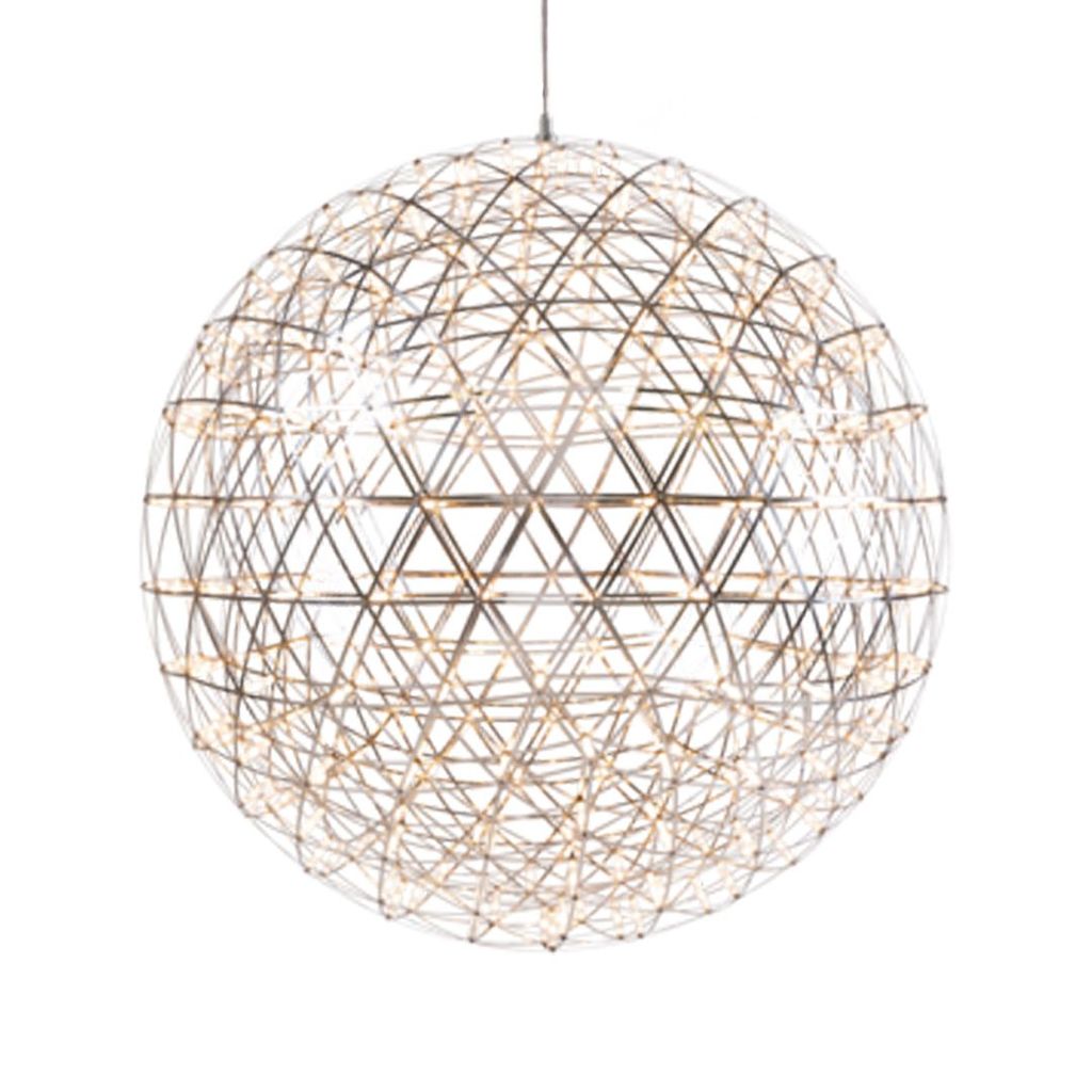 Listed for sale are two (sold separately) Raimond II R89 suspension lamps made of a stainless steel sphere (indoor use, not resistant to marine environments) with PMMA lenses. The lamp was designed by Raimond Puts and produced by Moooi in the Netherlands. It dates to circa 2022 and is guaranteed as authentic. Condition is excellent without notable signs of wear. It appears to have never been hung up and came from MOOOI directly in its original box.