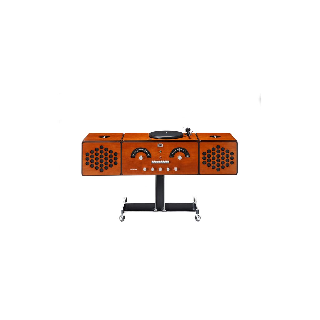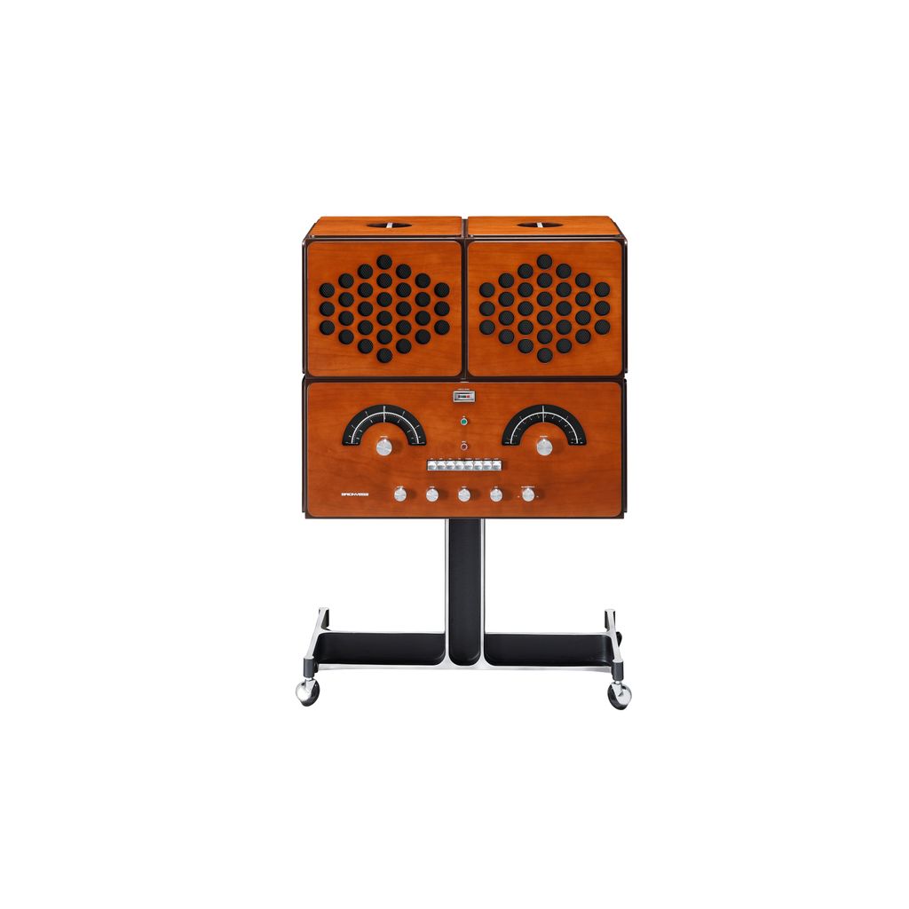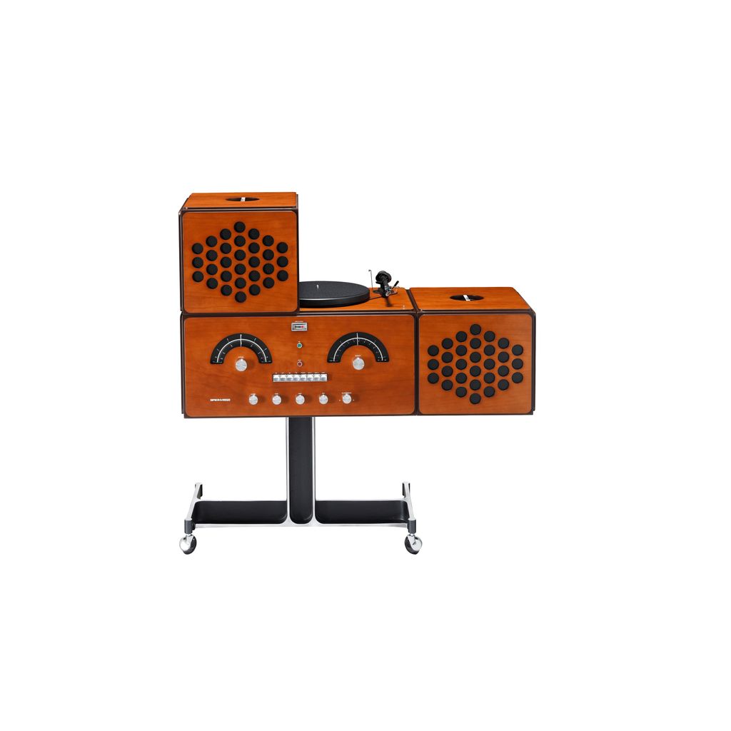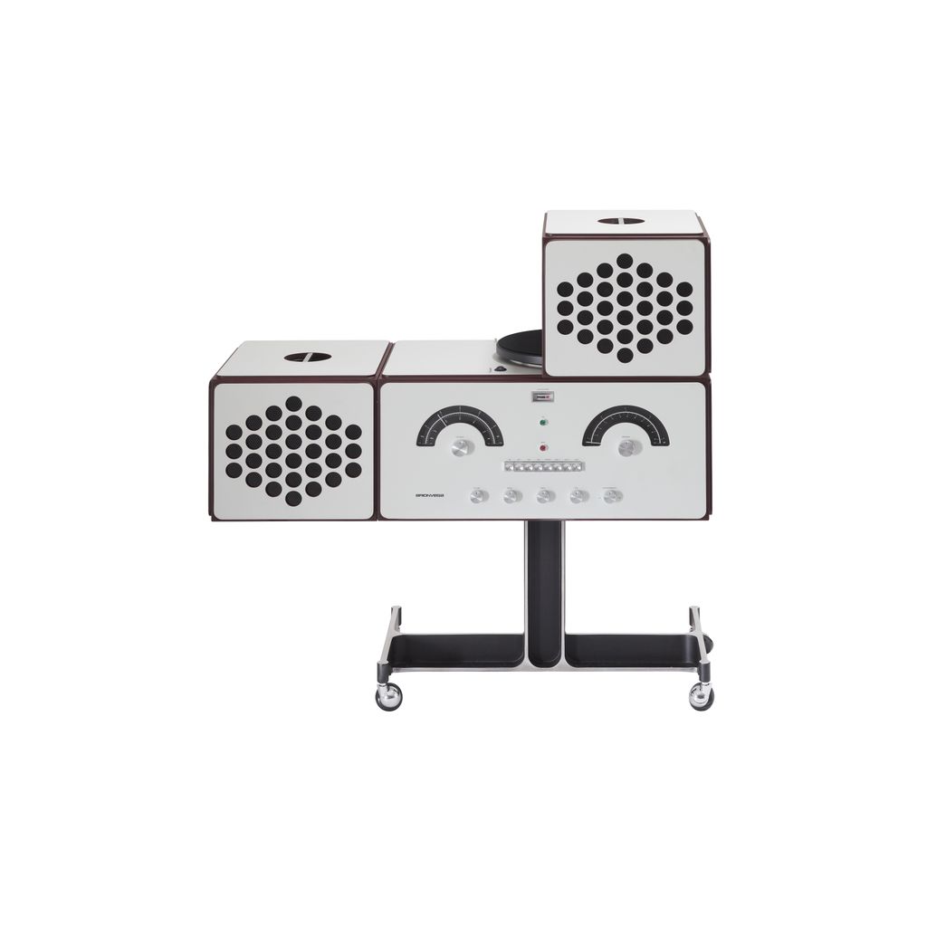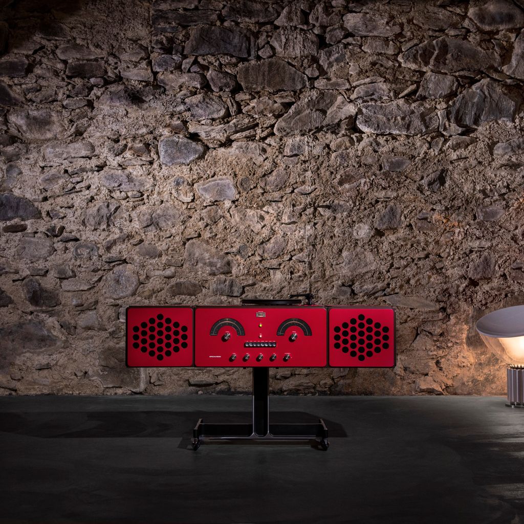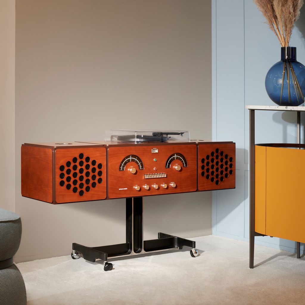 Sixty years of uniqueness, told by a smile that stays in time. Created in 1965 by designers Achille and Pier Giacomo Castiglioni, the radiofonografo is a superb work of modern industrial design, thanks to its incomparable style and sound. Exuding retro charm, along with an incredible sound and the ability to move the sound modules to best suit the surrounding environment, this system creates a listening experience both stimulating and intriguing.