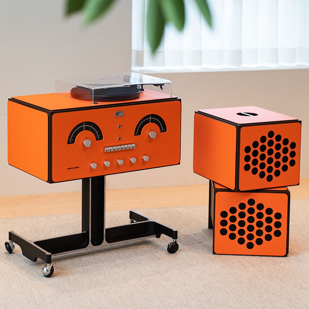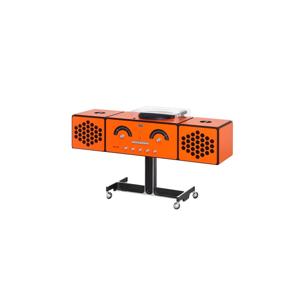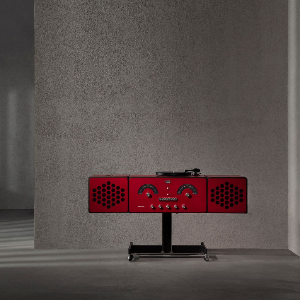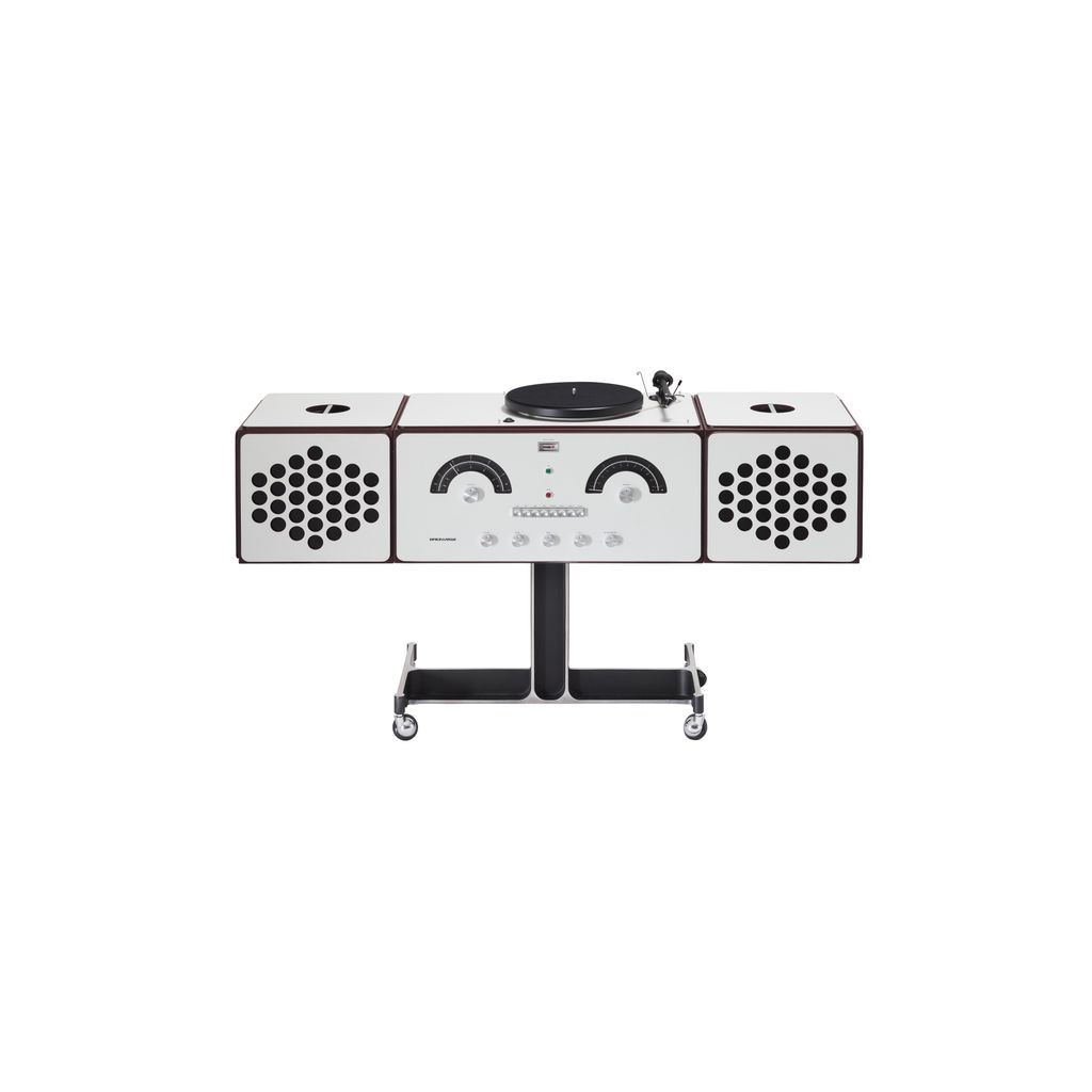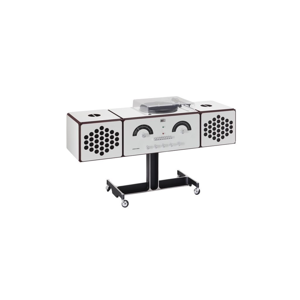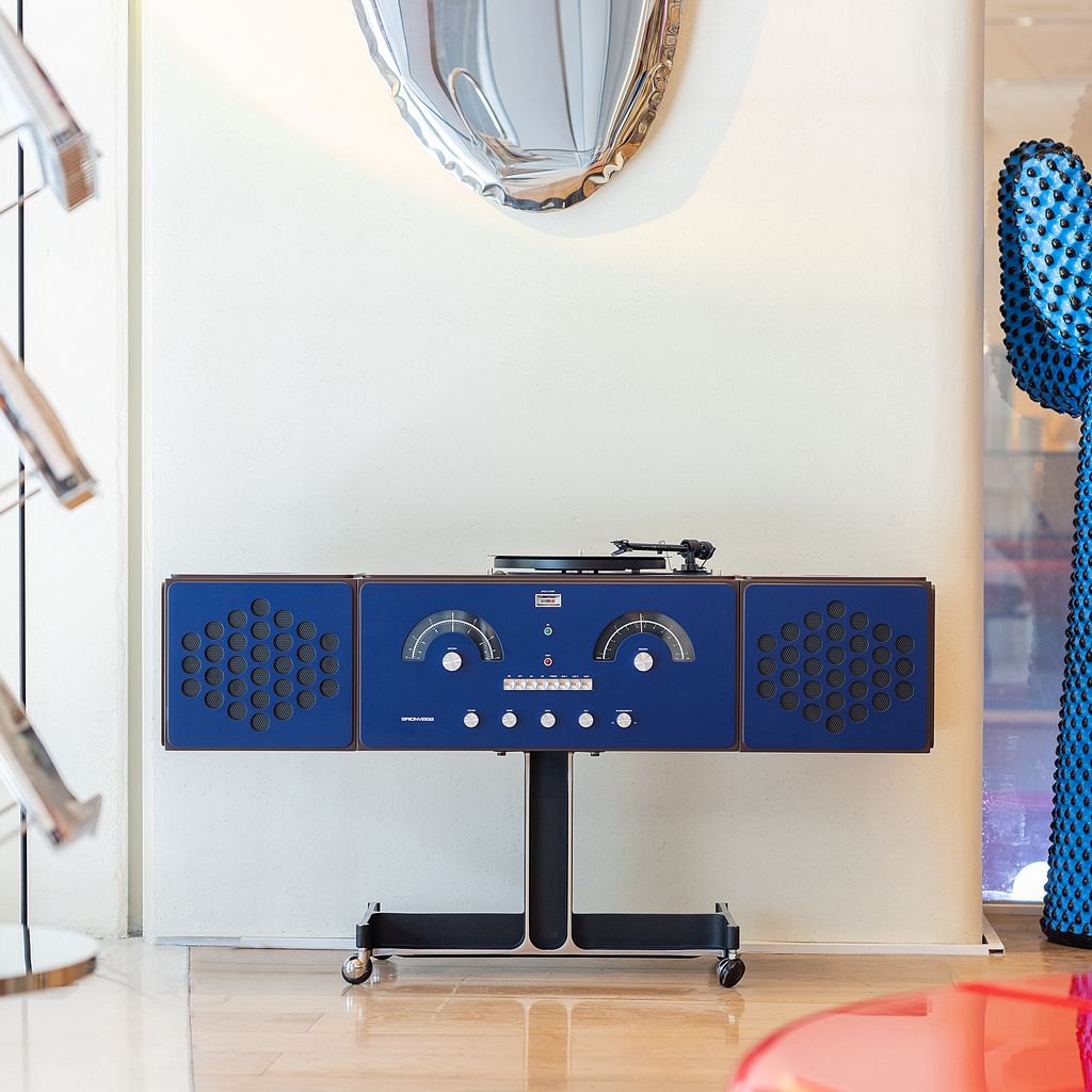 Sixty years of uniqueness, told by a smile that stays in time. Created in 1965 by designers Achille and Pier Giacomo Castiglioni, the radiofonografo is a superb work of modern industrial design, thanks to its incomparable style and sound. Exuding retro charm, along with an incredible sound and the ability to move the sound modules to best suit the surrounding environment, this system creates a listening experience both stimulating and intriguing.