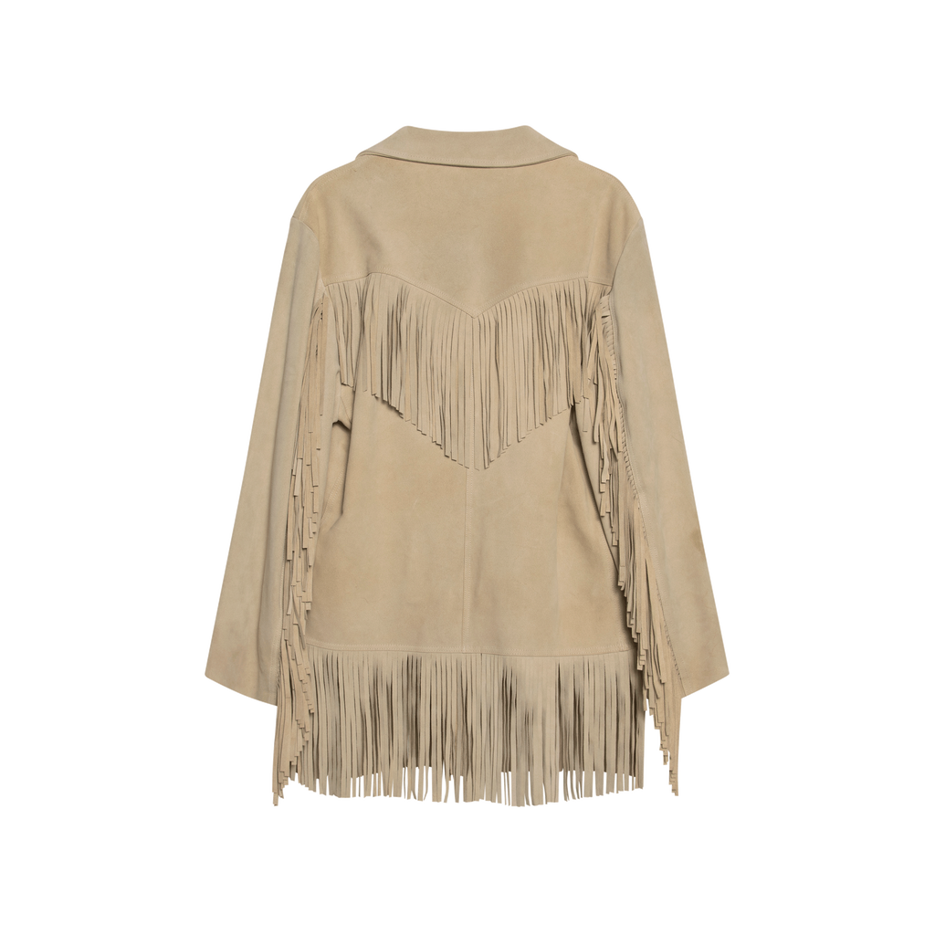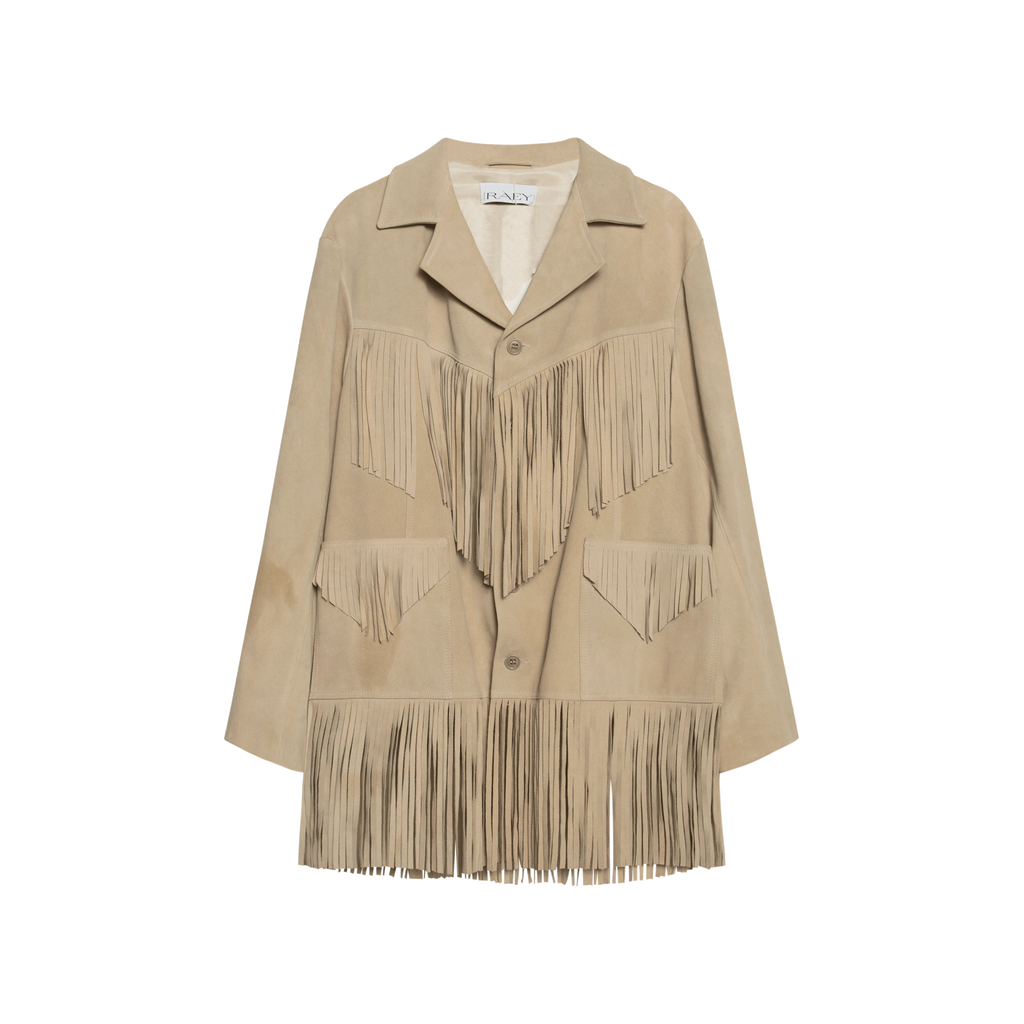 Raey Leather Jacket features button up closure, ribbon details at front.