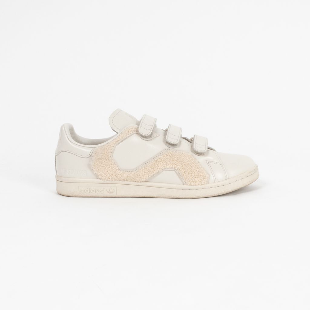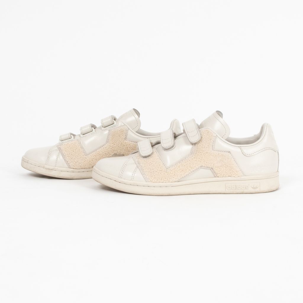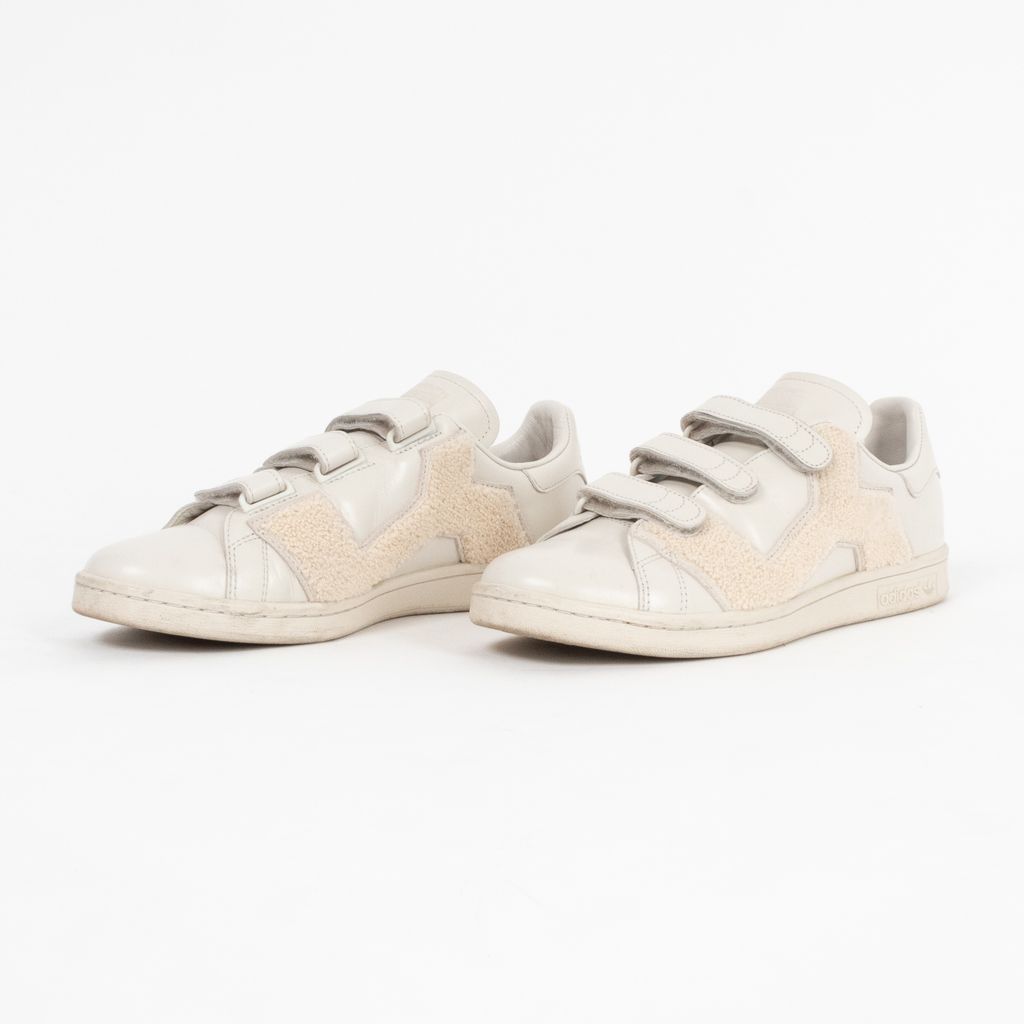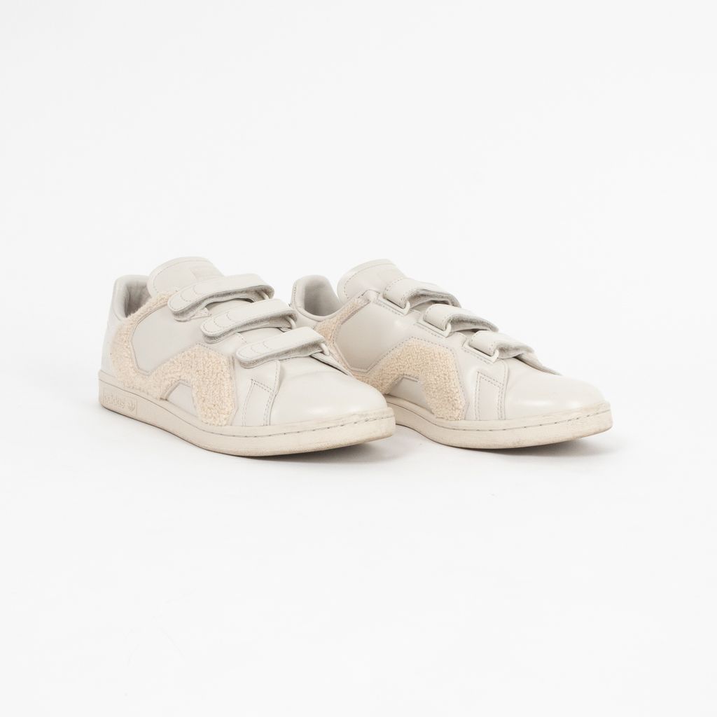 A remixed version Adidas' iconic Stan Smith sneaker, this pair has been designed by Raf Simons and highlights his affinity for Belgian minimalism with a fashionable edge. Features ivory leather body fabrication, rounded toe, set of velcro straps for closure, textured terrycloth panels, and Raf Simons and Adidas logos on shoes near heels.