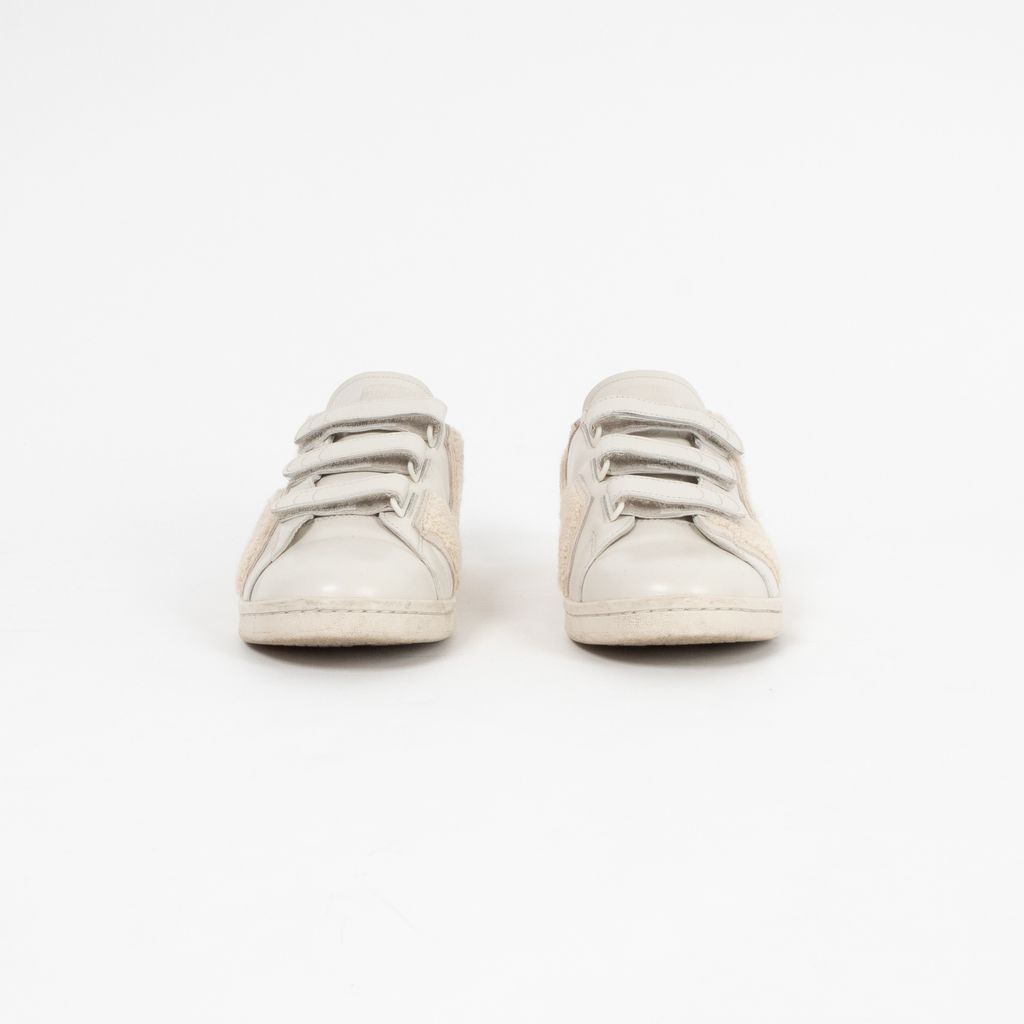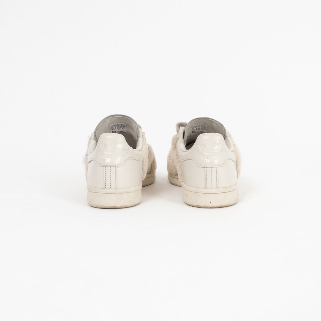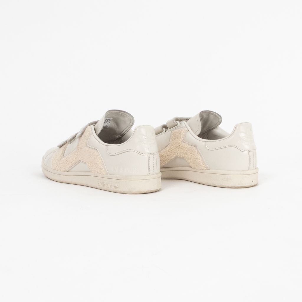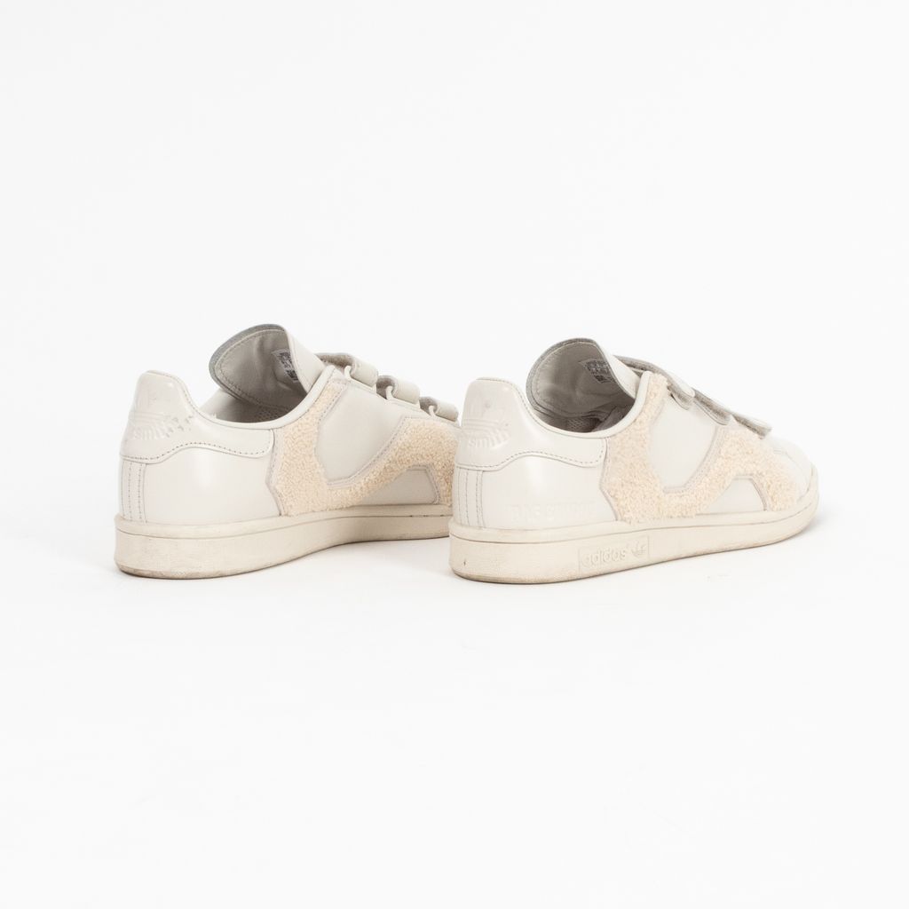 A remixed version Adidas' iconic Stan Smith sneaker, this pair has been designed by Raf Simons and highlights his affinity for Belgian minimalism with a fashionable edge. Features ivory leather body fabrication, rounded toe, set of velcro straps for closure, textured terrycloth panels, and Raf Simons and Adidas logos on shoes near heels.