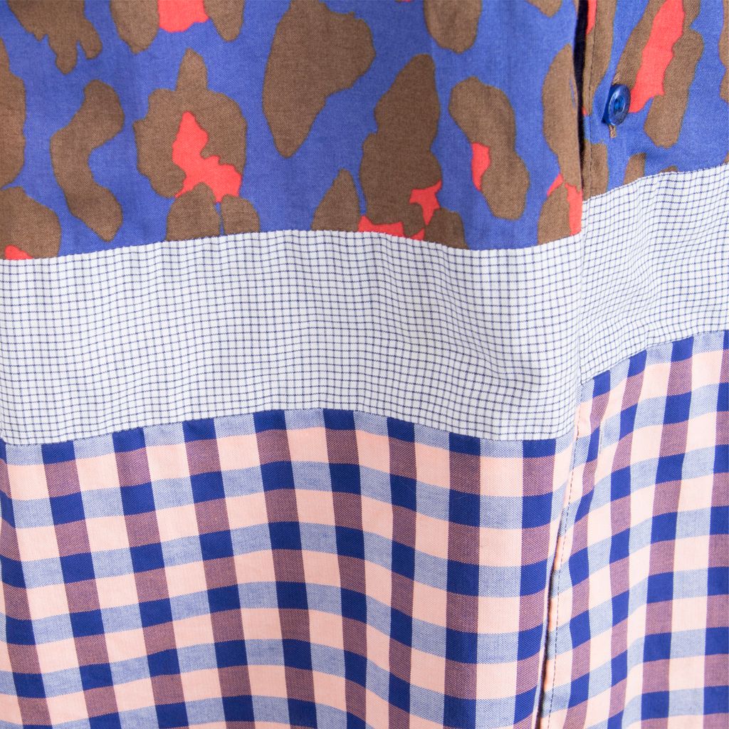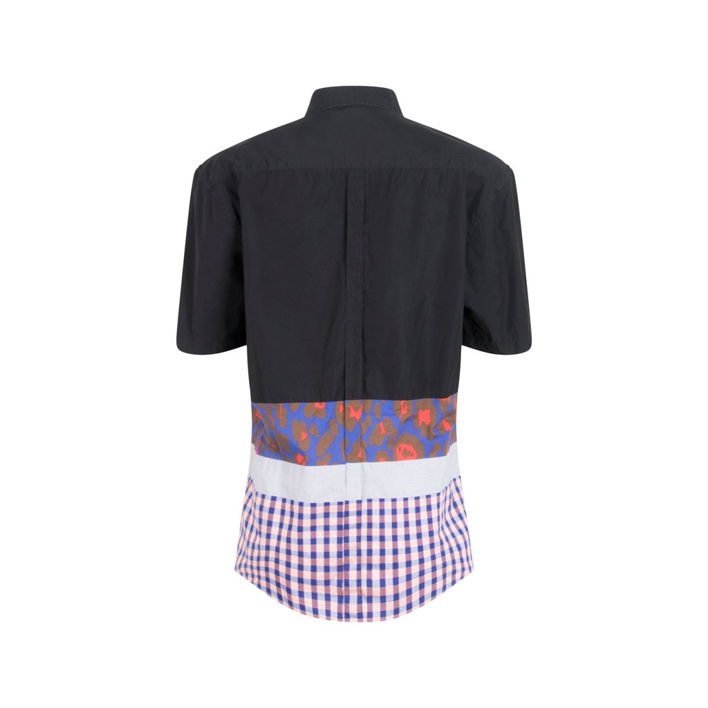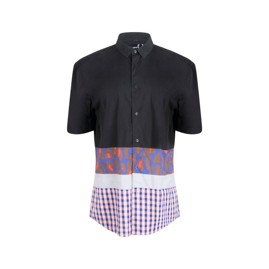 This Raf Simmons and Fred Perry collab button-up shirt features a point collar neckline, functional button-down closure, and contrast fabric detailing. Raf Simmons logo is embroidered on front. Gently worn in good condition.