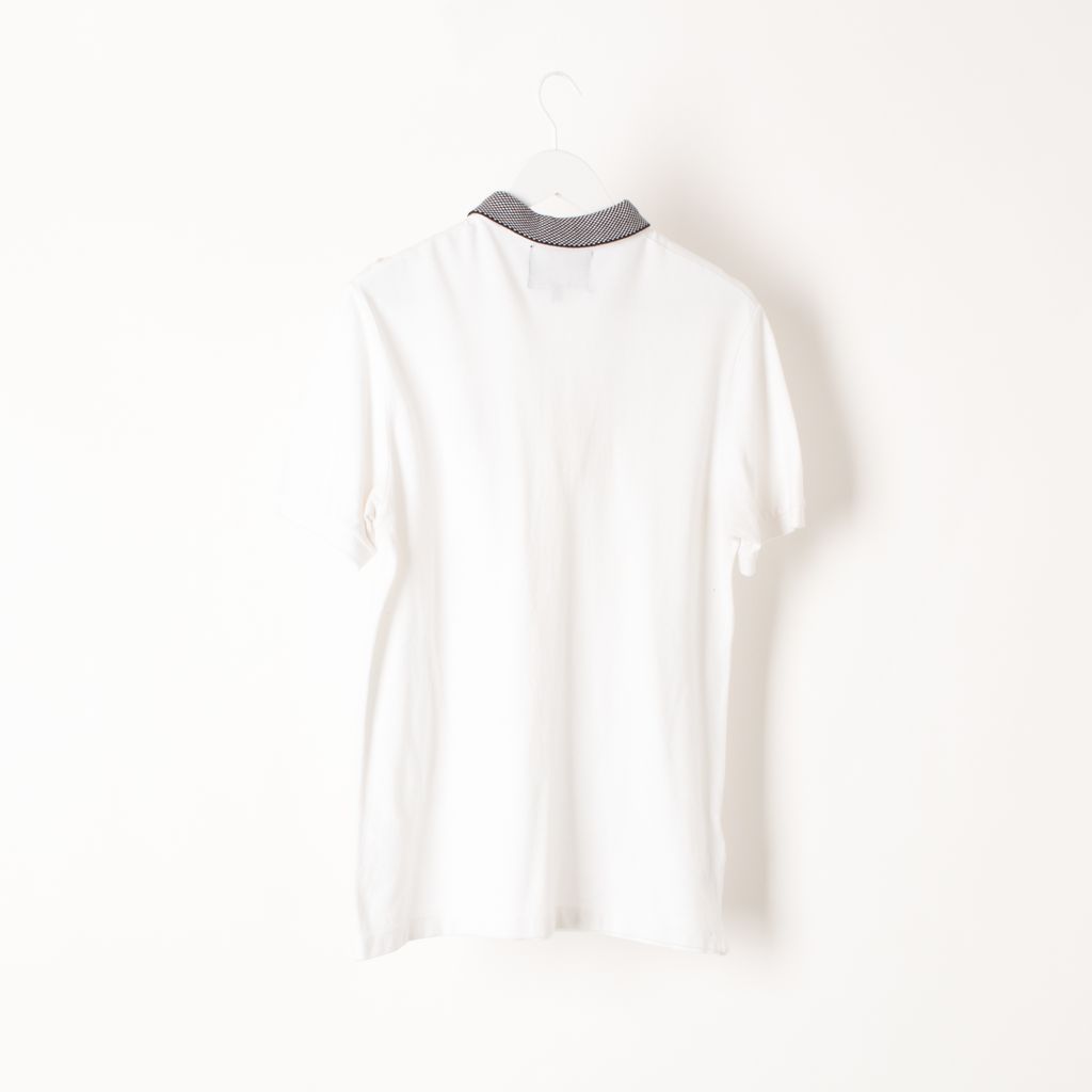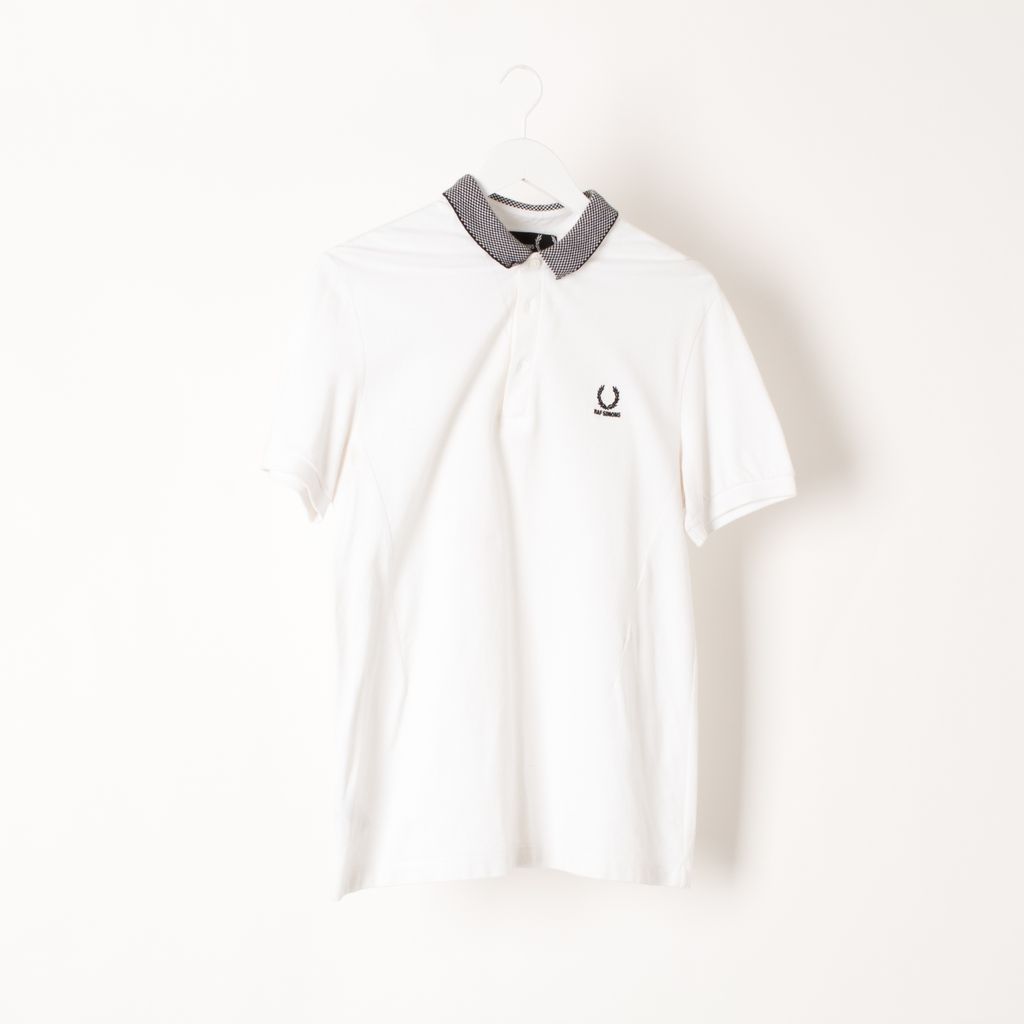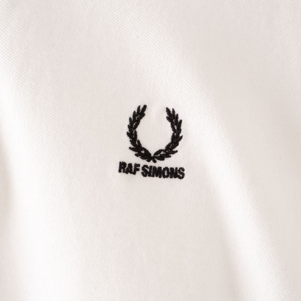 Like new, slim fit checkered polo from Raf Simons x Fred Perry. This reinterpretation of the Fred Perry shirt features tonal buttons and stitching on pique cotton, two front darts, monochrome accent with front chest logo, ribbed cuffs, and a twin needle hem.