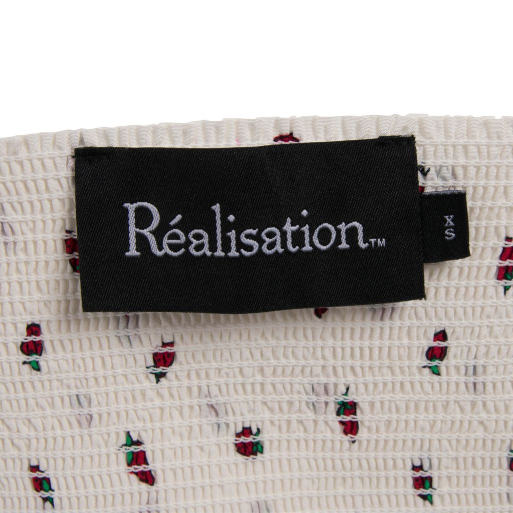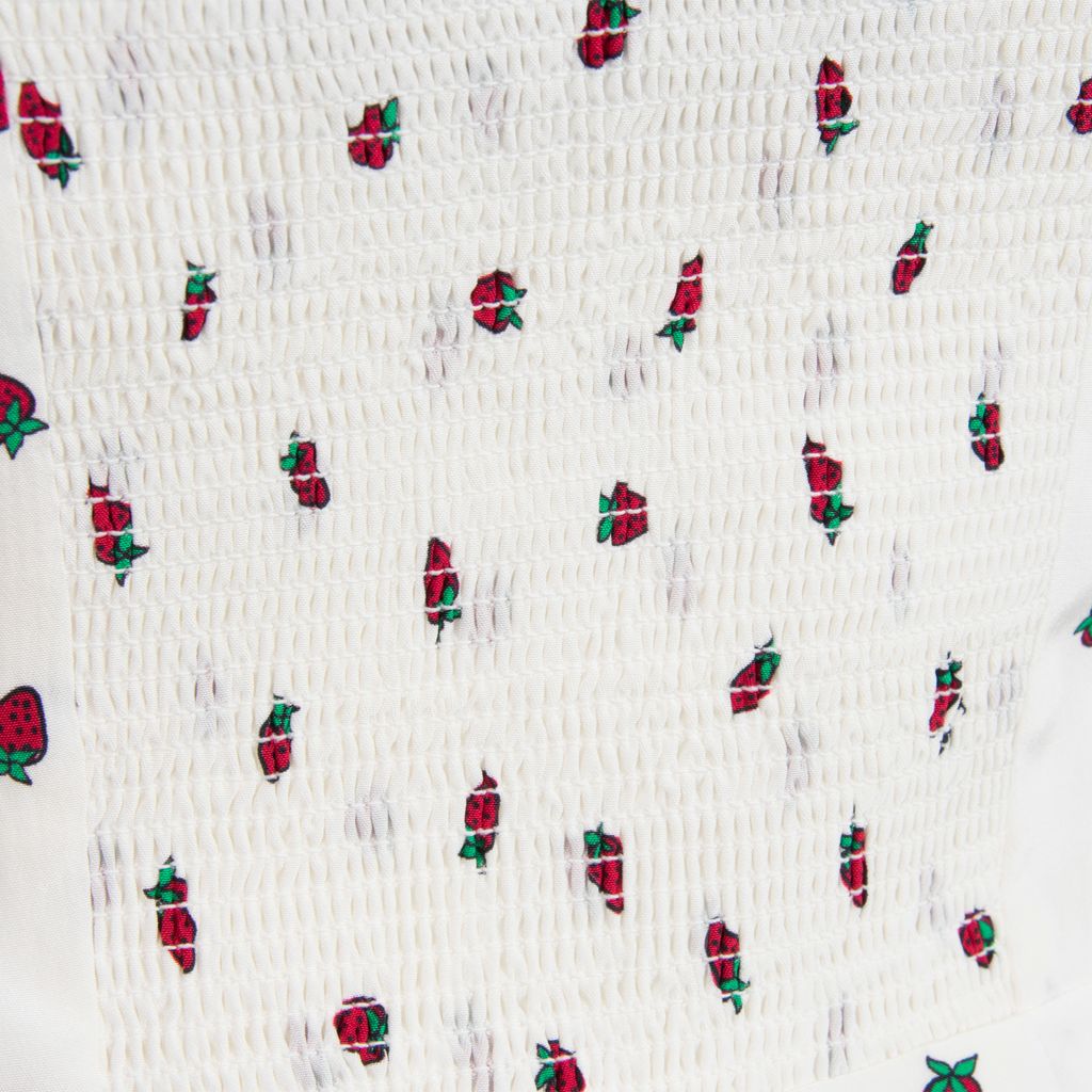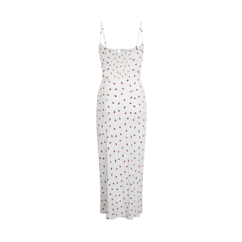 This spring ready dress by Réalisation Par features a lightweight all-over strawberry print fabric, a corset style fitted bodice, adjustable skinny straps, smocked stretch back detail, and has a hidden side-zip closure for easy wear. This dress is not lined and has a mid-length silhouette. In excellent condition.