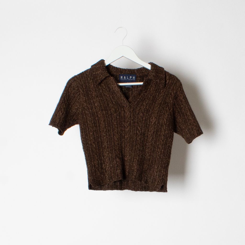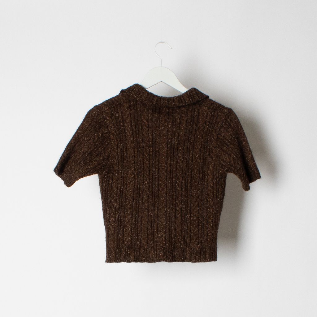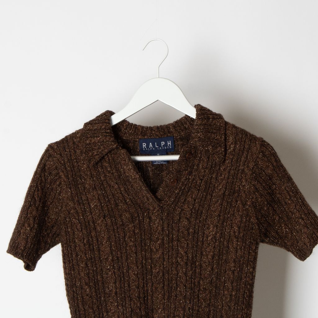In excellent condition, short sleeve sweater from Ralph Lauren. Features cable knit pattern, collar neckline, and 2 buttons at front. 57% silk, 18% acrylic, 13% mohair rabbit, and 12% nylon.