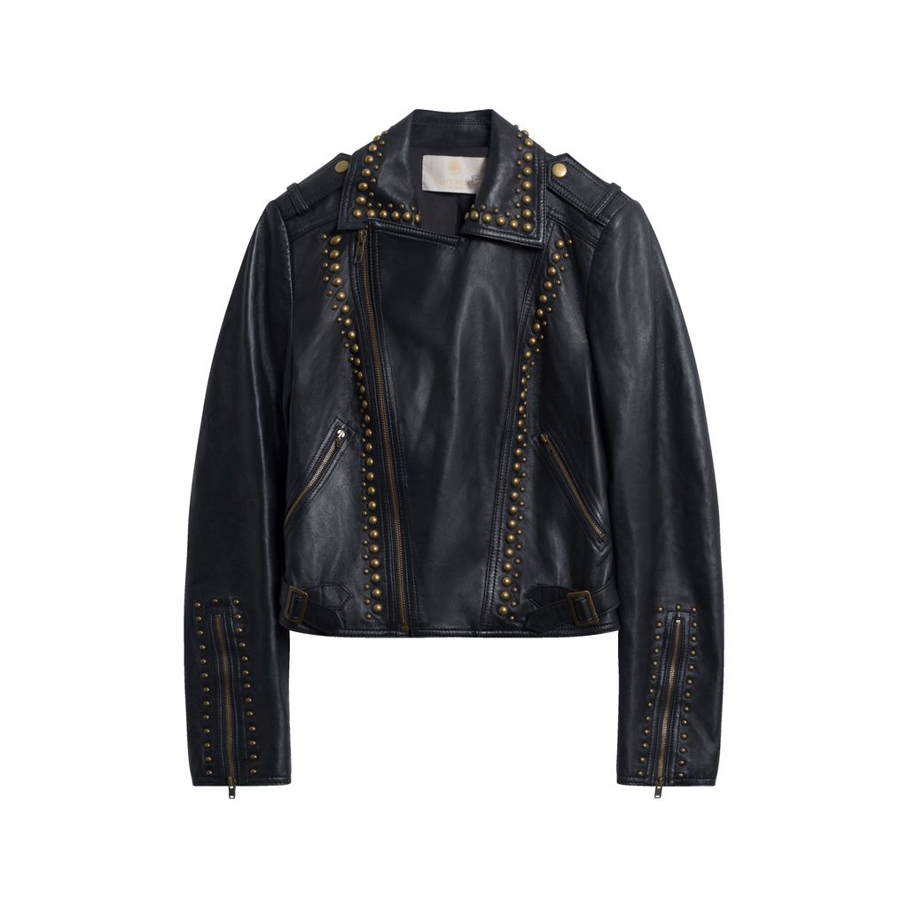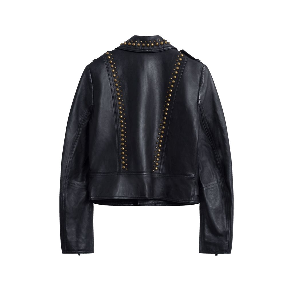 Black lamb leather jacket, with gold studs around the collar, running down the sides, and on both sleeves. Zipper runs down the middle, and partially down both sleeves.