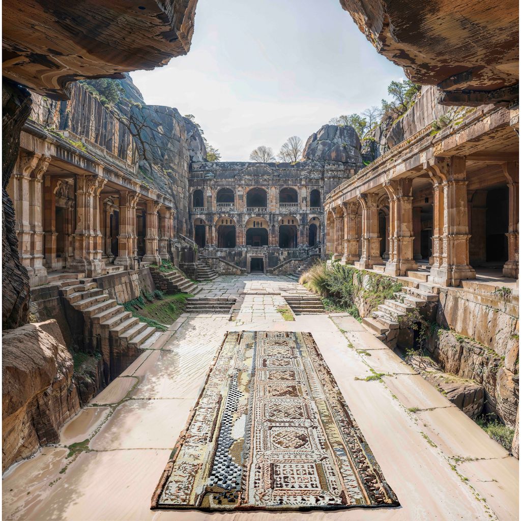 The Rani ki Vav rug draws inspiration from the ancient stepwells of India; historical architectural structures that carry cultural and spiritual significance. Expertly handknotted in Nepal using Himalayan wool, the cotton-silk blend rug references the stepwell built in 1063 by Rani Udayamati to commemorate her husband, Bhimdev I. The stepwell is not a UNESCO's World Heritage site.