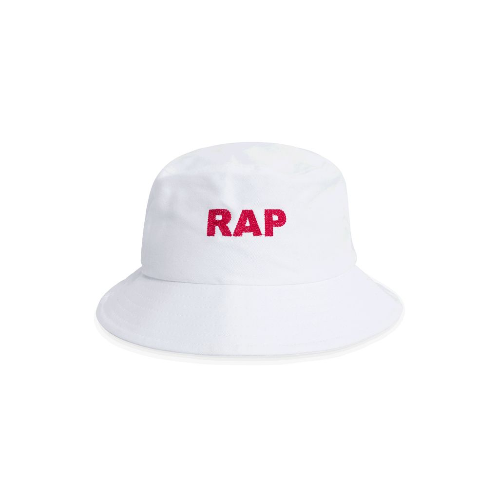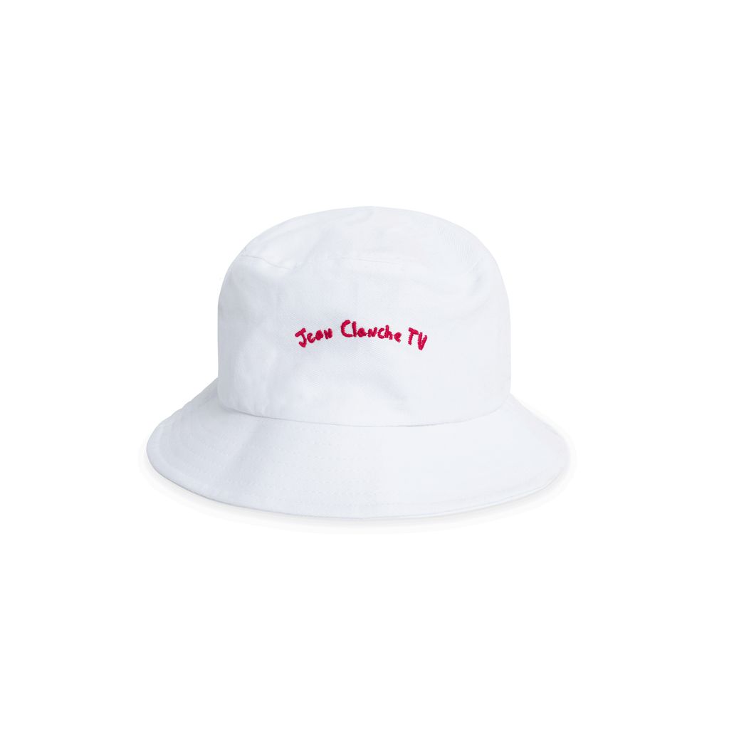 This white bucket hat features embroidered Rap text, and the Jean Clanche TV logo in the back.