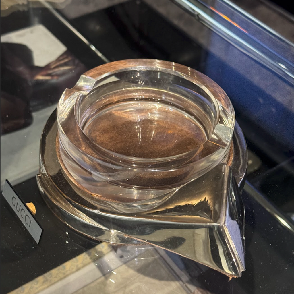 This striking ashtray by Gucci features a nickel-bronze body beautifully finished in the brand’s signature “nail-head” motif, paired with a thick, clear glass dish insert. A bold mid-century object of luxury lifestyle design, blending Gucci’s Italian craftsmanship with sculptural detail and functional purpose.