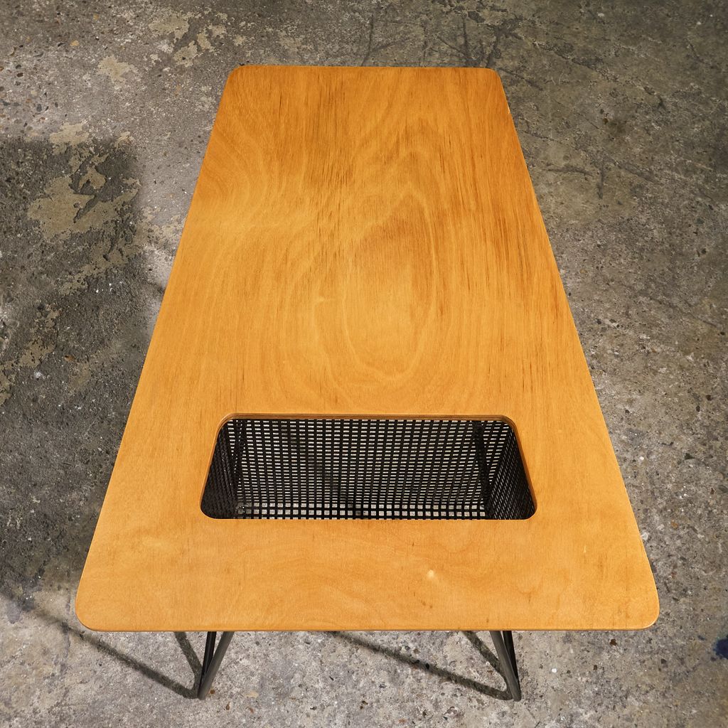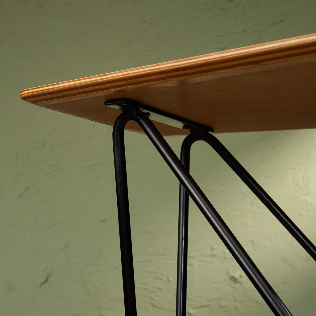 The surface of this side table has recently received a restoration and has been refinished, brining back the vivid wood grain of the birch plywood. It only shows minor signs of age and use. The metal base remains in it's original condition with signs of use and wear which is in line with the age of the table.