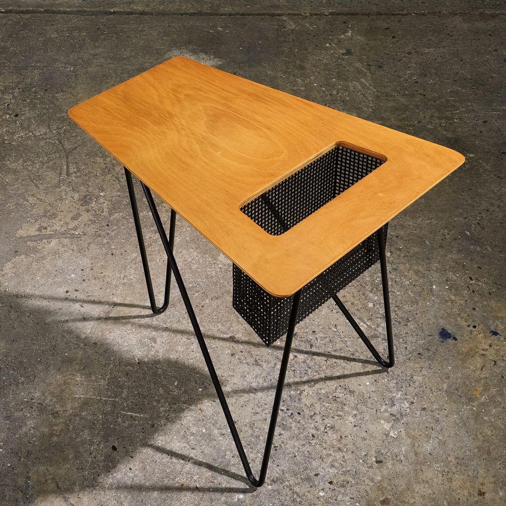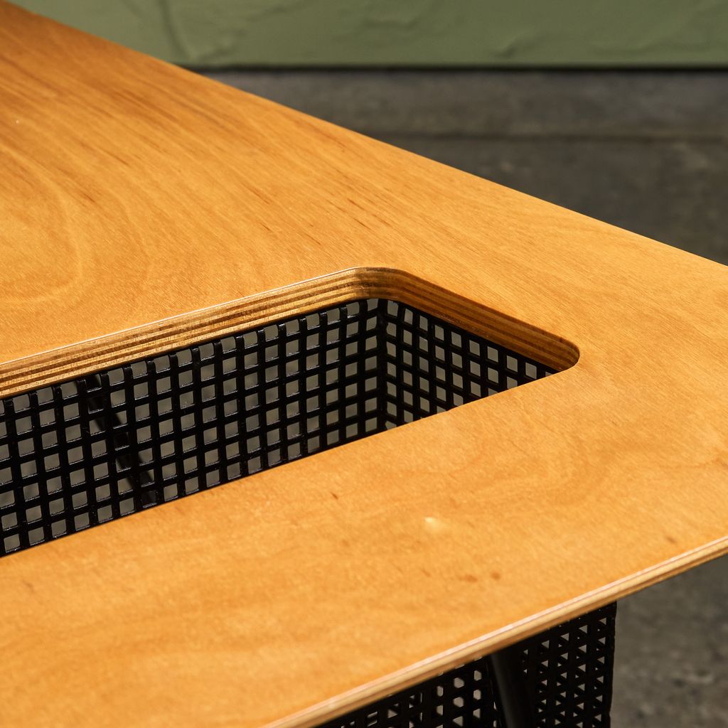 Braakman developed plywood forming techniques after study visits to the United States, where mass-production methods influenced his approach at Pastoe. The TM series introduced lightweight tables that could be moved and used in different parts of the home, aligning with changing domestic layouts in the 1950s. The surface of the TM03 features a perforated metal section, providing a convenient spot to store magazines and books, a detail that is both functional and playful. Original examples are documented in Pastoe catalogues from the early 1950s and were produced in limited runs compared with larger case pieces, contributing to their presence in museum and private collections today.