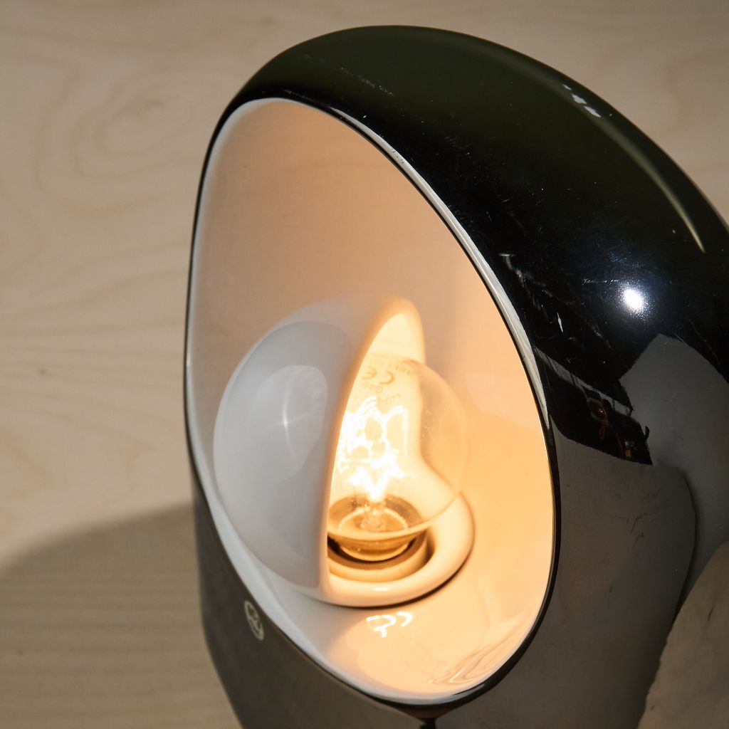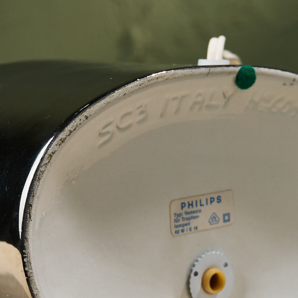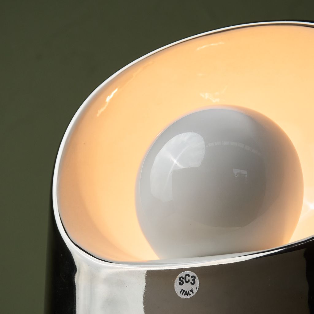 Designed by Marcello Cuneo, the 'Venezia' table lamp was manufuctured by SC3 for Phillips and produced in the 1970s. The lamp uses a ceramic body with a rotating aperture around the bulb. The opening can be adjusted steplessly to control the direction of the light. The Venezia series was designed as a functional lighting object with a mechanism that allows both direct and indirect illumination. Philips manufactured lighting products for domestic and commercial use and distributed them through international retail and design markets during the twentieth century. This specific version was manufactured by SC3 for Phillips in Italy.