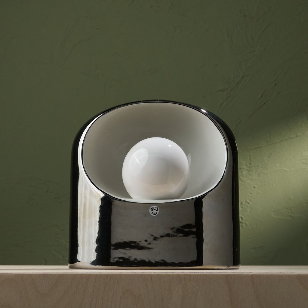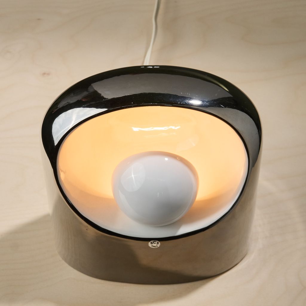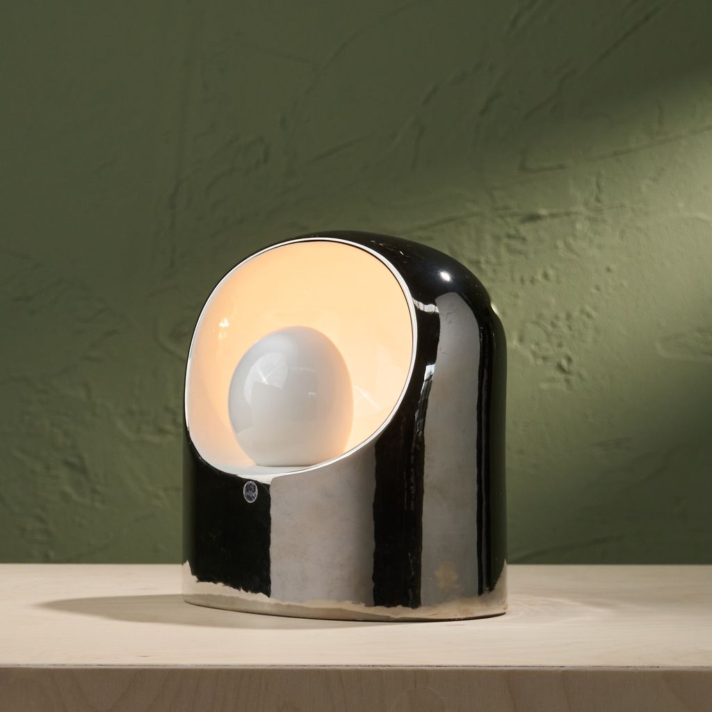 Designed by Marcello Cuneo, the 'Venezia' table lamp was manufuctured by SC3 for Phillips and produced in the 1970s. The lamp uses a ceramic body with a rotating aperture around the bulb. The opening can be adjusted steplessly to control the direction of the light. The Venezia series was designed as a functional lighting object with a mechanism that allows both direct and indirect illumination. Philips manufactured lighting products for domestic and commercial use and distributed them through international retail and design markets during the twentieth century. This specific version was manufactured by SC3 for Phillips in Italy.