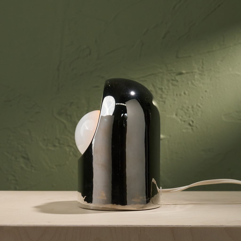 The silver surface shows very minor signs of use and age consistent with the age of the object. On the top section of the silver part there are some small white spots that originate from the glazing process. These marks are part of the original finish. The lamp remains in good vintage condition and the lighting function operates as intended.
