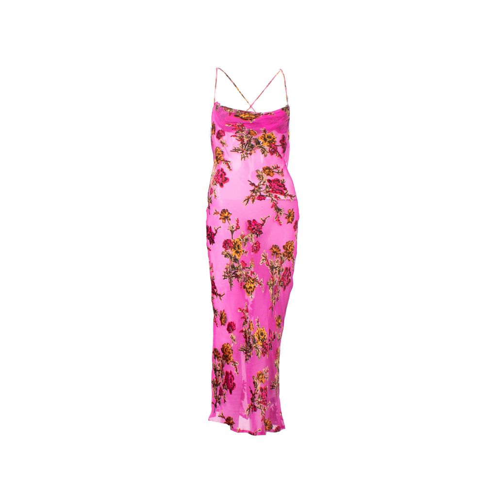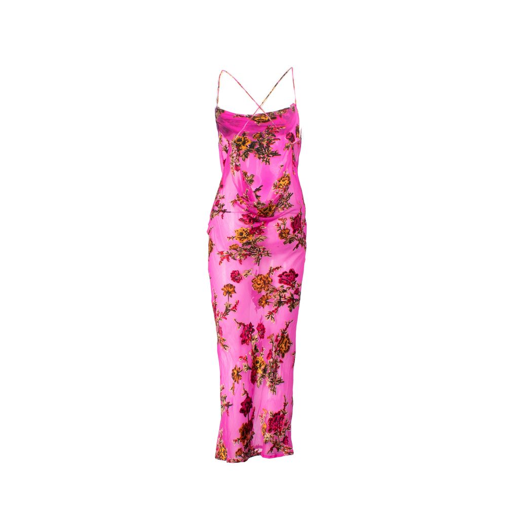 Like a hot pink hued and body hugging flower, this sultry midi dress from Rat & Boa is the perfect way to beat the summer heat. Features all over flocked floral print, weighted cowl back, fold over cowl neck, and crossback straps.